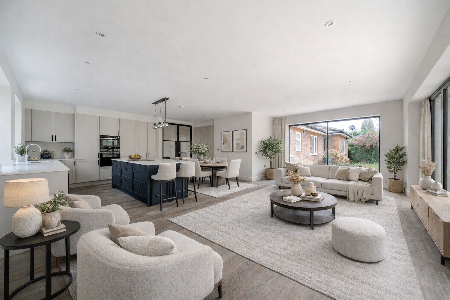 The sense of space is immediately apparent, with wide internal openings, excellent ceiling heights and an abundance of natural light. The centrepiece of the home is the striking open-plan kitchen, dining and living area, designed for modern lifestyles and effortless entertaining. The kitchen itself is sleek and stylish, complemented by premium finishes including Siemens appliances, 2 fridges and a wine fridge, a breakfast cupboard and a Quooker tap, all centred around a substantial island, while Crittall-style internal doors provide a subtle architectural divide when desired. A separate formal reception room offers a calm and inviting space for relaxing away from the main living area.