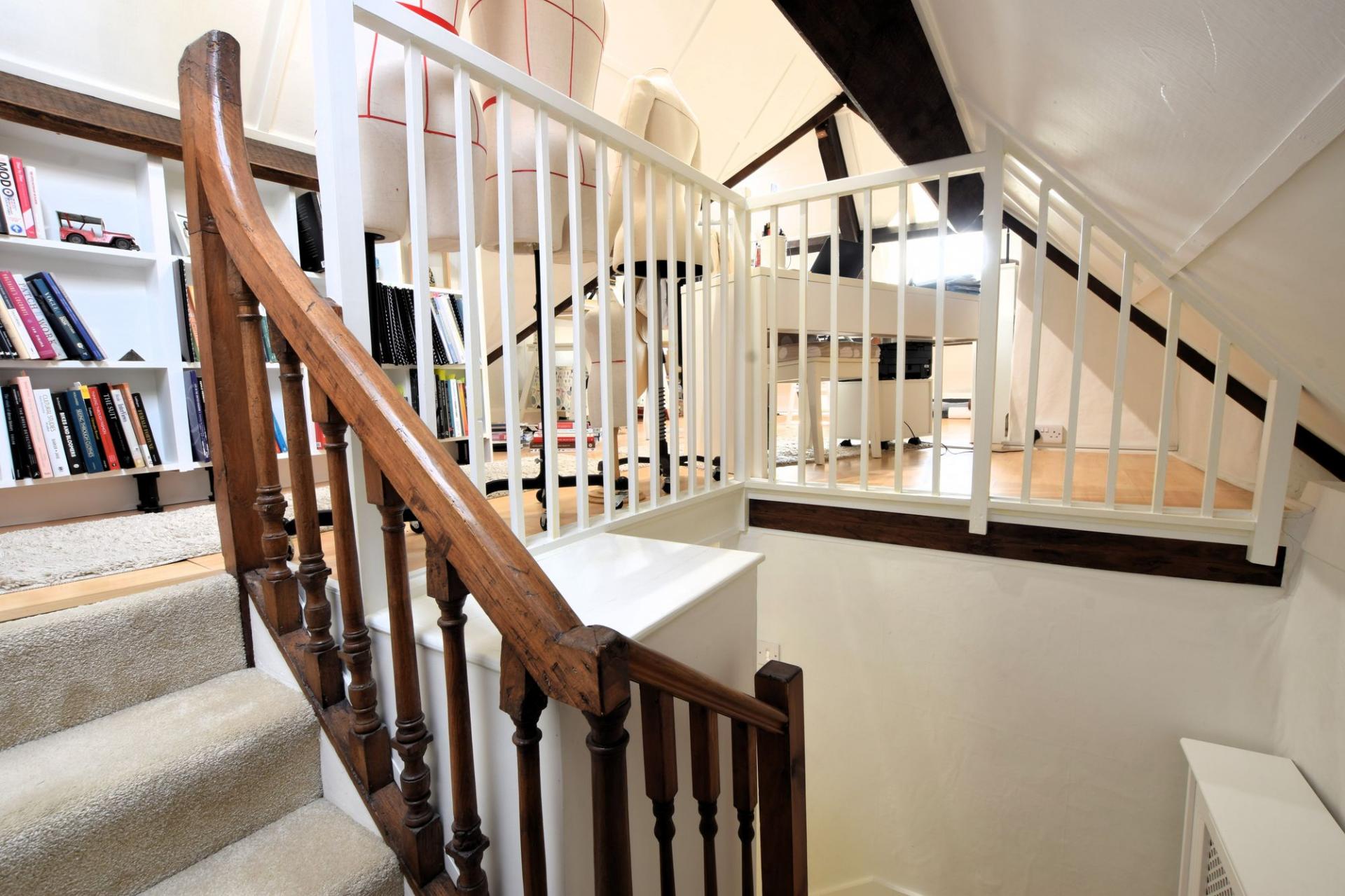 On the first floor, the main bedroom includes built-in wardrobes and window seats, while a further double bedroom sits across the landing. The current owners have introduced a fresh, tastefully updated family bathroom, enhancing the home’s comfort without compromising its character. The second floor offers another double bedroom with attractive exposed beams.