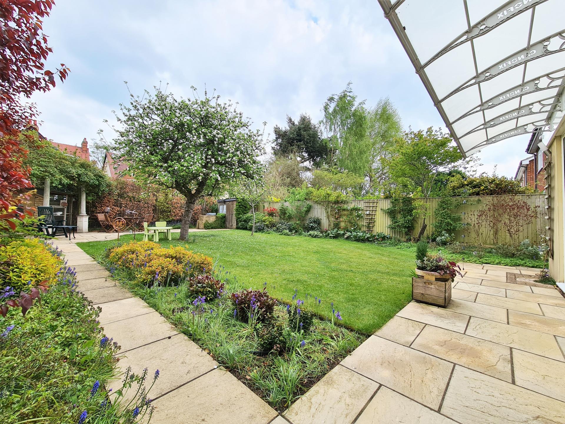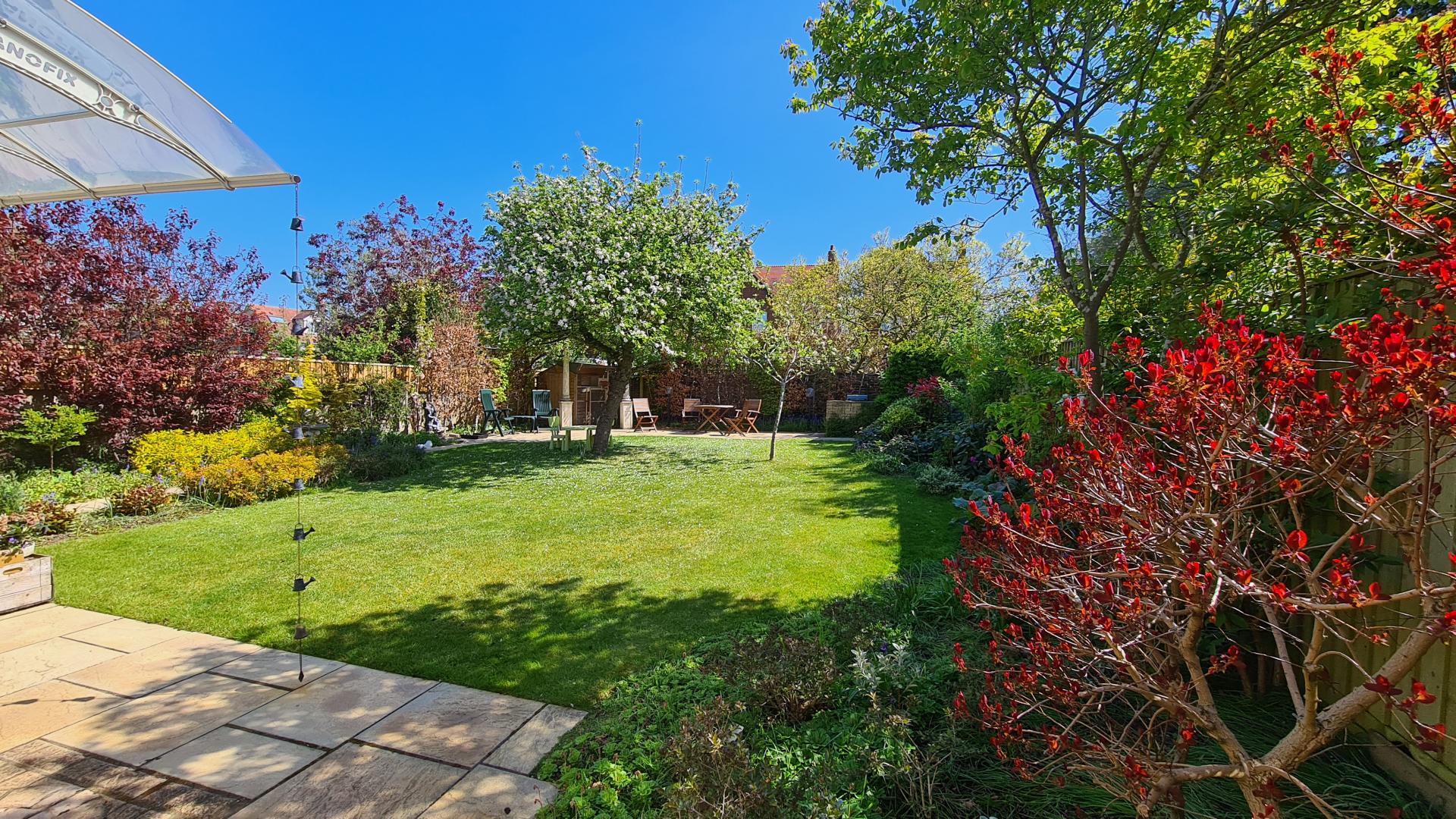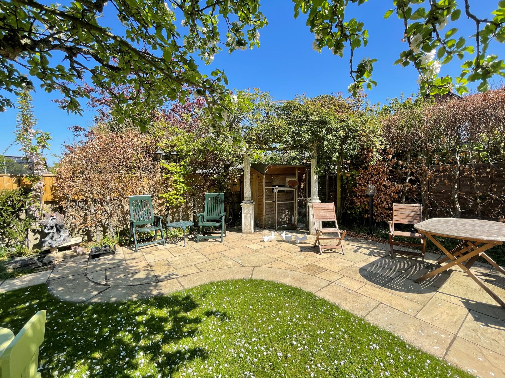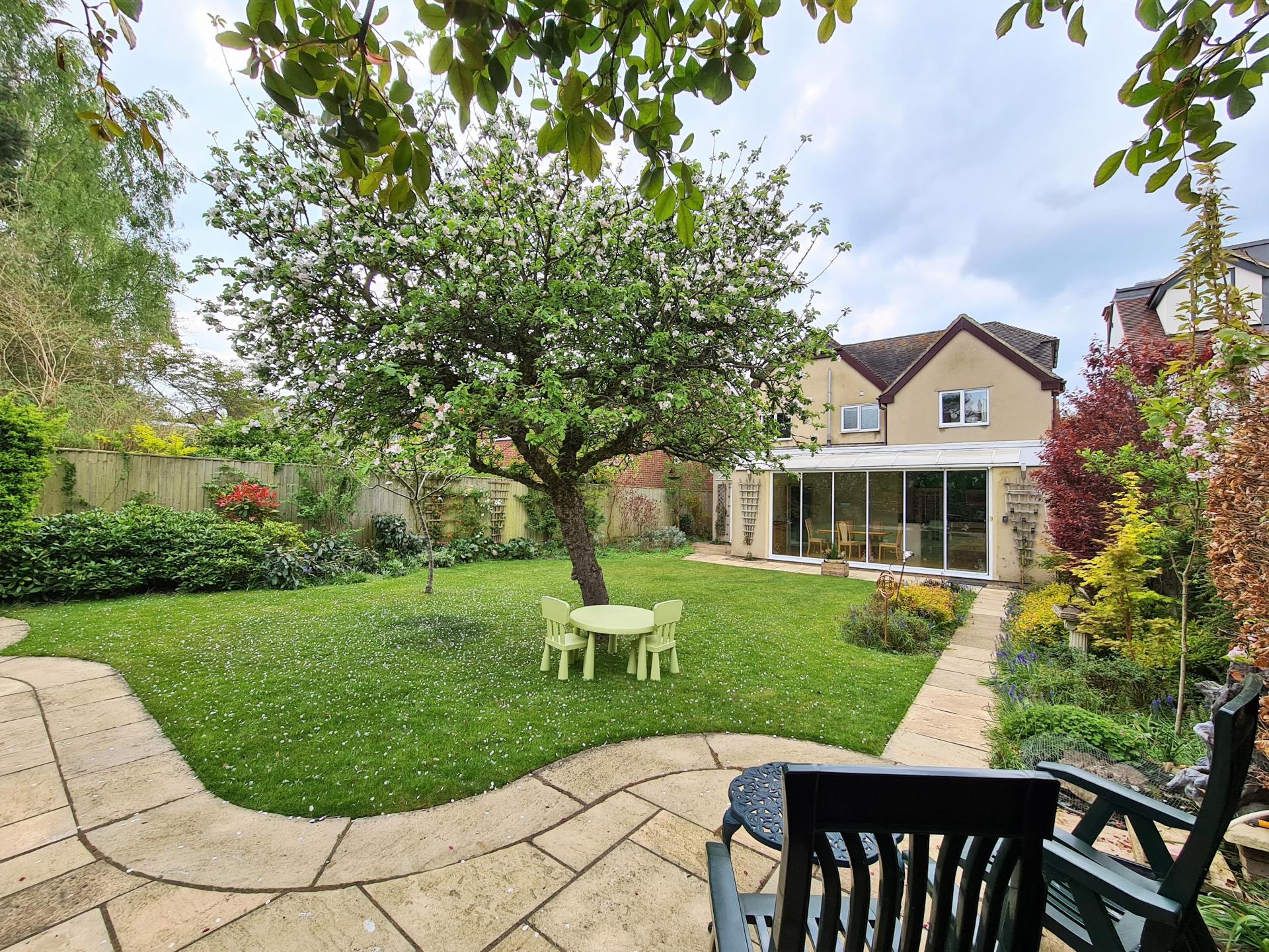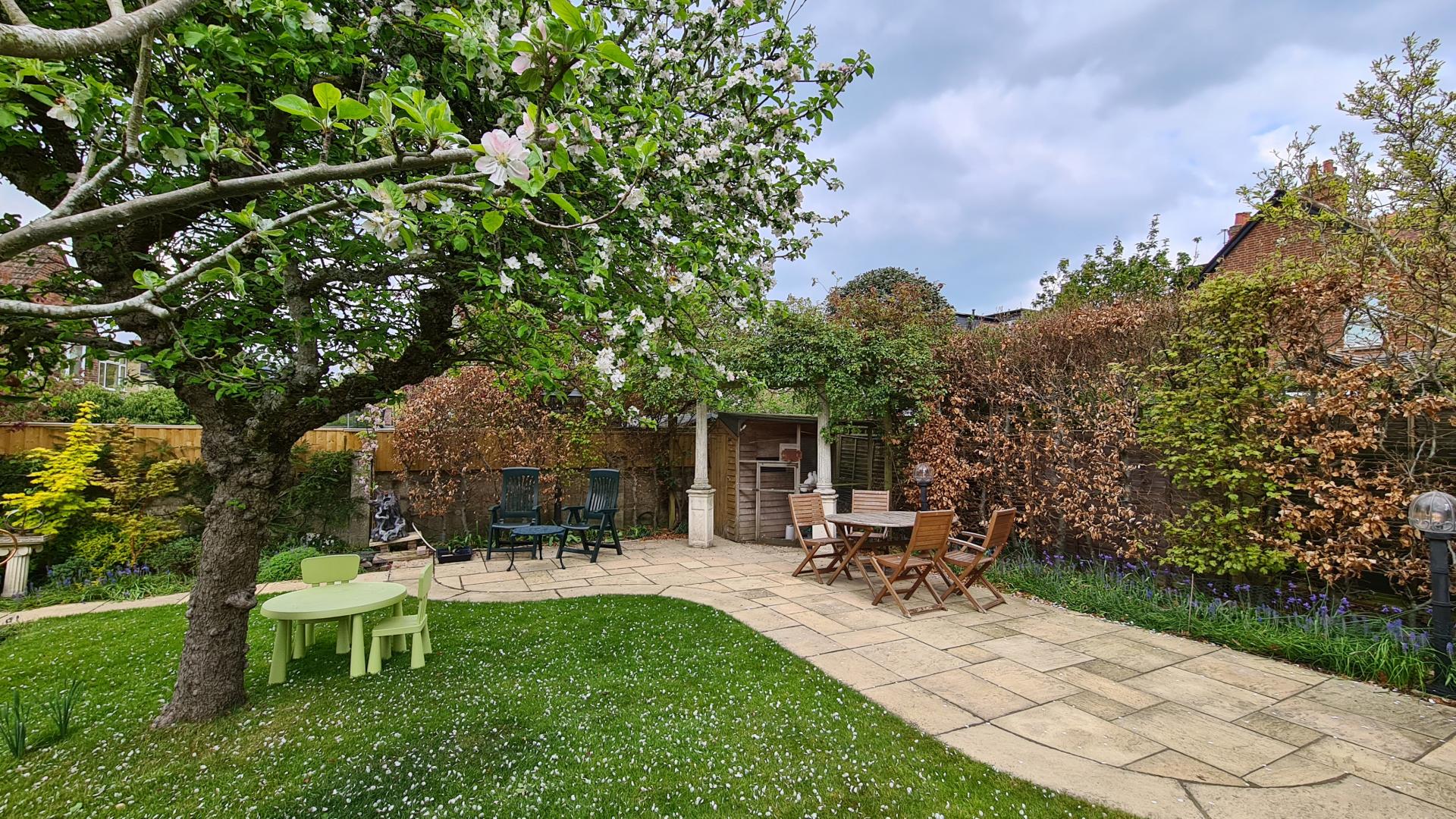 The mature rear garden is laid out around a large central lawn and likewise showcases a careful planting scheme chosen for colour, texture and scent. The focal point is a beautiful 100-year-old Bramley apple tree that still delivers a heavy crop of fruit in season. There are several seating areas that catch the sun at different times of day, including a pergola surrounded by three varieties of scented climbing rose that flower in succession through the summer. A small pond provides additional interest and a haven for wildlife.