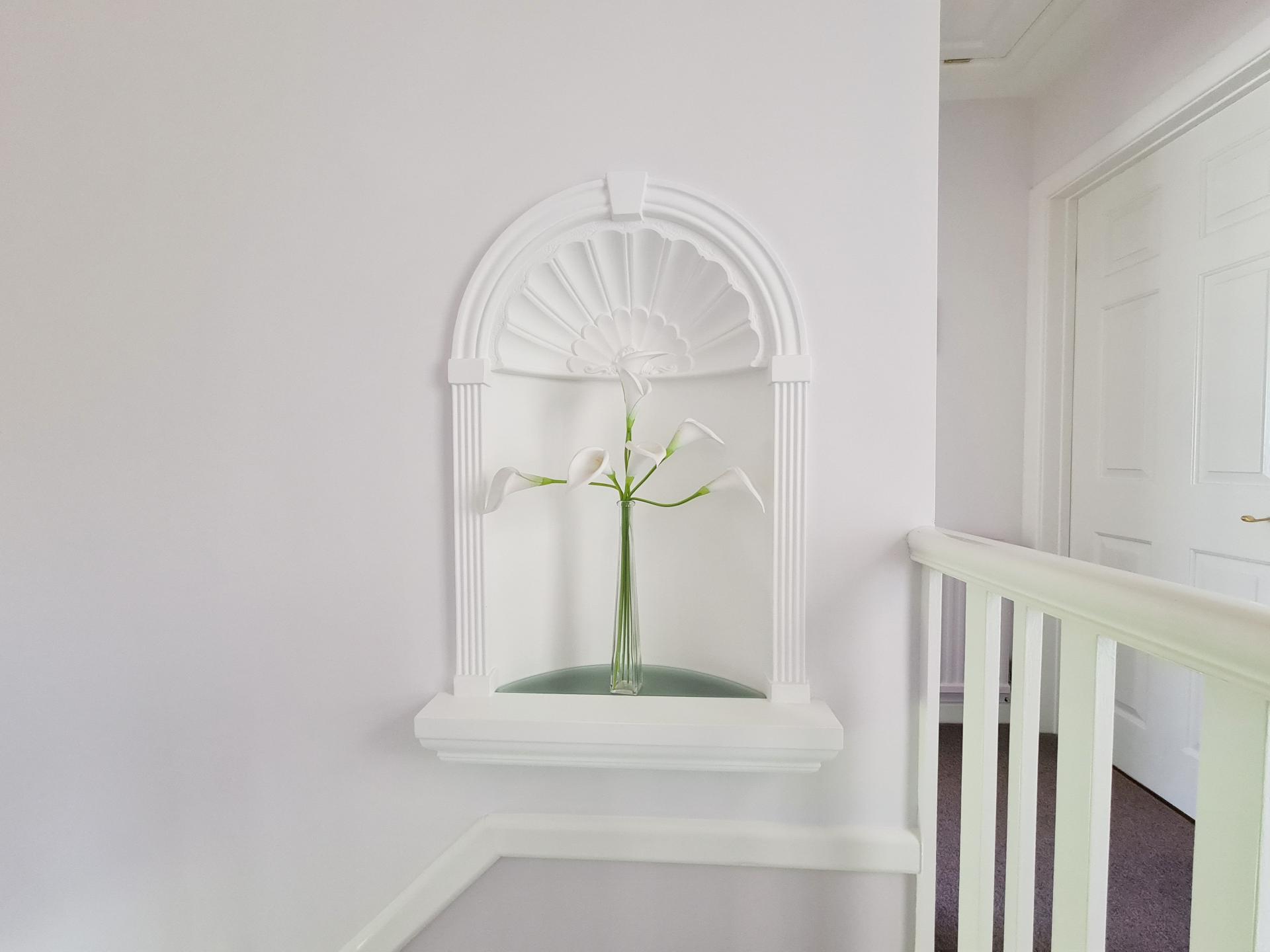 To the front of the house are twin paved driveways separated by a central bee-friendly area of planting bordered by a hedge of old English lavender. The centrepiece is a weeping rose underplanted by scented geraniums, within which are embedded crocus, grape hyacinths, narcissus, tulips, and gladioli. The approach to the house is thus a continually changing display of colour and fragrance.
