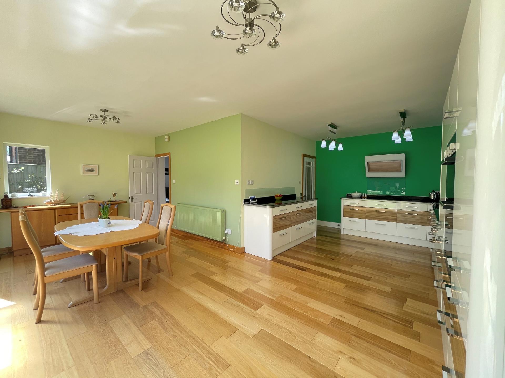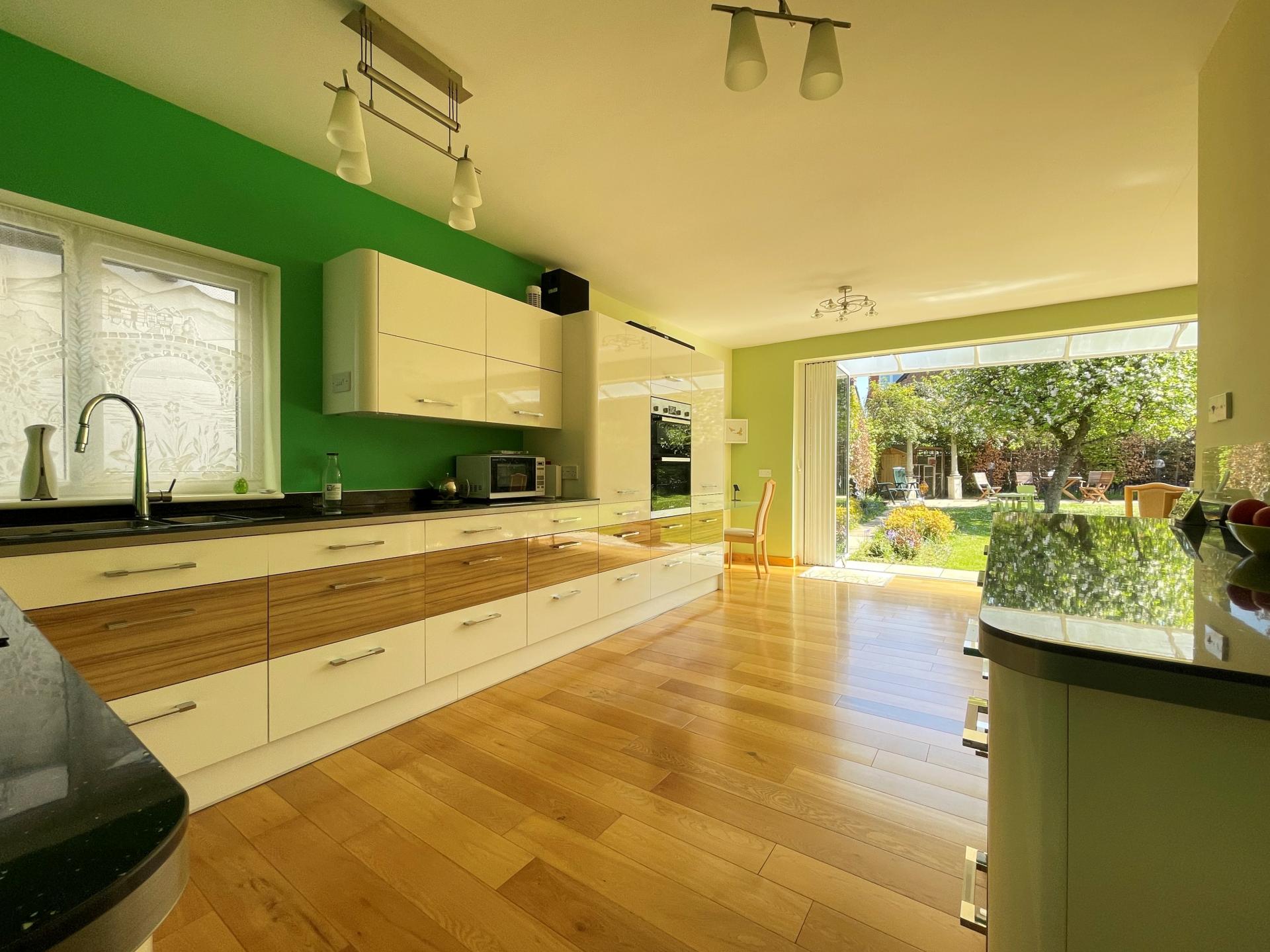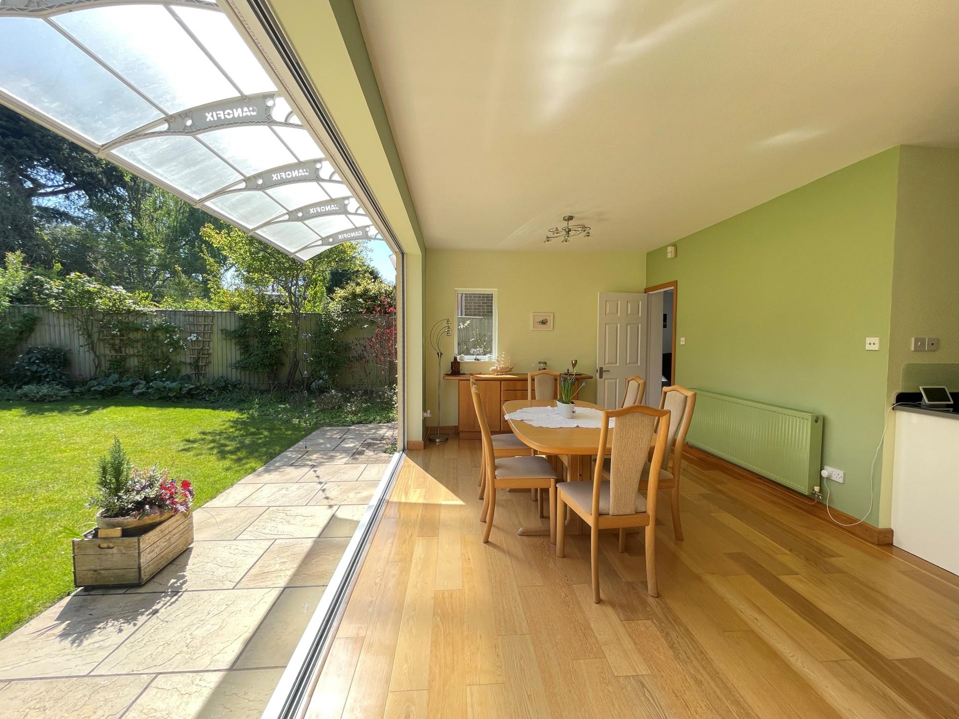 At the heart of the property is the stunning kitchen/dining room with feature ‘glass wall’ array of folding/sliding doors that open on to the beautiful and secluded rear garden. A glazed canopy above offers protection from the elements and allows for the doors to remain open even when it rains. The adjoining sitting room also features slide and fold doors which provide separate access to the garden, while at the front of the house there is an additional family recreation room, currently utilised as a pilates/dance studio and tv/games room. A separate utility room and cloakroom complete the ground floor accommodation.