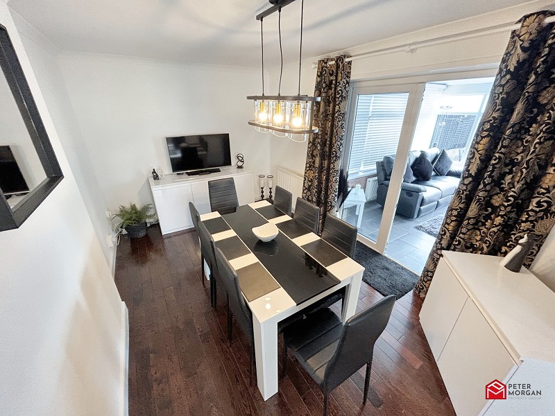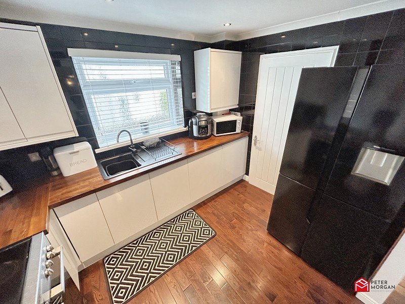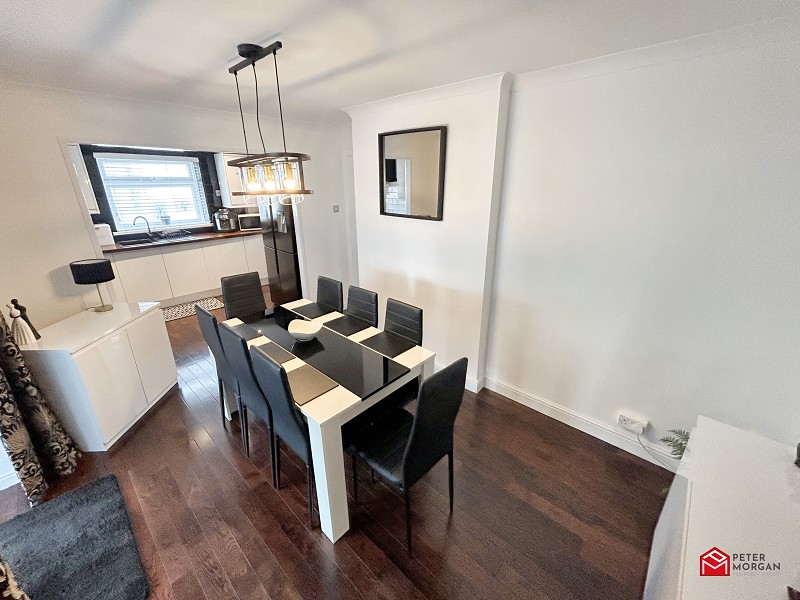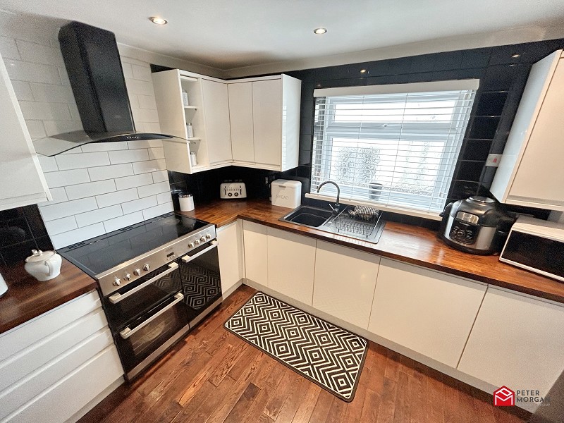 UPVC double glazed window. Fitted kitchen with a range of white high gloss wall and floor cupboards with contrasting wood effect worktops. Wood flooring. Space for range cooker. Sink with drainer. Spotlights to ceiling. Space for dining table and chairs. Decorative light fitting. UPVC double glazed doors to conservatory.