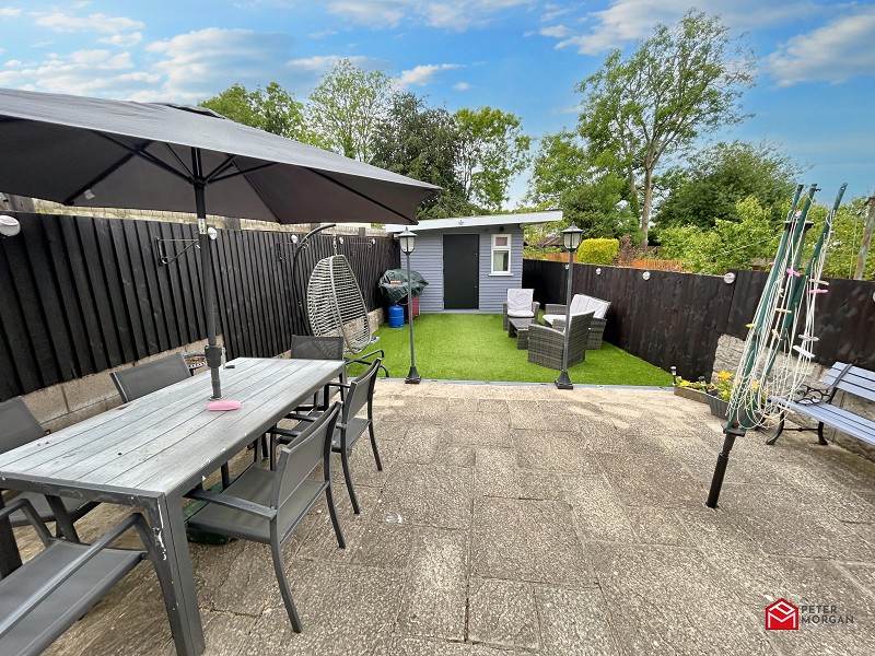 Enclosed rear garden with patio leading area of astro-turf. Outhouse with power and lighting.