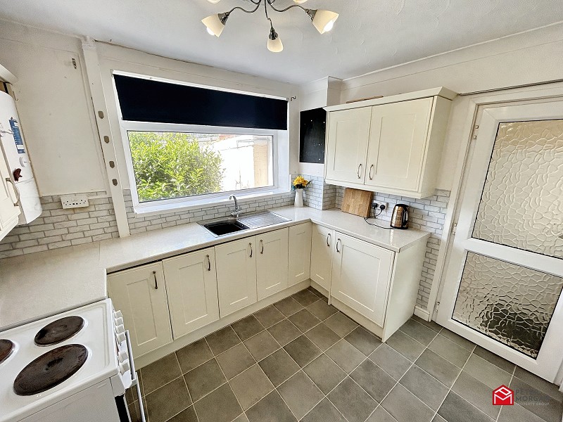 UPVC double glazed window. Fitted kitchen with a range of wall and floor cupbaords with contrasting work tops. Tile effect flooring. Access to dining room.
