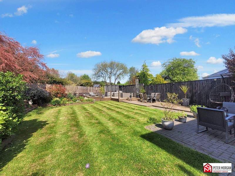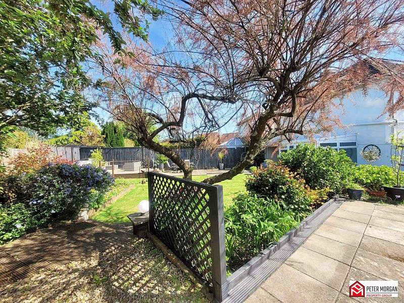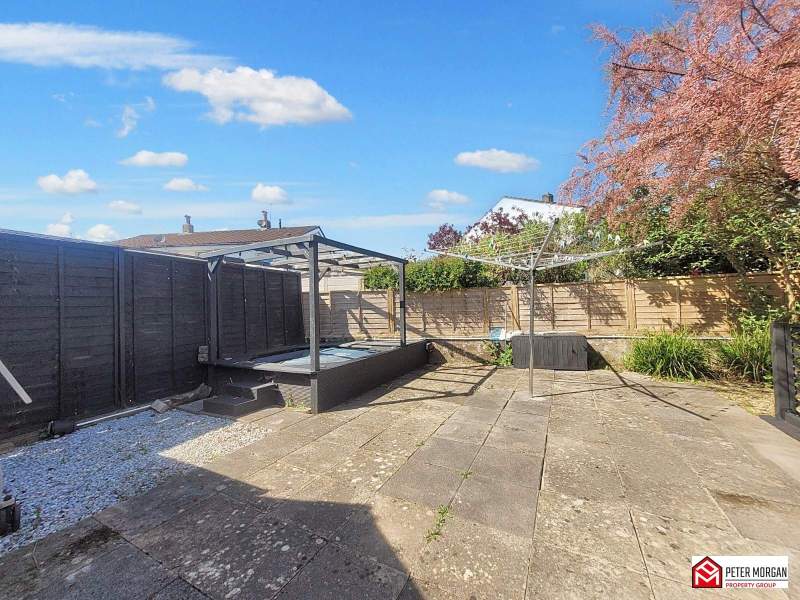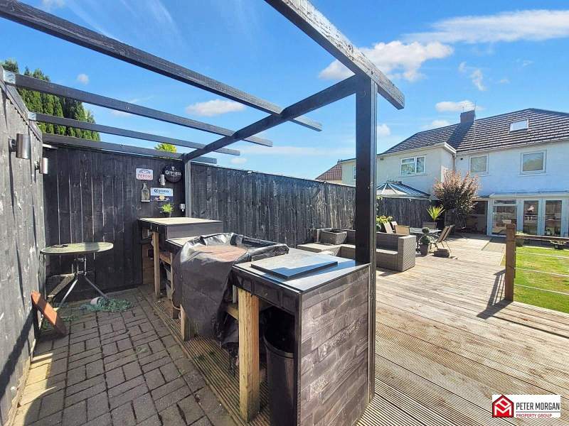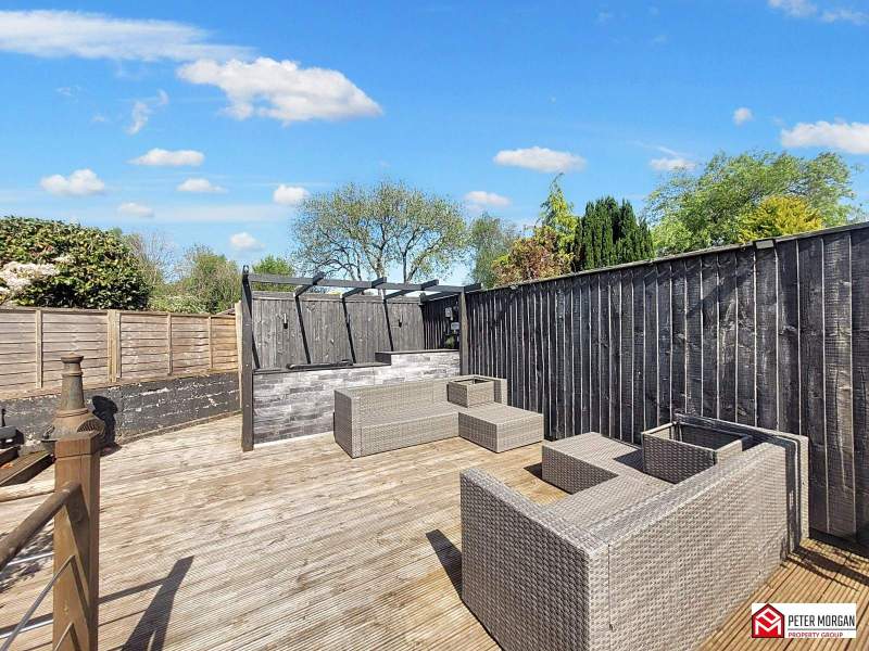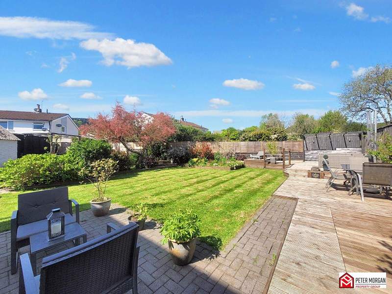 Enclosed North easterly facing rear garden overlooking Llantrisant golf club from first floor. Areas of lawn and decking with inset hot tub and timber pergola. Additional decking and timber pergola. Range of mature shrubs and plants.