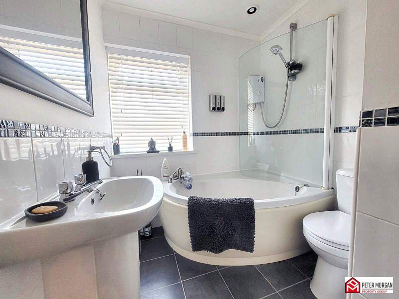 uPVC double glazed window. Fitted bathroom suite comprising corner bath with main shower, WC, and wash hand basin. Wall mounted glass shower screen. Tiled flooring.