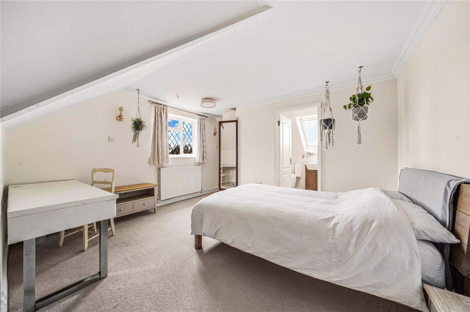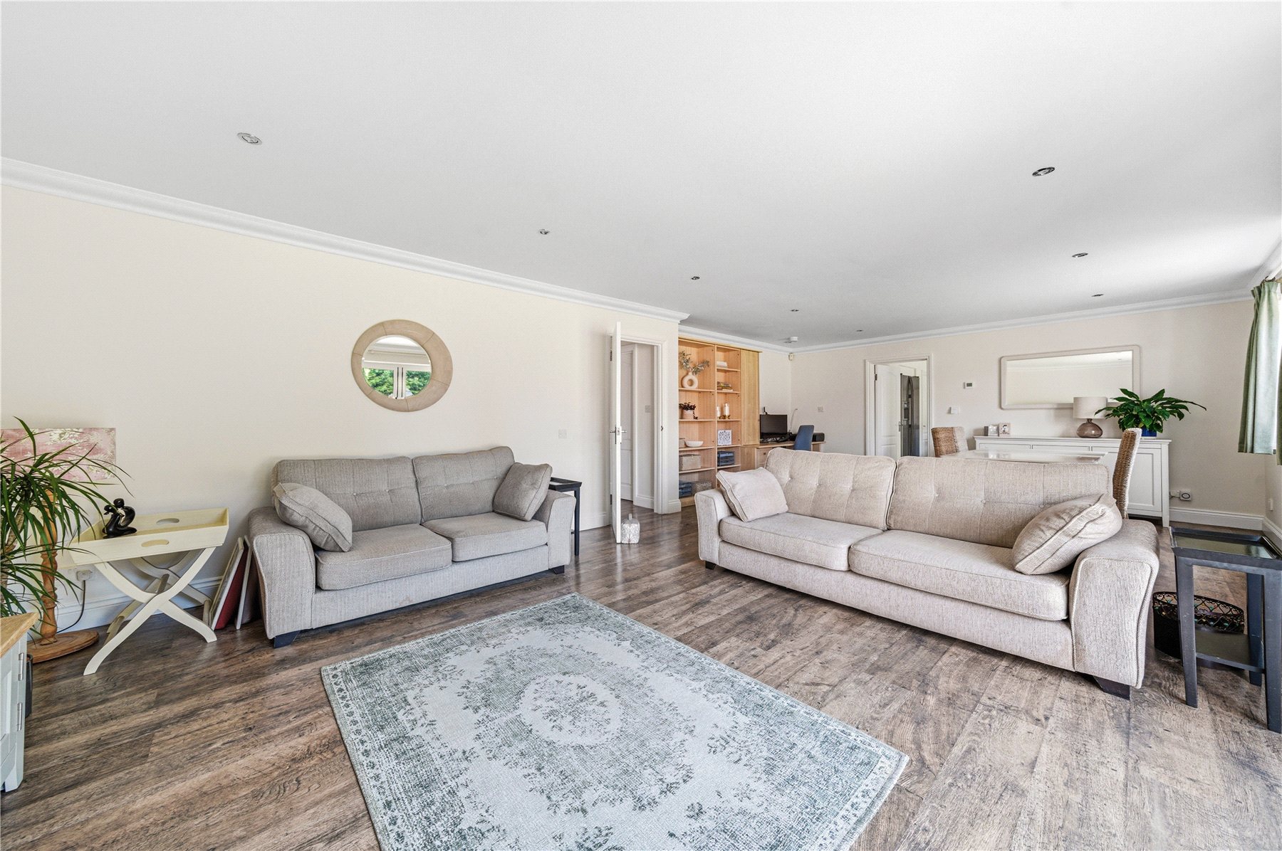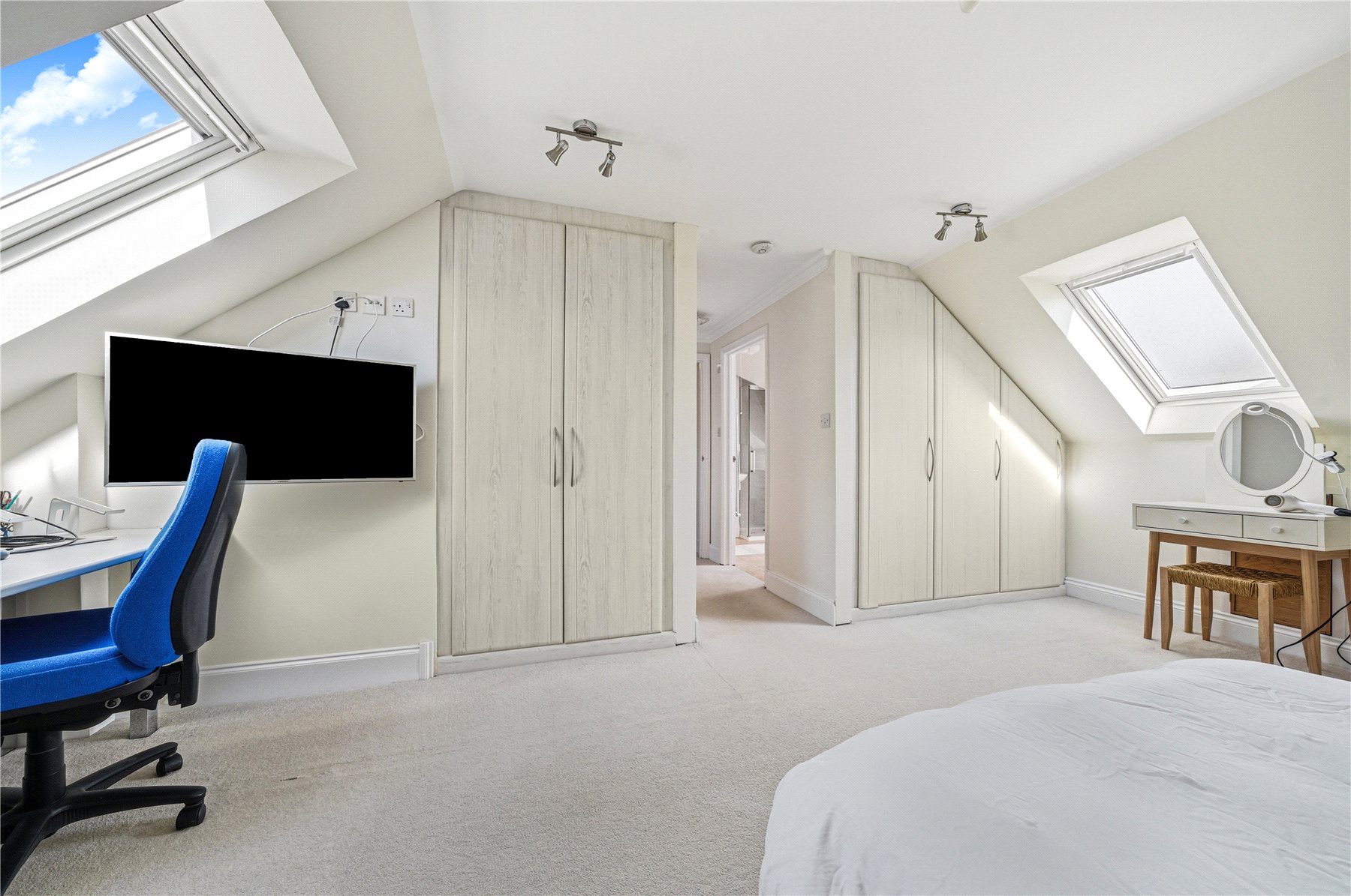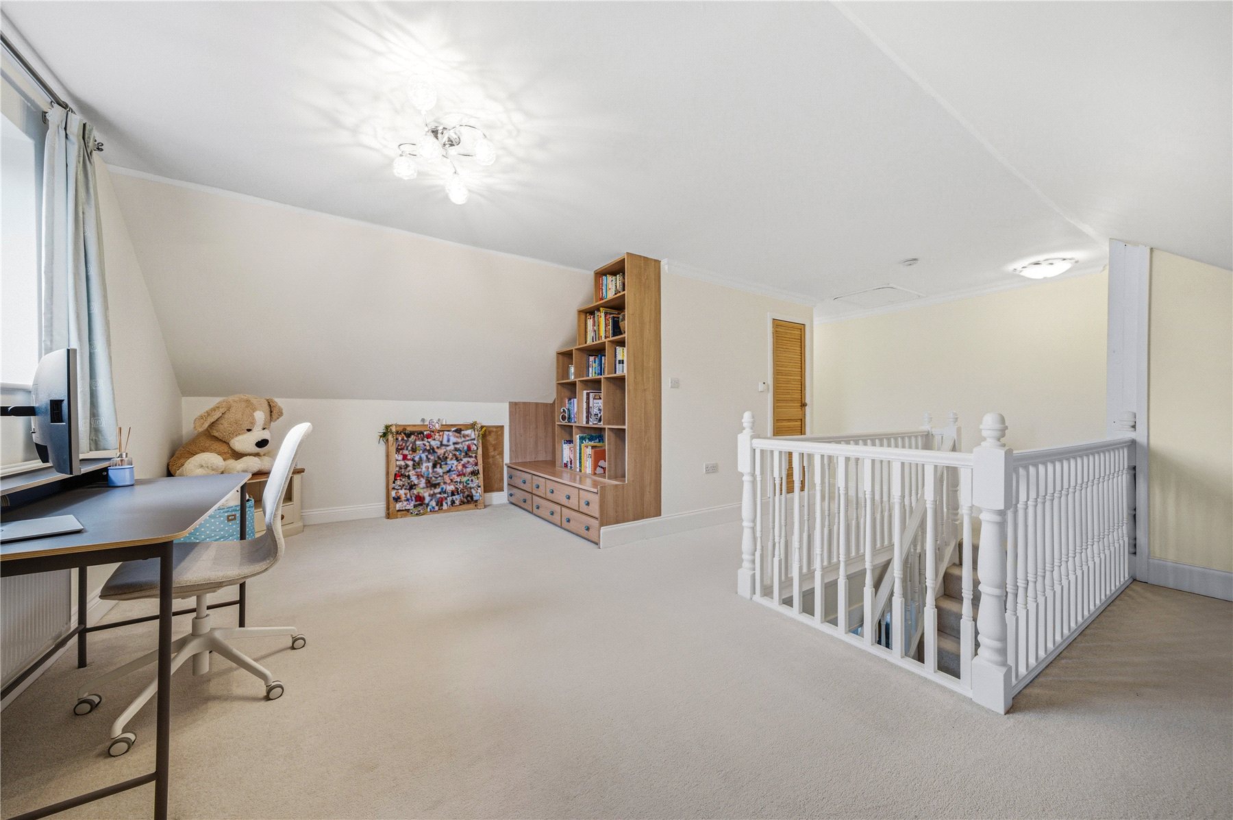 Thoughtfully designed to combine space, light and flexibility, the property provides up to five bedrooms across two floors. The first floor hosts two outstanding double bedrooms, including a truly impressive principal suite. Bathed in natural light from twin Velux windows, this elegant retreat features extensive built-in wardrobes and a luxurious ensuite shower room. The second bedroom on this level is equally well-proportioned and benefits from a stunning four-piece ensuite, complete with a freestanding double-ended bath and separate walk-in shower. A standout feature of the upper floor is the expansive landing area, currently utilised as a stylish home office and informal family space.