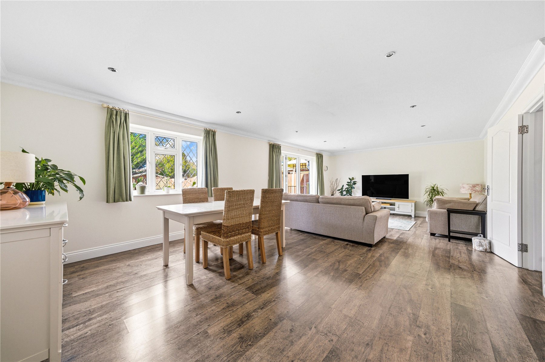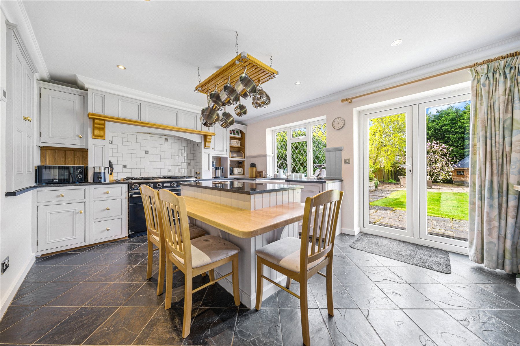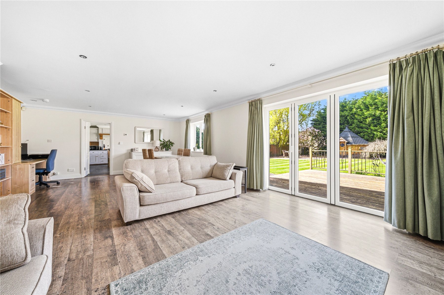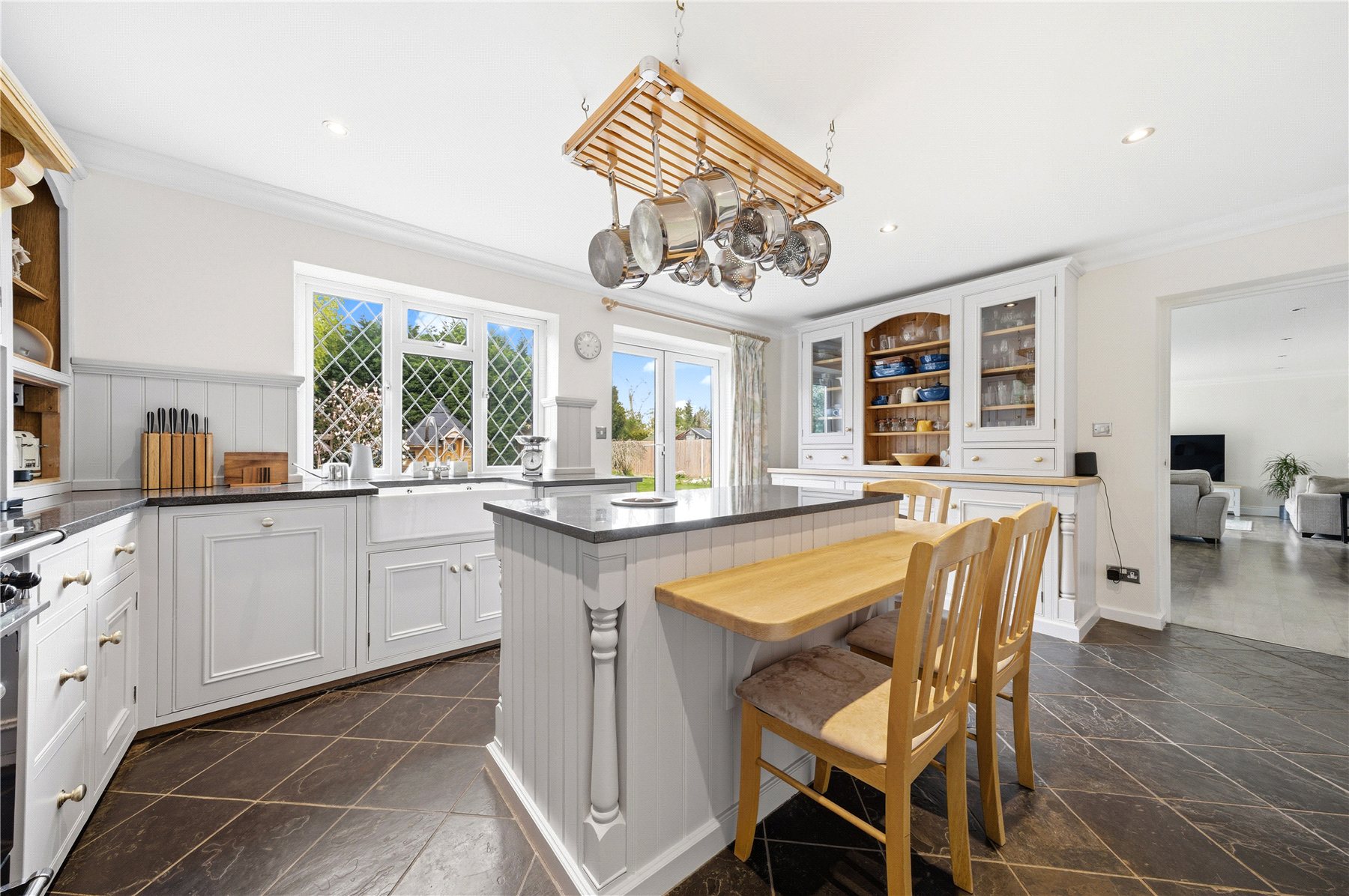 To the rear, the home opens into a magnificent living/dining space, perfectly designed for both relaxed living and sophisticated entertaining. Bi-folding doors seamlessly connect the interior to an elevated decking area, creating a wonderful indoor-outdoor flow. The adjoining bespoke kitchen is a true focal point, crafted in a charming cottage style and fitted with an extensive range of cabinetry, granite work surfaces, a classic butler sink and space for a range cooker. A central island provides additional preparation space and an inviting area for casual dining.