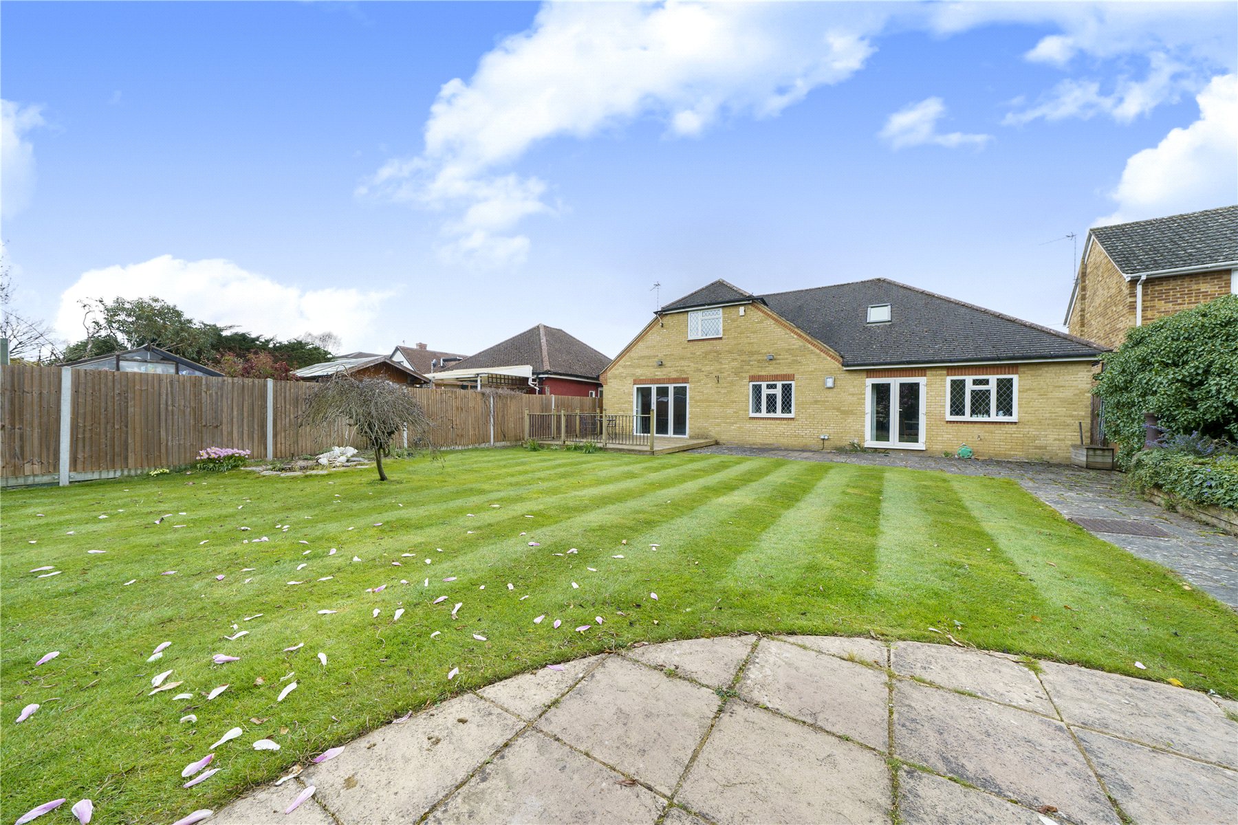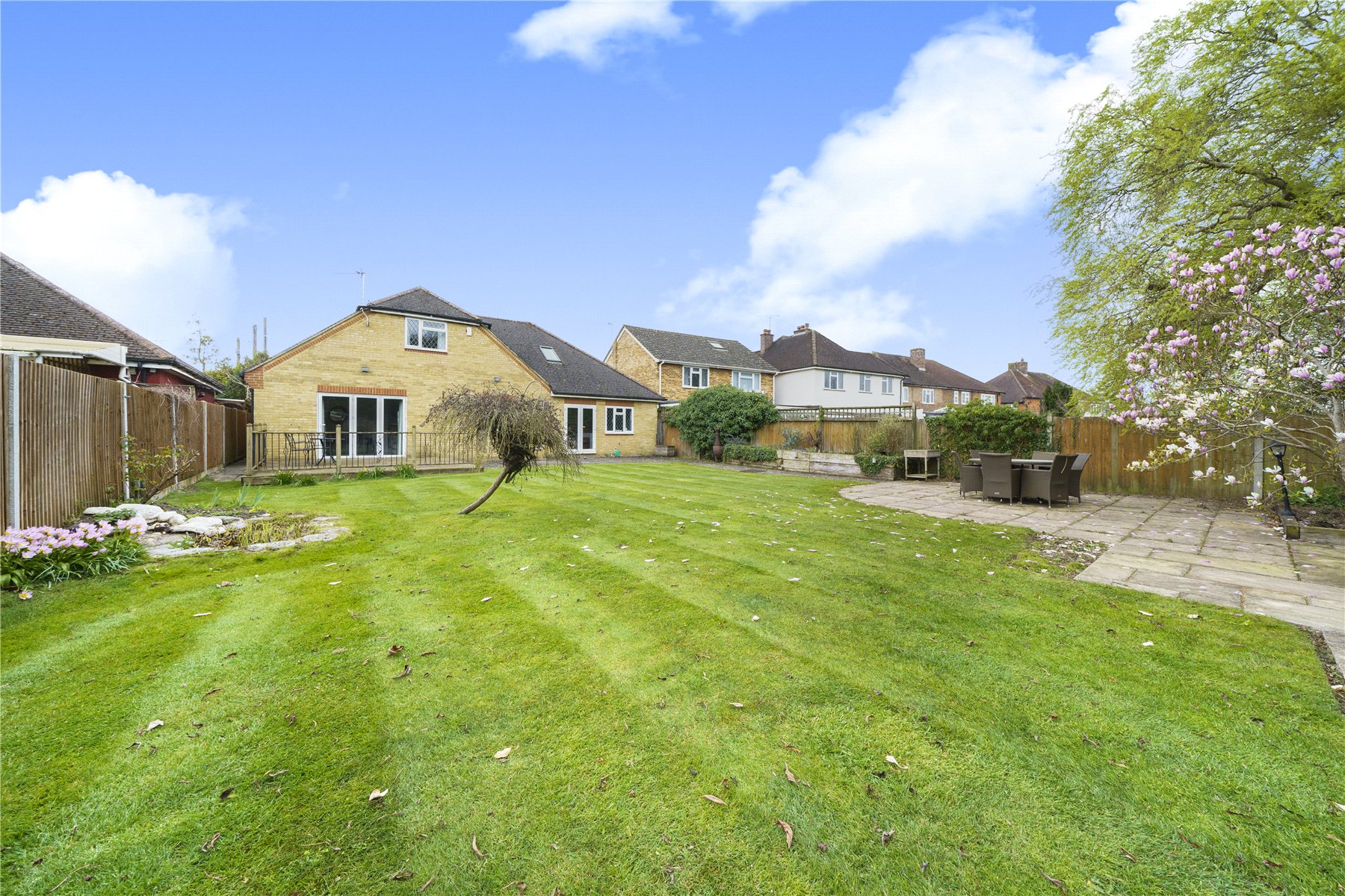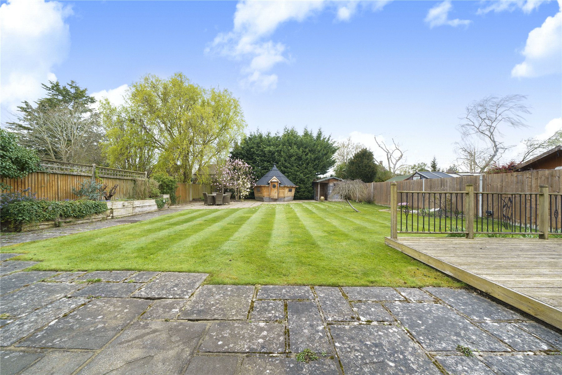 The rear garden is a particular highlight, extending to over 80ft and beautifully landscaped to offer a tranquil and private setting. A manicured lawn is complemented by patio and decking areas, ideal for al fresco dining and summer gatherings. Enhancing the lifestyle further is a delightful Finnish Grill House and a separate summer house, creating unique spaces for entertaining and relaxation.