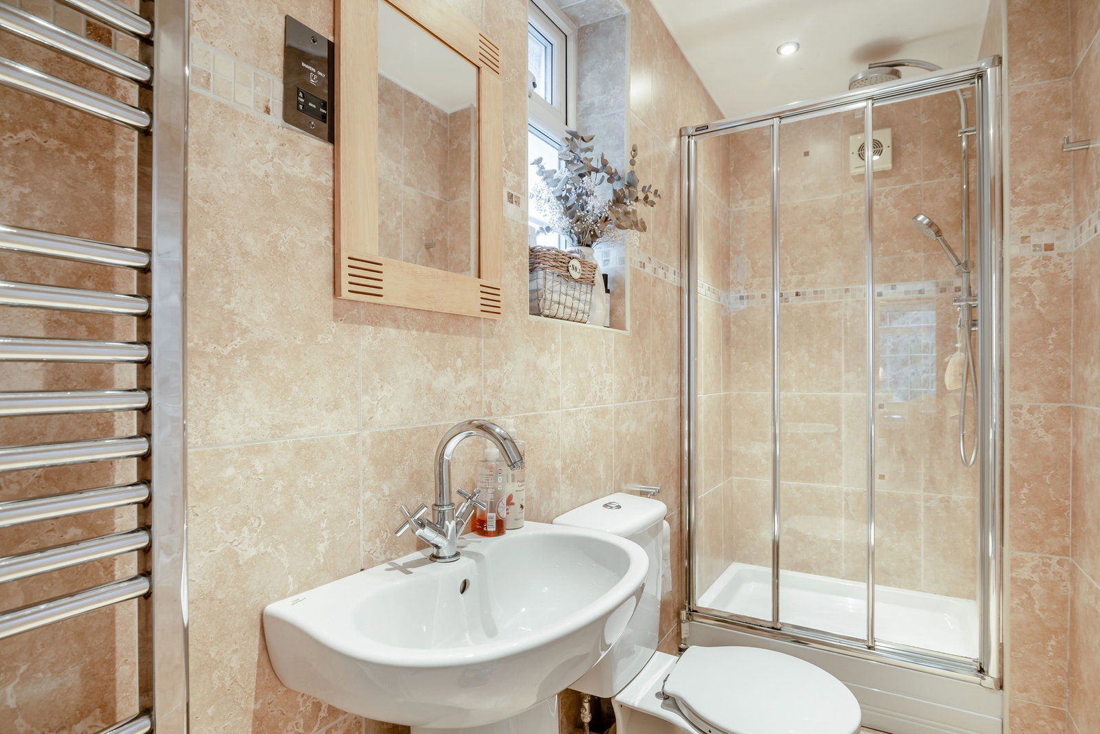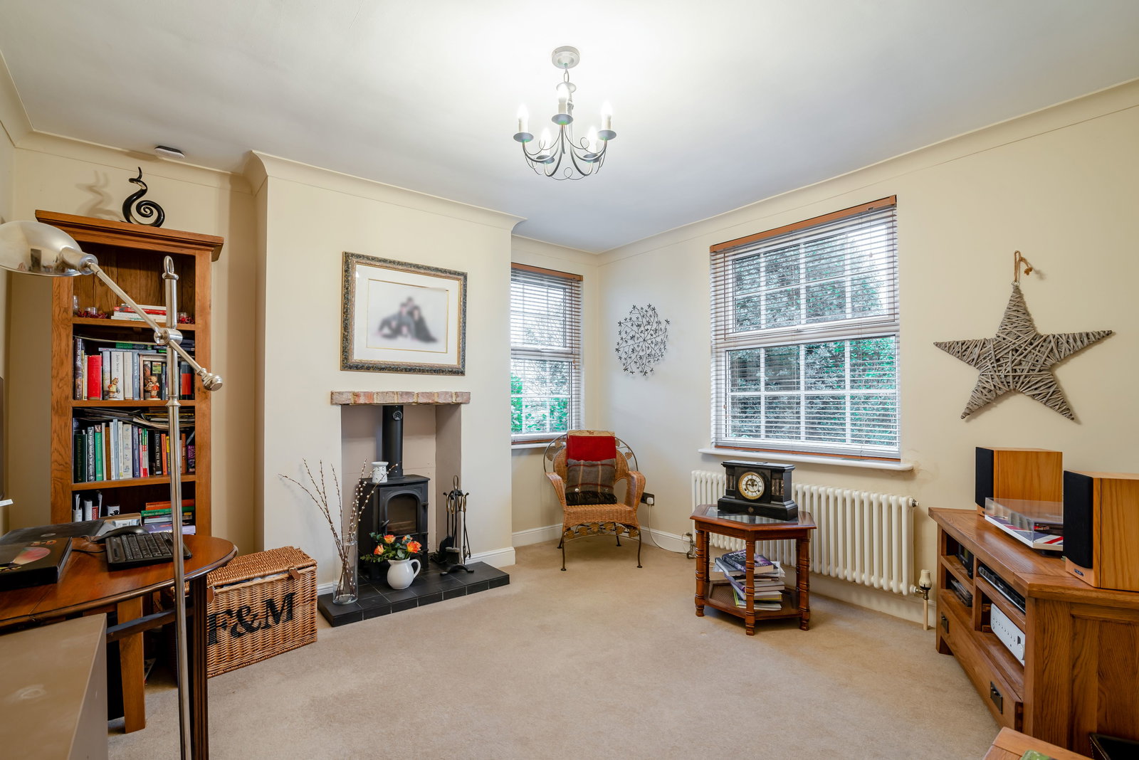 An attractive oak portico with tiled flooring present side entrance which opens into a generous hallway with oak flooring and a return staircase. To the front, the main reception room enjoys windows to two elevations, an external front door and a wood‑burning stove. A second reception room also benefits from dual‑aspect windows and a multi‑fuel stove. A modern downstairs W.C and shower room sits off the hall.