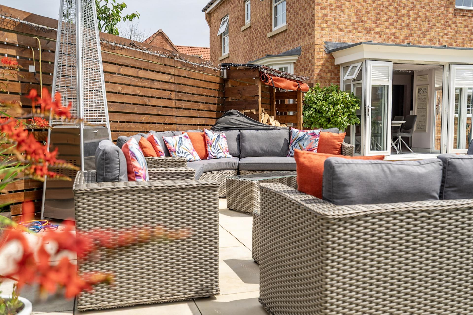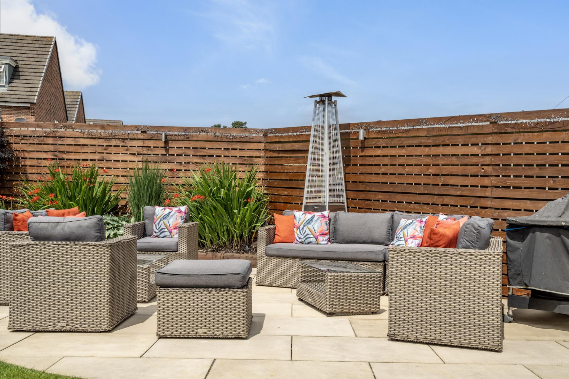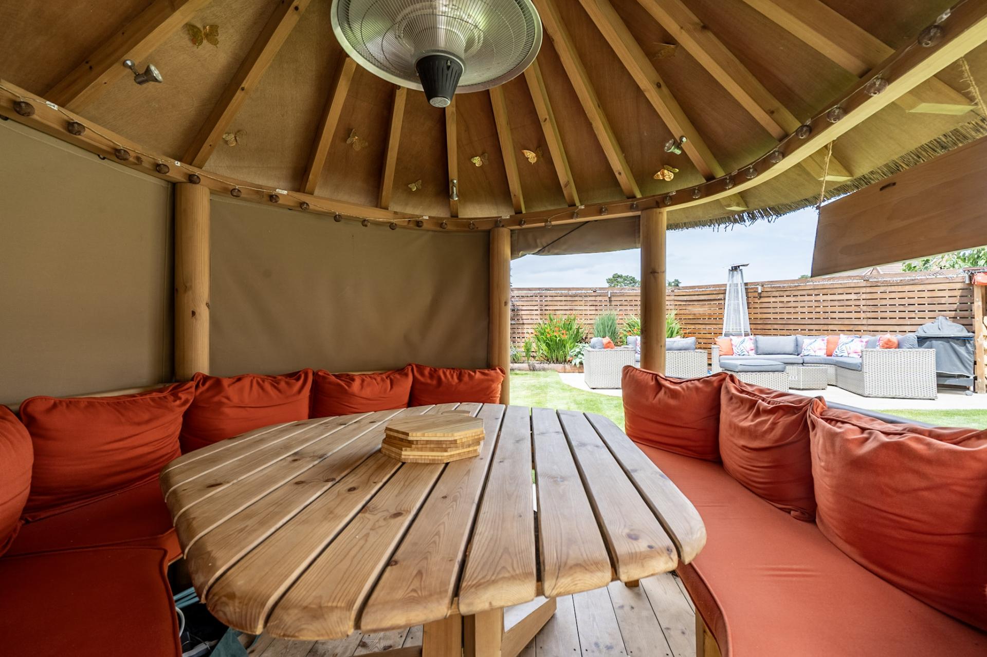 OUTSIDE The front of the property is laid to lawn with a paved pathway to the front door, to the side is the driveway leading to the detached garage. The garden faces south-west and is laid to lawn with a paved patio area, raised planted borders, a 'Tiki bar' with heat and power. There is also an outside tap and outside lighting and sockets.