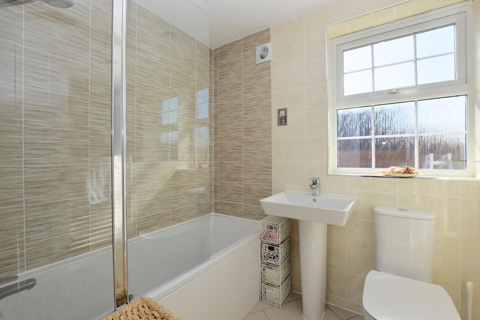 BATHROOM Window to side aspect. White suite comprising bath with shower over, WC and basin. Tiled walls with large fitted mirror, Amtico flooring, recessed ceiling spotlights, white ladder style towel radiator.