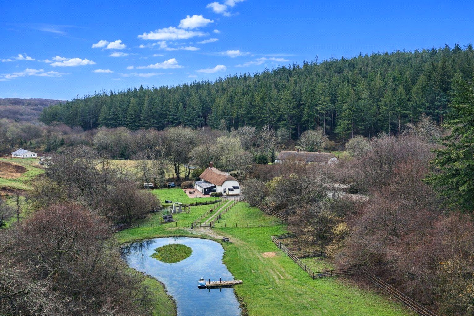 One field features a picturesque lake which is stocked with trout perfect for those who enjoy fly fishing as well as a central island and timber pontoon. A dedicated seating area overlooks the water, providing a peaceful spot to relax and enjoy the abundant wildlife throughout the year. The grounds include a small, established apple and fruit orchard.