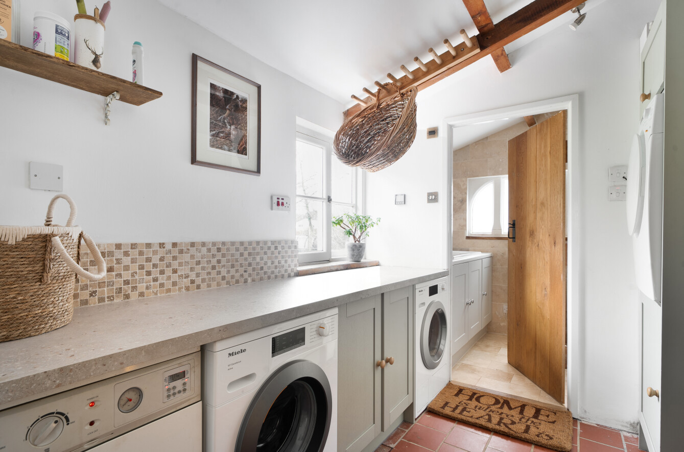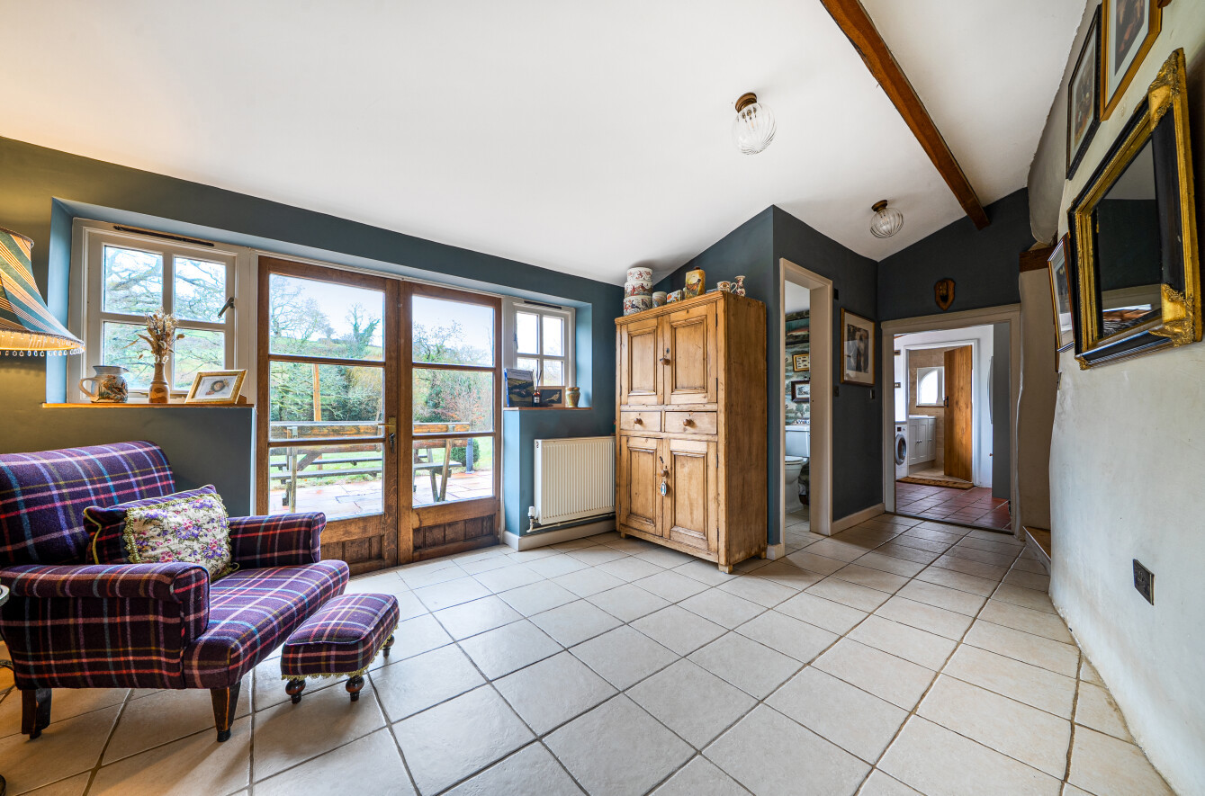 From the kitchen, a step leads into an inner hallway, a delightful spot perfect for reading or relaxing, with tiled flooring and patio doors opening directly onto the garden and patio. From here there is access to a well equipped boot room, offering excellent practicality along with an additional outside door.
