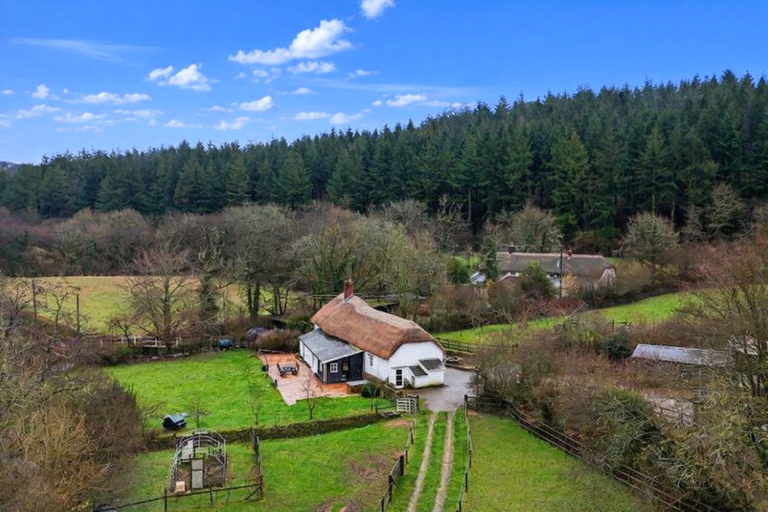 Reached via a ford crossing, the approach leads to a car port. From here, a traditional five bar timber gate opens onto a private driveway, providing ample parking and leading directly into the enclosed yard where the outbuildings are situated.