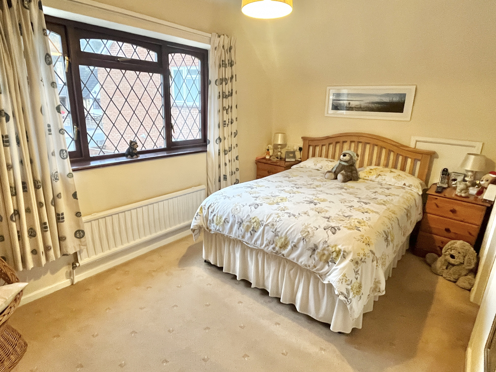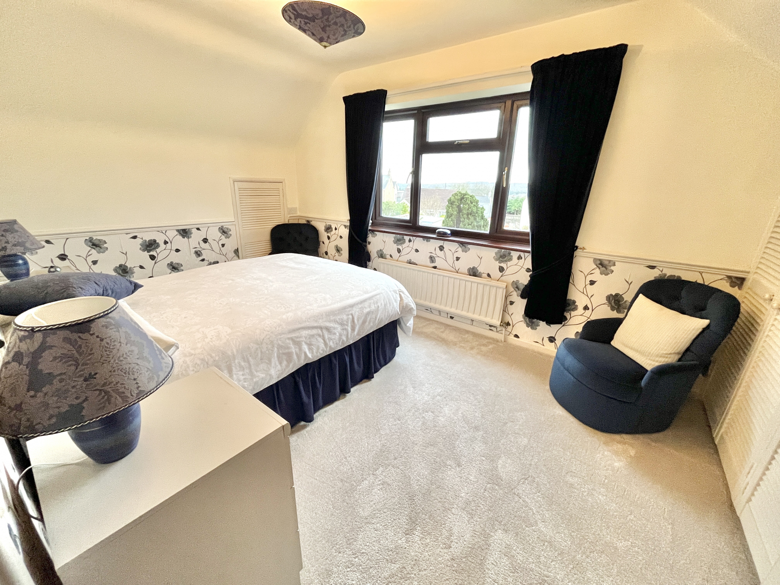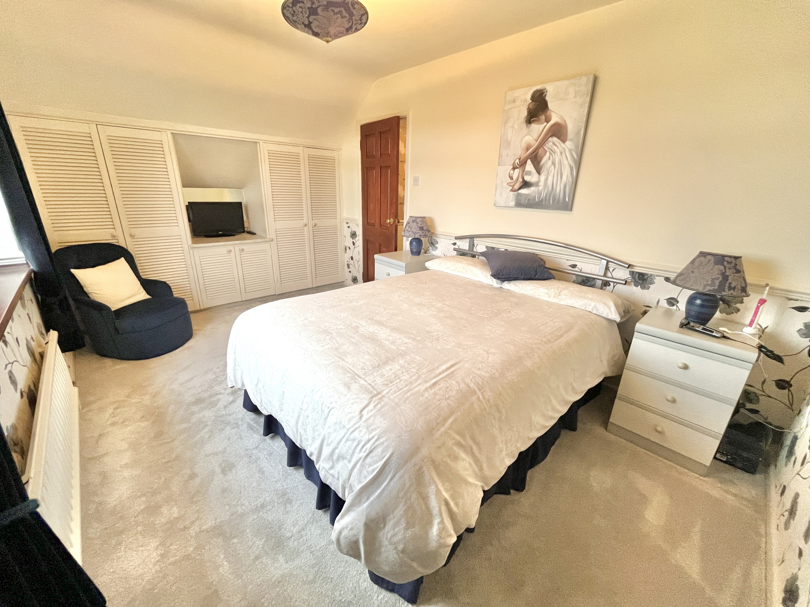 UPVC double-glazed window to rear elevation with elevated views towards woodland and beyond. Carpeted throughout with central lighting. Double room with great range of fitted wardrobes providing shelving and hanging space. TV point and power points. Access to eaves storage and radiator.