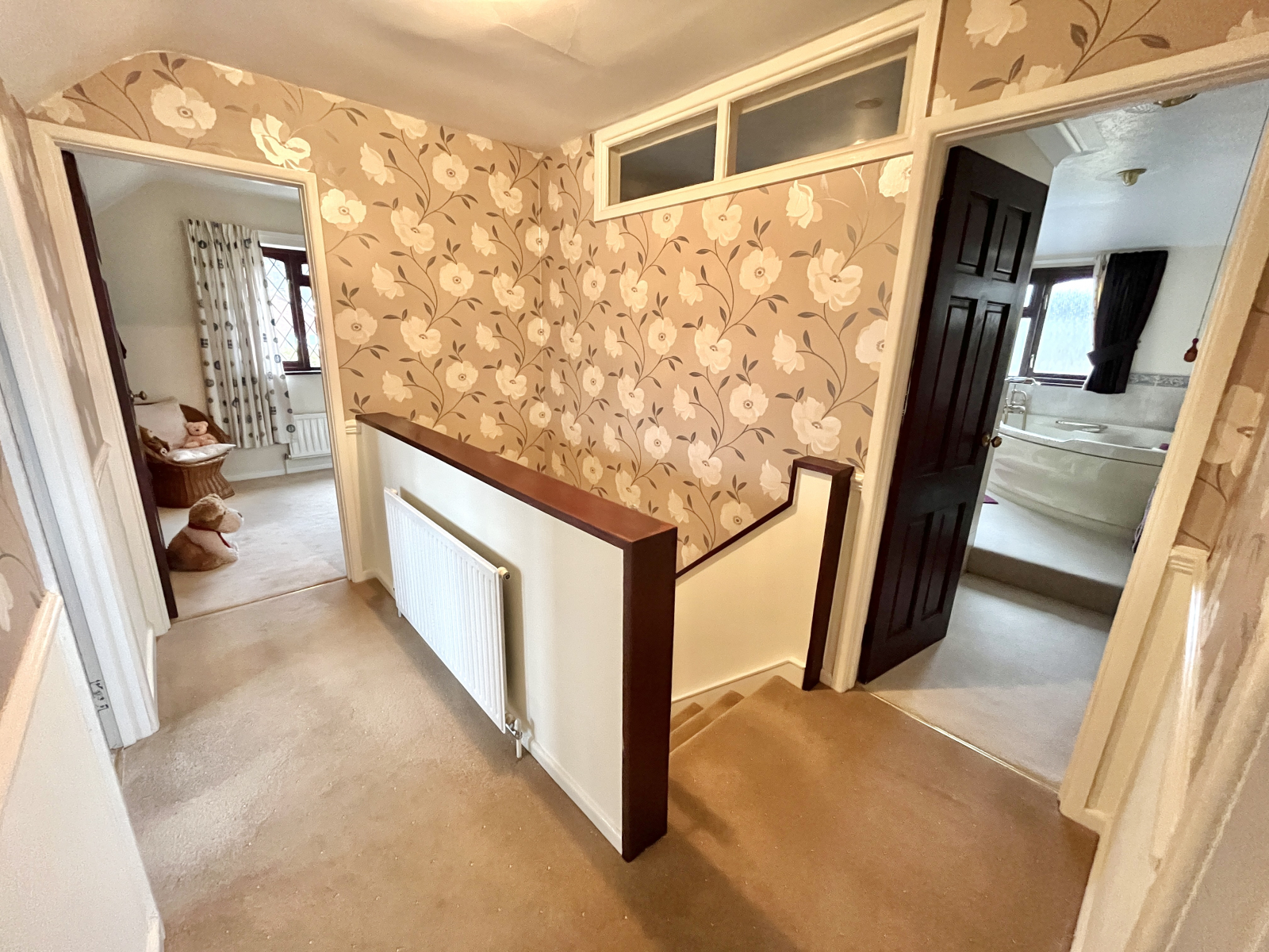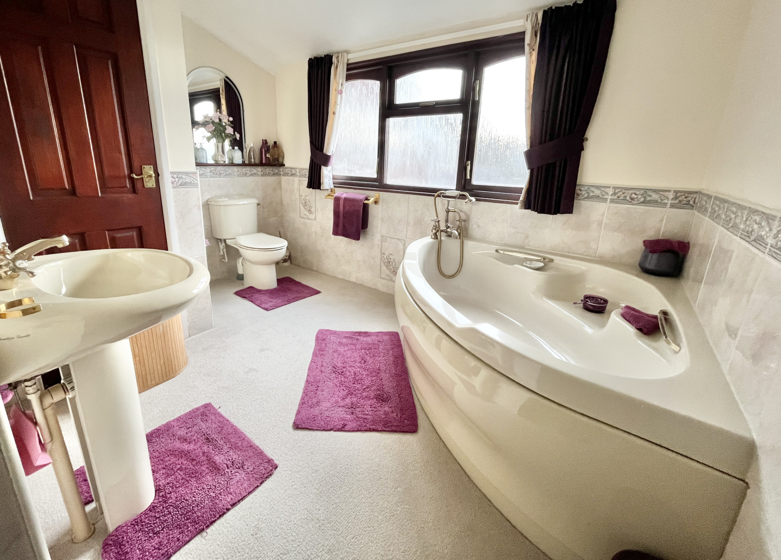 UPVC obscure double-glazed window to side elevation. Spacious and bright the bathroom suite consists of, low level W.C and pedestal wash hand basin. Large corner bath with telephone style moxer taps and shower attachment. Carpeted flooring and half tiled walls with border. Spot lighting and heated towel rail. Door to airing cupboard.