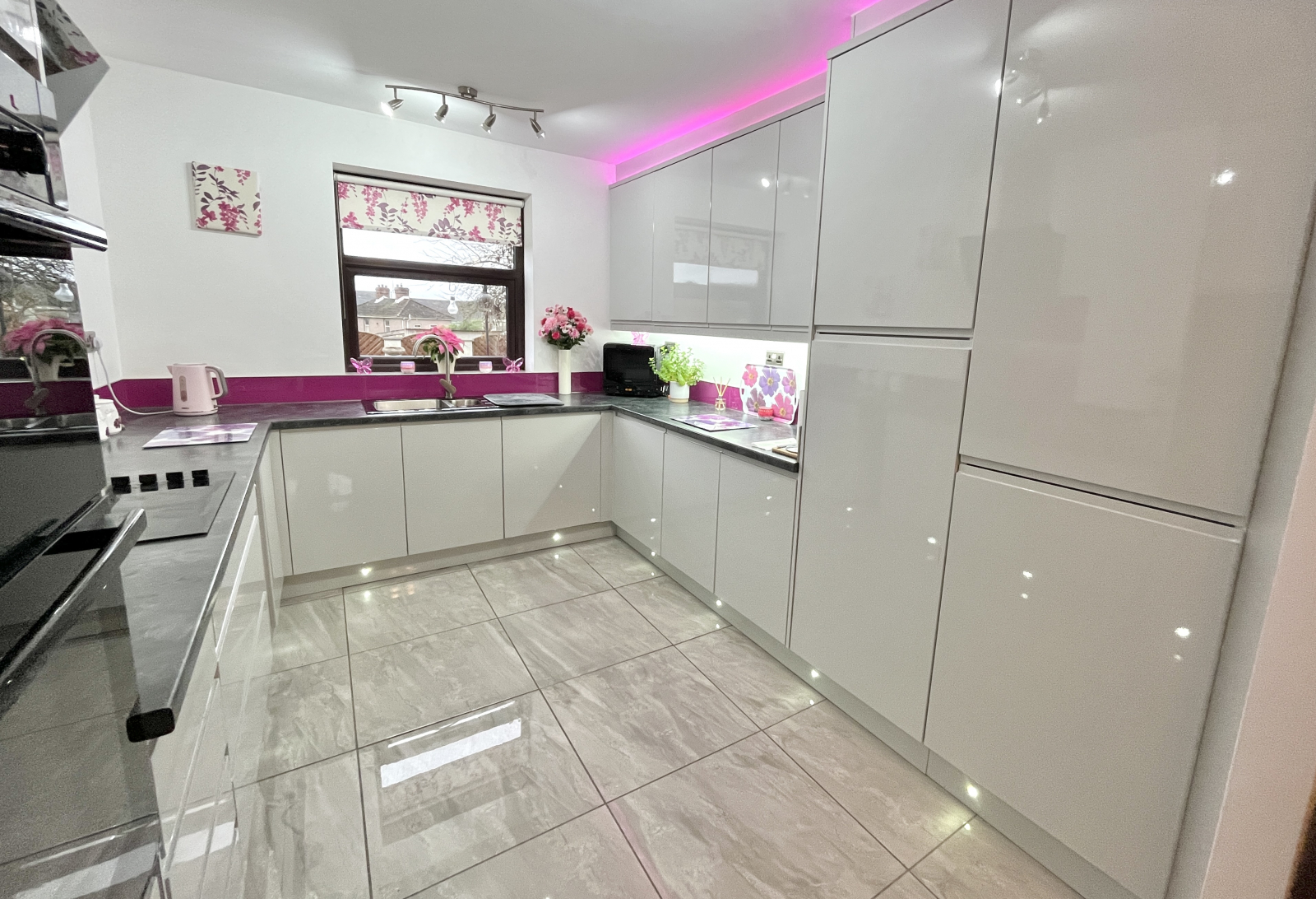 The bright and modern kitchen area is beautifully presented with UPVC double glazed window to rear overlooking the garden. Having an excellent range of base and eye level high gloss grey cabinets and drawers with laminate worksurfaces and glass upstands and splash backs. Integrated NEFF eye level double oven and ceramic four ring electric hob. Integrated fridge/freezer and dishwasher. Angled glass touch screen cooker hood and 1 1/2 bowl stainless steel sink and drainer with glass inserts and mixer tap over. Gloss tiled flooring and chrome effect power points. Feature plinth and undercabinet lighting. Open into;