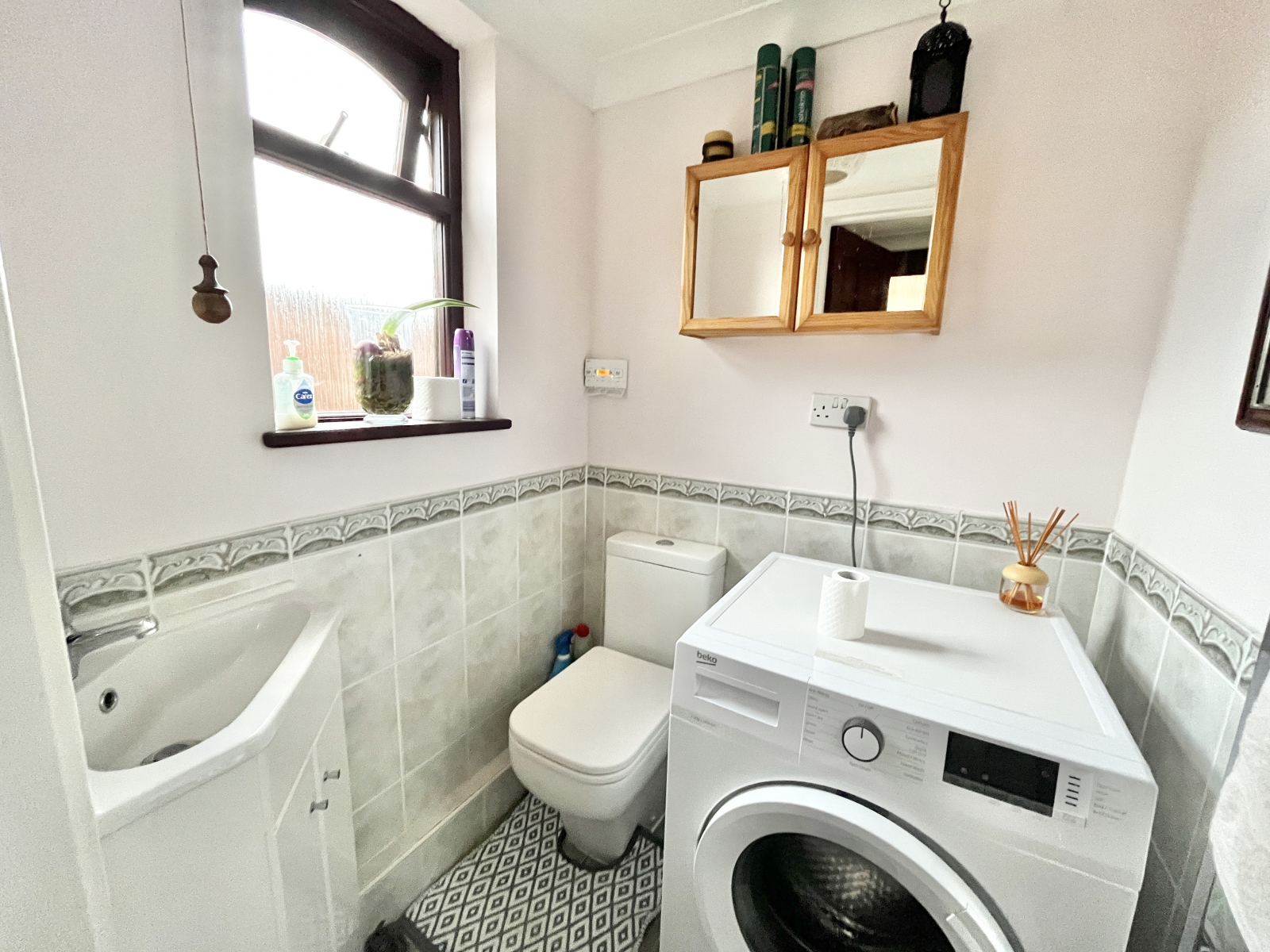 Downstairs Cloakroom / Utility Wooden double glazed obscured window to side elevation. Low level push button W.C and vanity sink unit with mixer tap. Tiled flooring. Space and plumbing for washing machine. Half tiled walls and chrome effect heated towel rail.