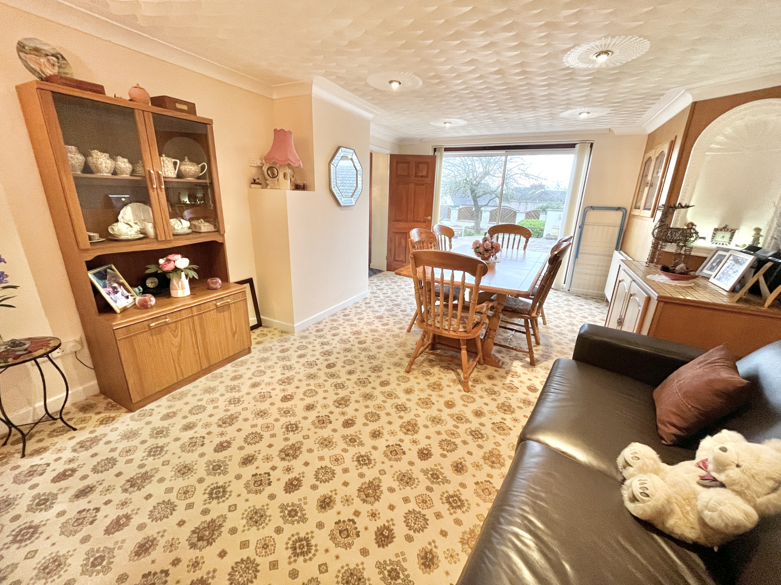 Large sliding double glazed doors to rear giving additional garden access. Spacious and bright this versatile room has spot lighting and wall lighting. Great potentail to create an additional bedroom or Annex. Carpeted throughout with two radiators. Fitted storage cupboard and glazed display cabinet with lighting. Power points and door to;