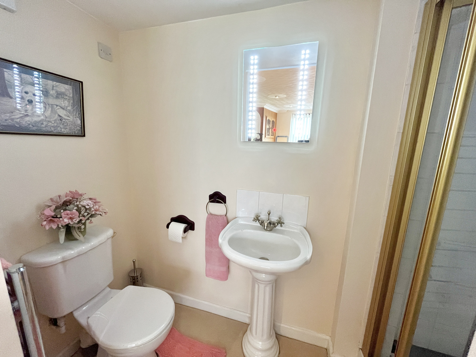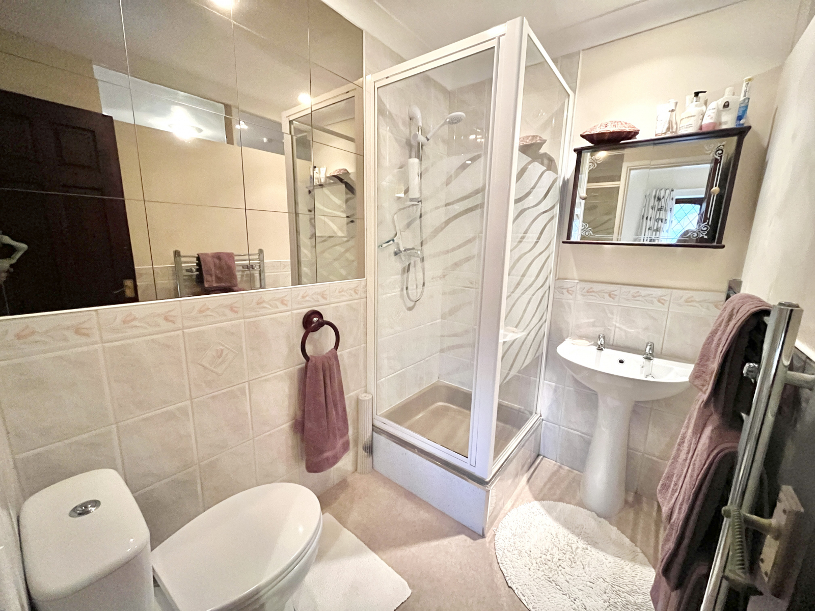 W.C and padestal wash hand basin with mixer taps. Step in shower fully tiled with Mira electric shower. Mirror with lighting and extractor fan. Chrome effect heated towel rail and carpeted flooring.