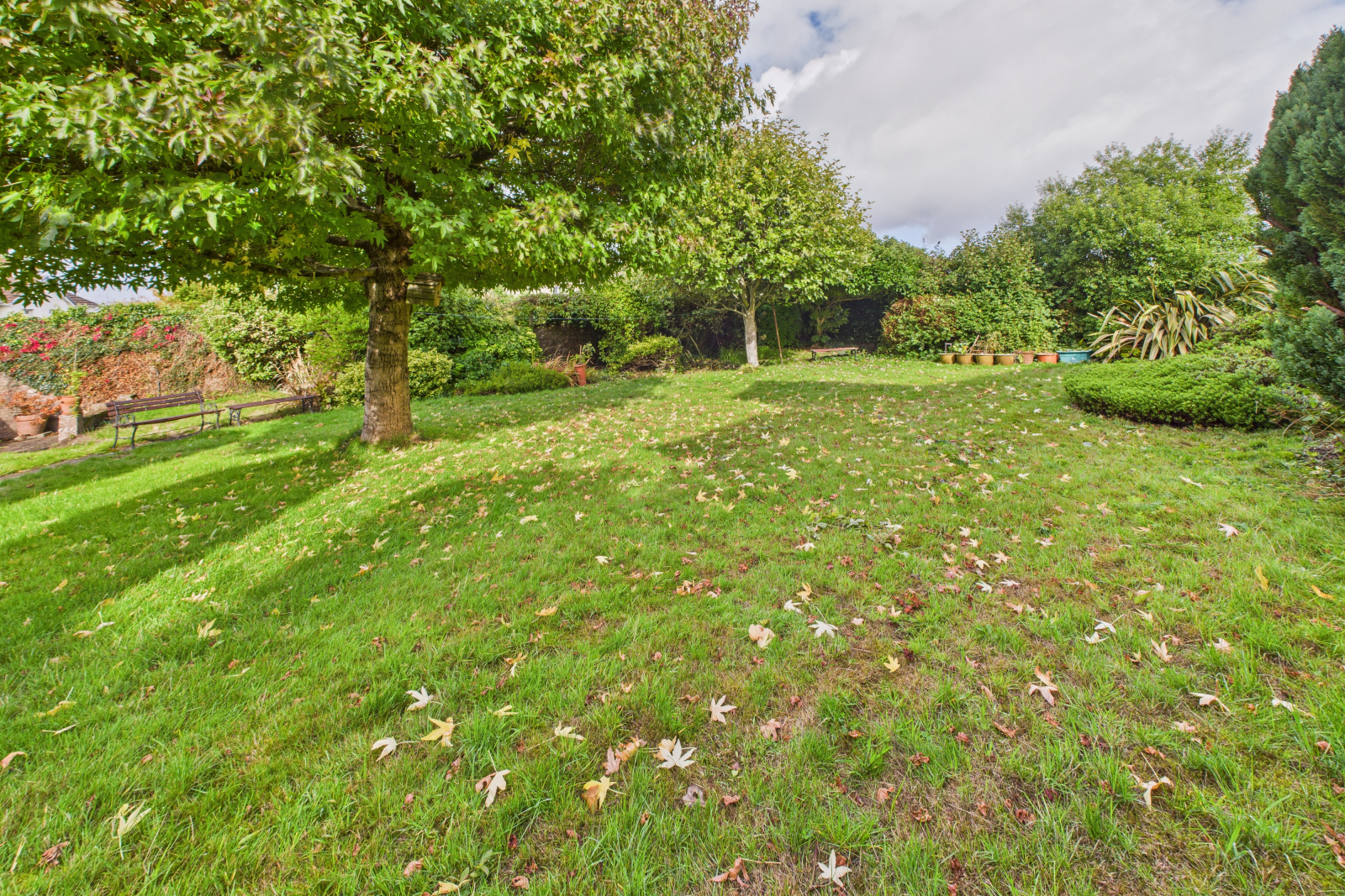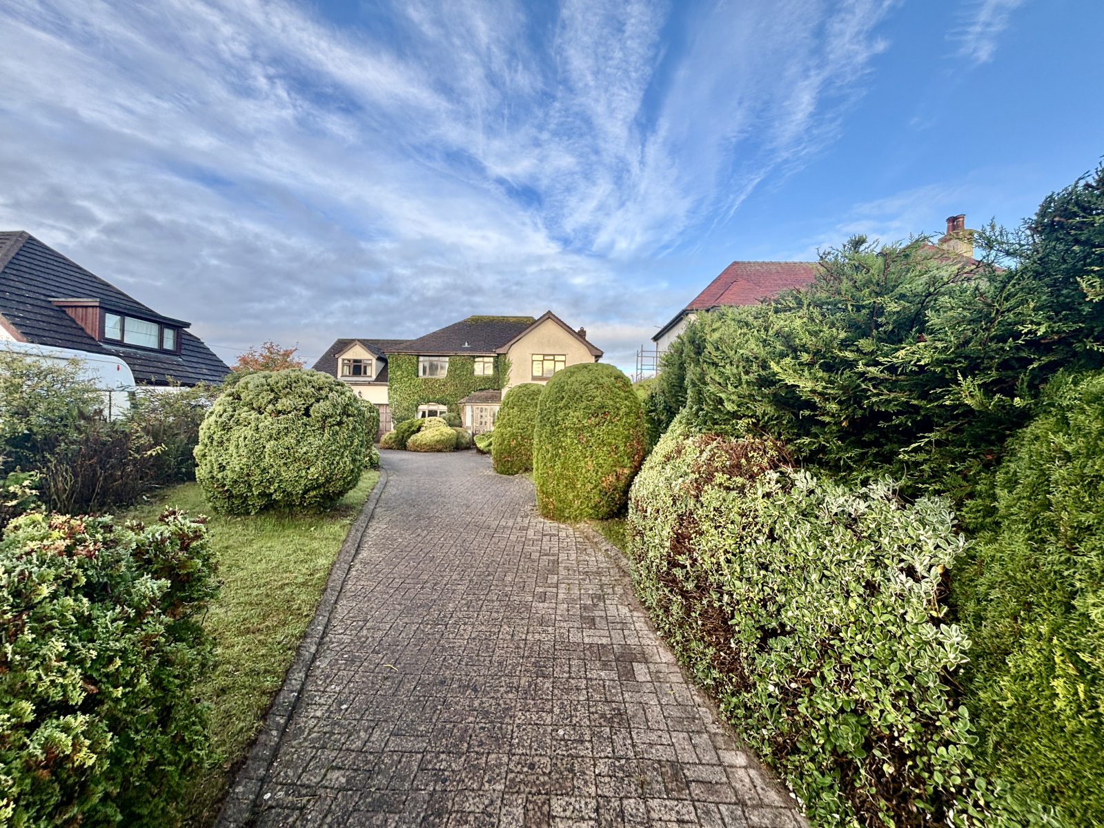 Outside The front of the property offers spacious, private grounds. A block-paved driveway winds through mature trees and shrubs, leading to the garage. Lawned areas and side access.