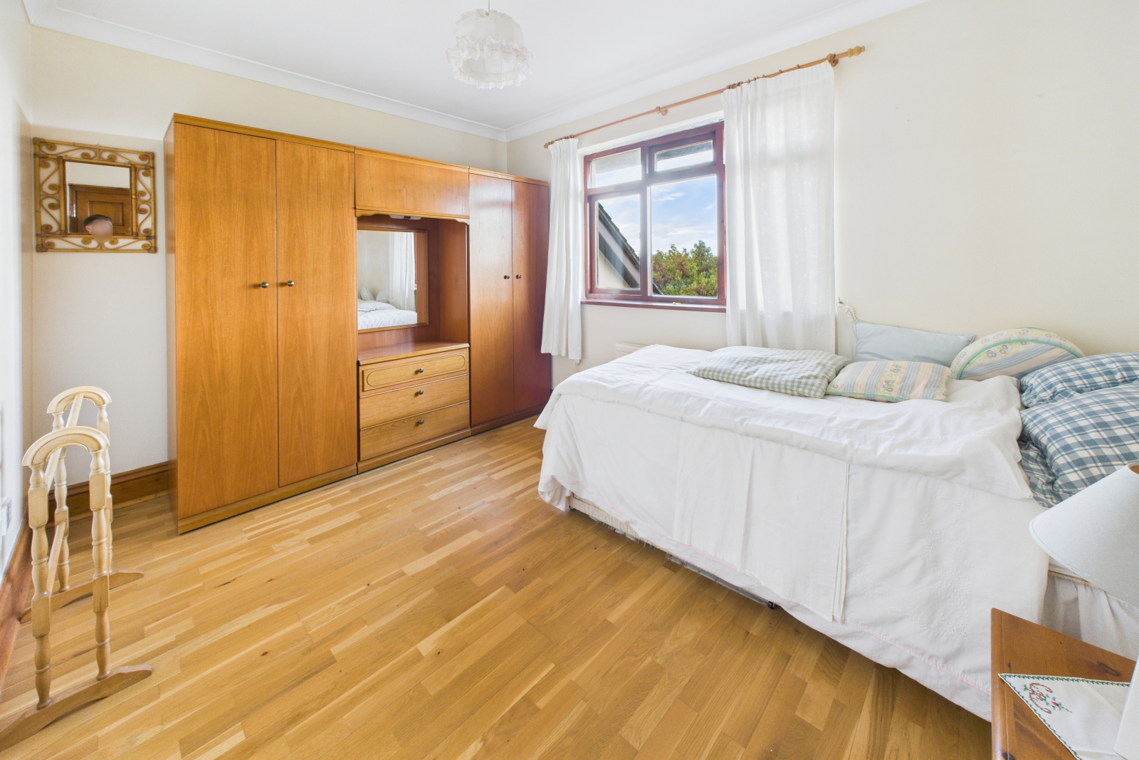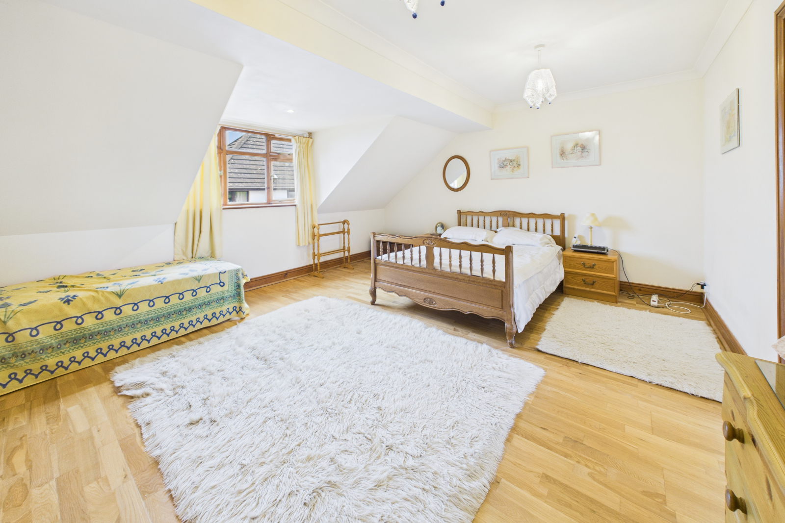 Bedroom Three 11'10'' x 12'2'' Rear wooden window with woodland and garden views. Excellent range of fitted wardrobes with hanging rails and shelving. Wood-effect flooring, ceiling light, radiator, and power points.