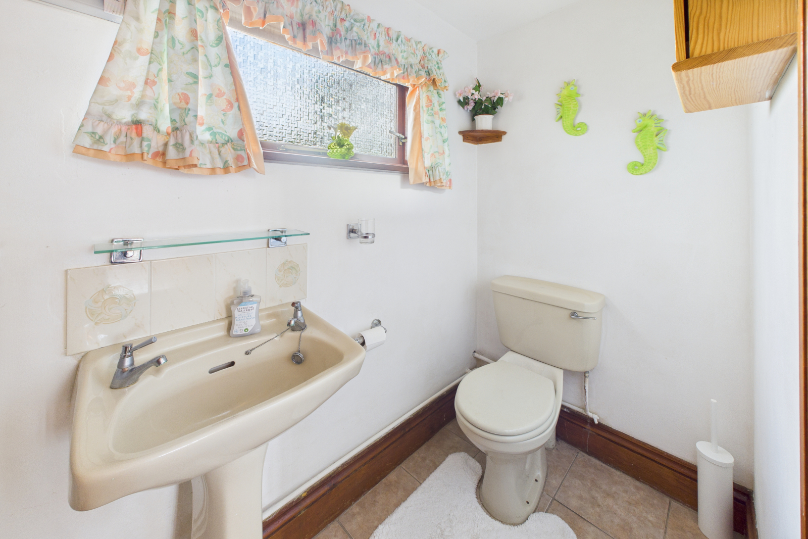 Family Bathroom 5'6'' x 8'11'' Obscured front window. Suite comprising low-level push-button W.C., pedestal wash hand basin, and panelled bath with glazed screen and shower over. Part-tiled walls, tiled flooring, radiator, and shaving point.