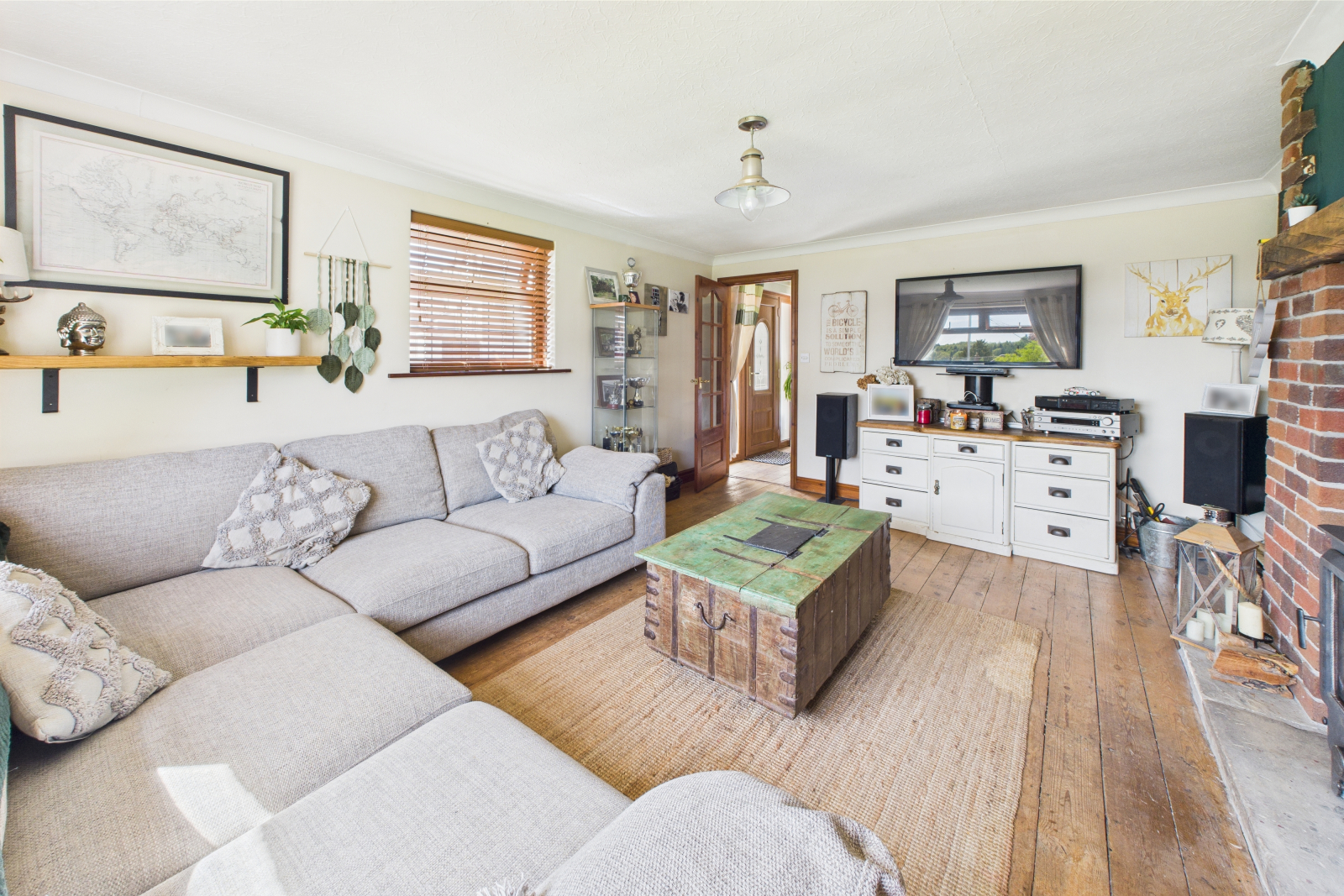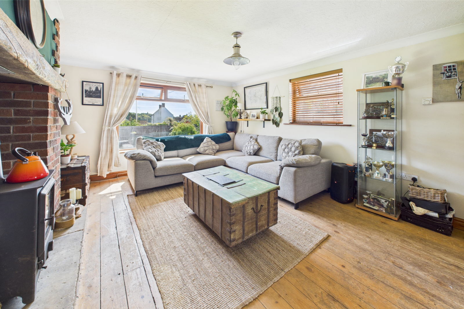 Brimming with character, this spacious yet cosy living room enjoys views over the garden through two UPVC double-glazed windows. The focal point is a stunning bespoke brick-built inglenook fireplace with an oak mantle and a wood-burning stove — perfect for colder evenings. Exposed wooden flooring, central ceiling lighting, power points, and TV connection complete the room.