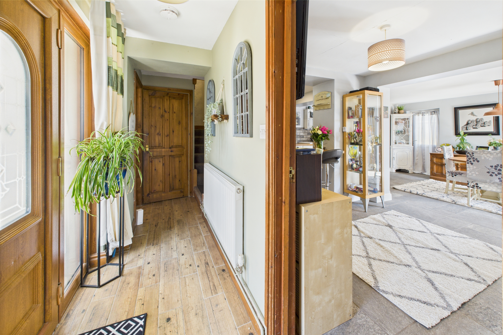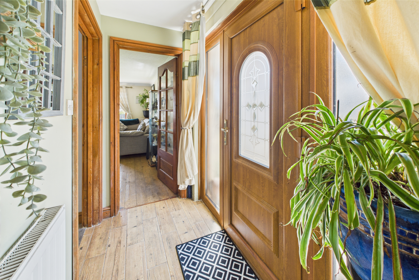 A bright and inviting entrance, featuring a UPVC double-glazed front door flanked by two inset glazed windows, flooding the space with natural light. Finished with stylish wood-effect tiled flooring, central lighting, and a radiator. An open, carpeted staircase leads to the first floor, with doors opening to the principal ground floor rooms.