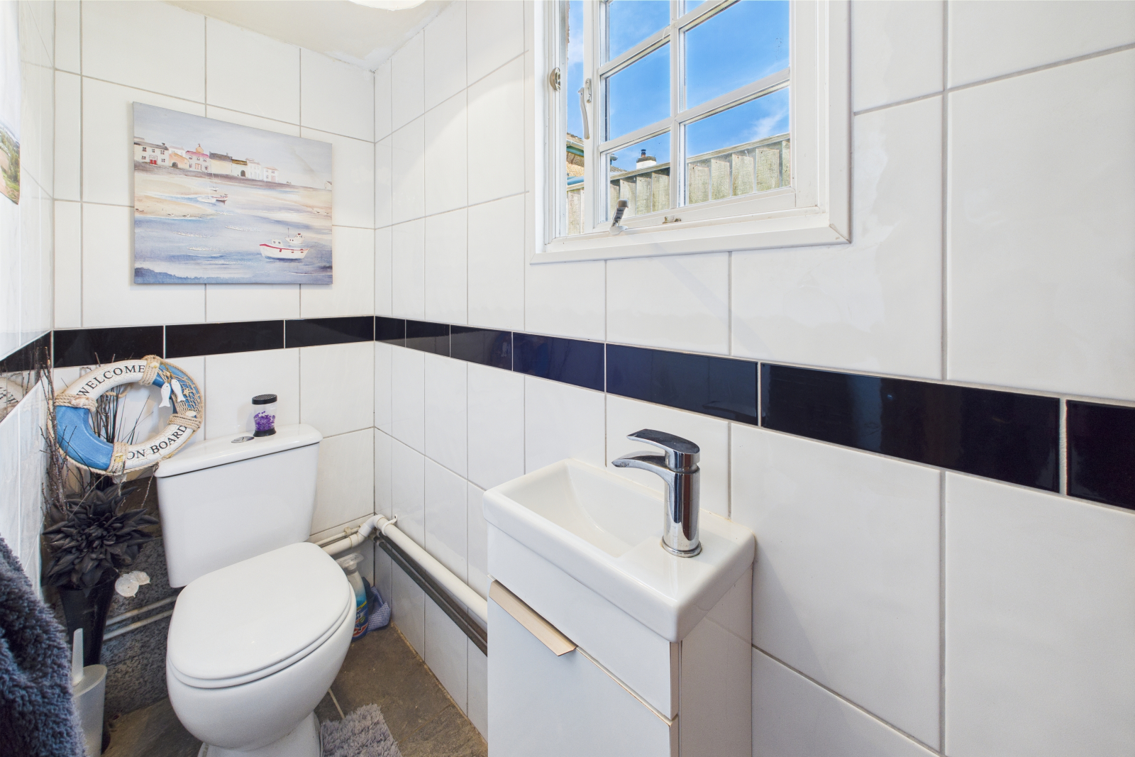 A stylish and fully tiled cloakroom featuring a white suite, comprising a low-level push-button W.C. and a wash hand basin with vanity unit and mixer tap. Double-glazed window to the rear, radiator, and ceiling lighting.
