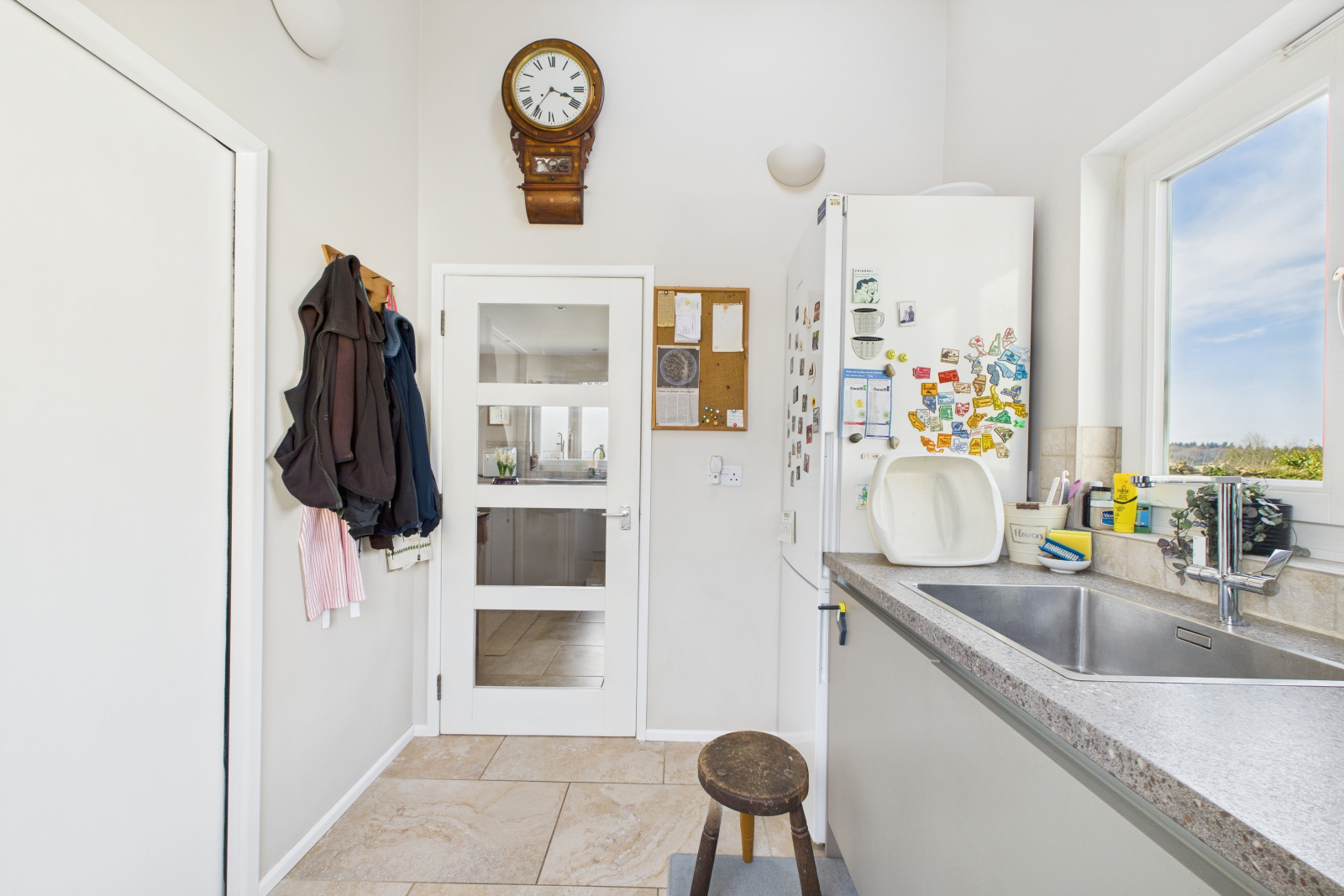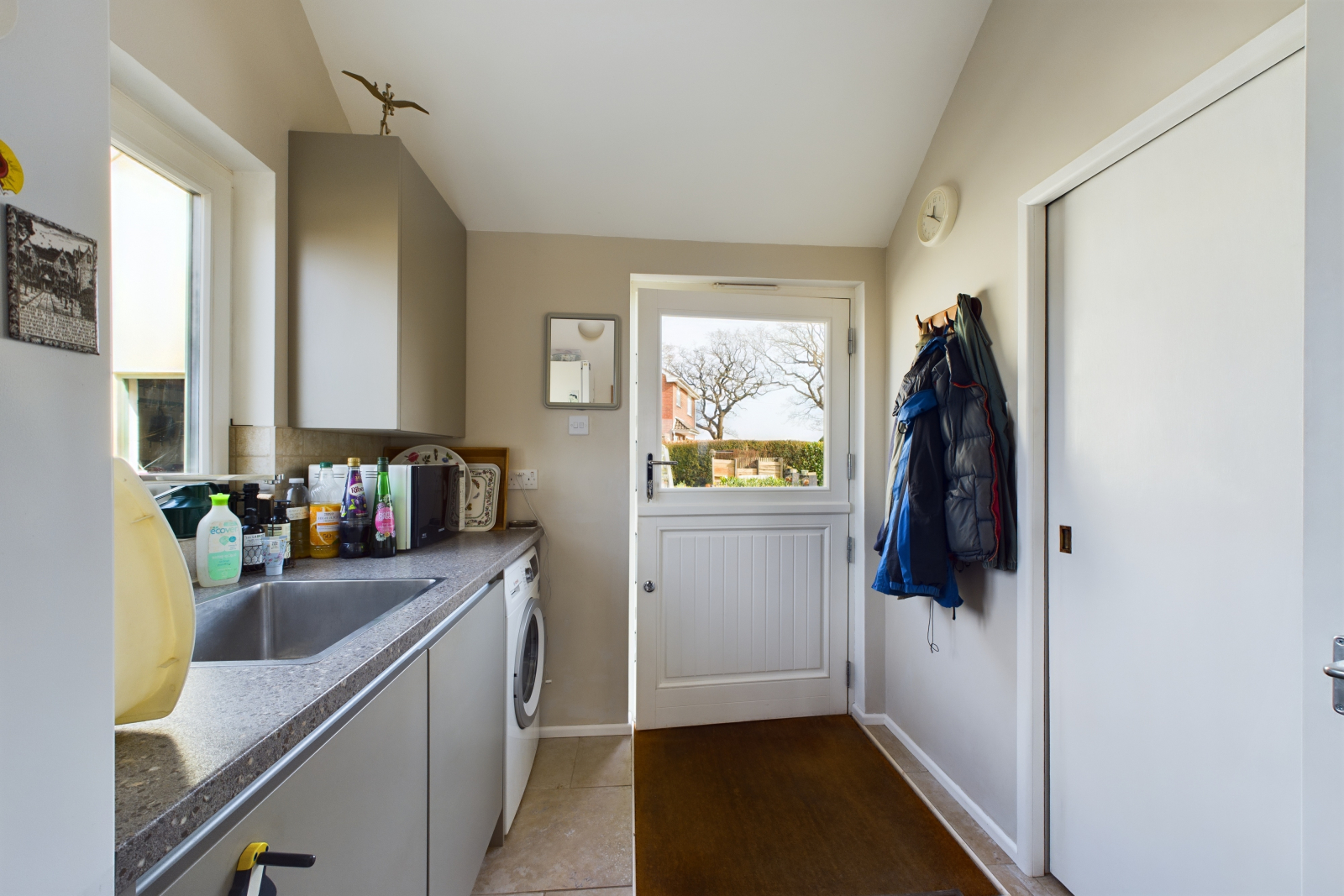 Designed for practicality without compromising on style, this utility room offers a UPVC double-glazed window to the rear and a charming composite stable door with a glazed panel, leading to the side aspect. A range of high-quality fitted base and eye-level units with rolled top work surfaces and elegant tiled splashbacks enhance the space. The large stainless steel sink with a mixer tap, along with designated spaces for a washing machine and fridge/freezer, adds convenience. The vaulted ceiling with a Velux window and soft wall lighting contributes to the airy and sophisticated atmosphere. Heated ceramic tiled flooring completes this thoughtfully designed space. Door leading to:
