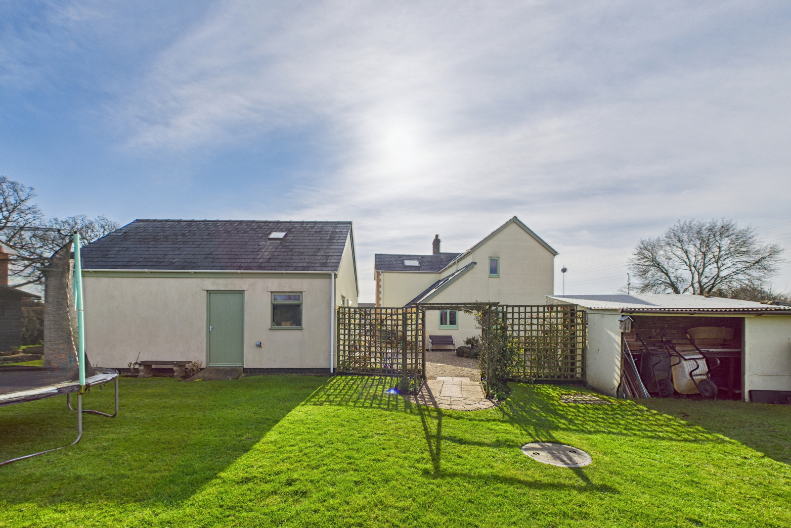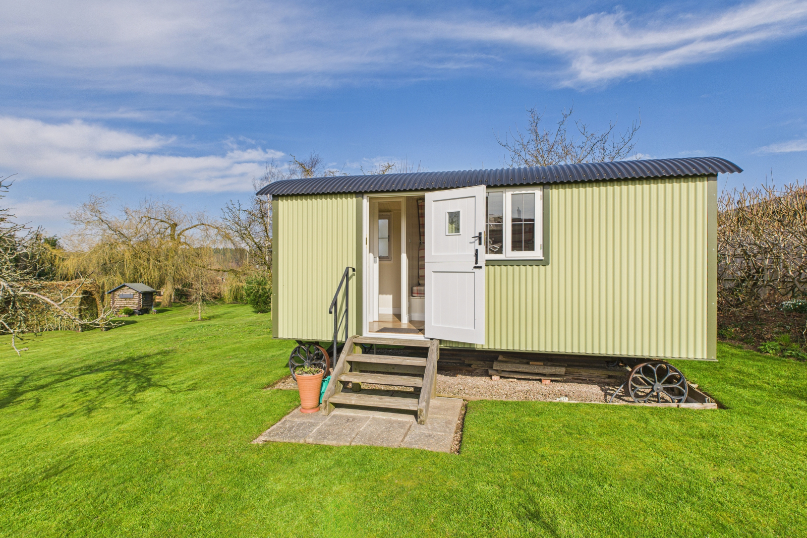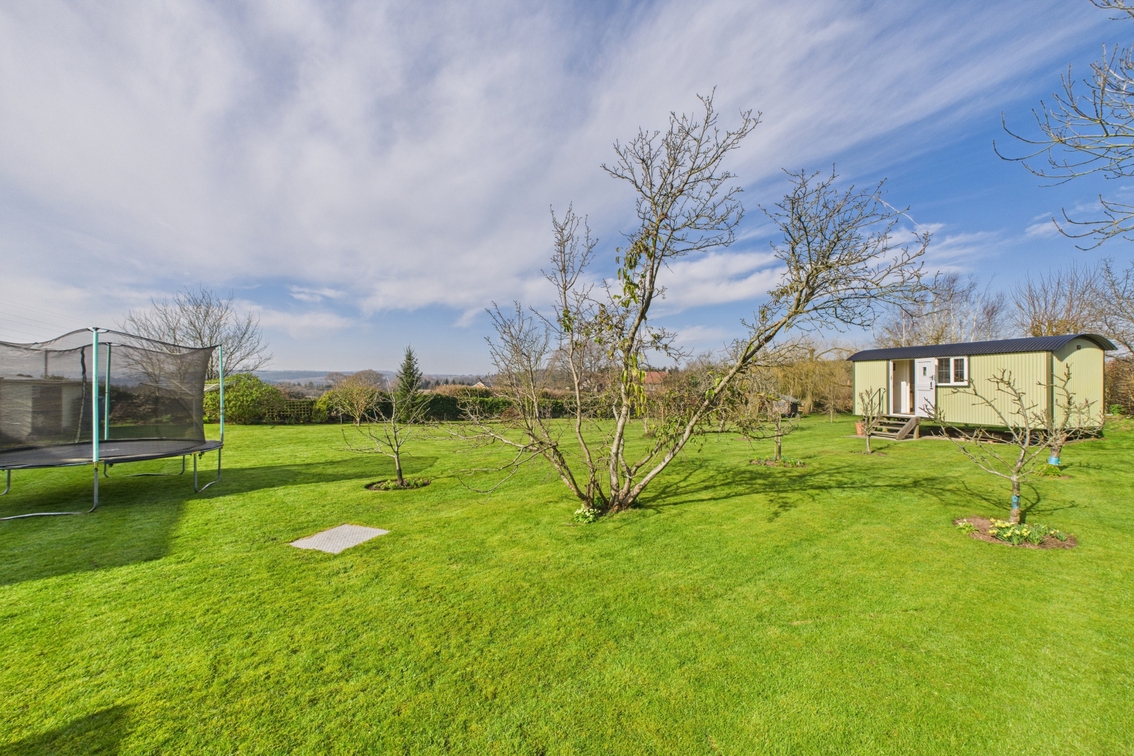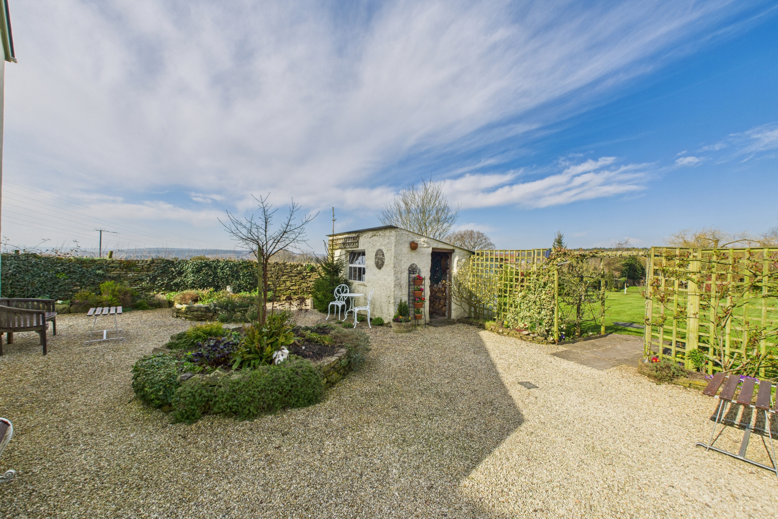 Nestled within the grounds, a charming courtyard-style garden offers a peaceful escape, bordered by raised flowering beds and an abundance of mature fruit trees and shrubs, creating a lush and colorful oasis. Meandering pathways lead to a beautifully handcrafted shepherd’s hut, a delightful retreat that could serve as a serene reading nook, a creative studio, or a luxurious guest hideaway.