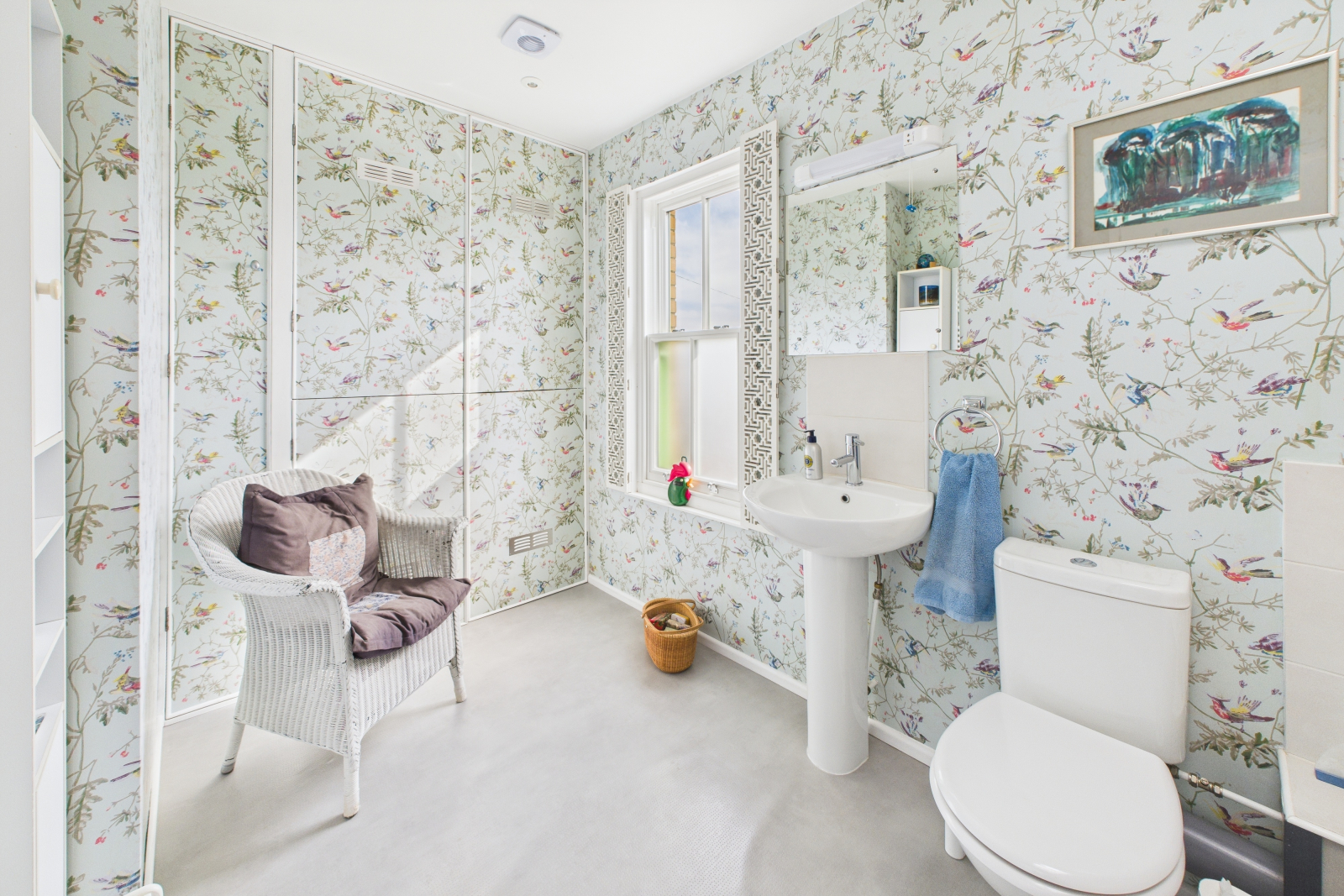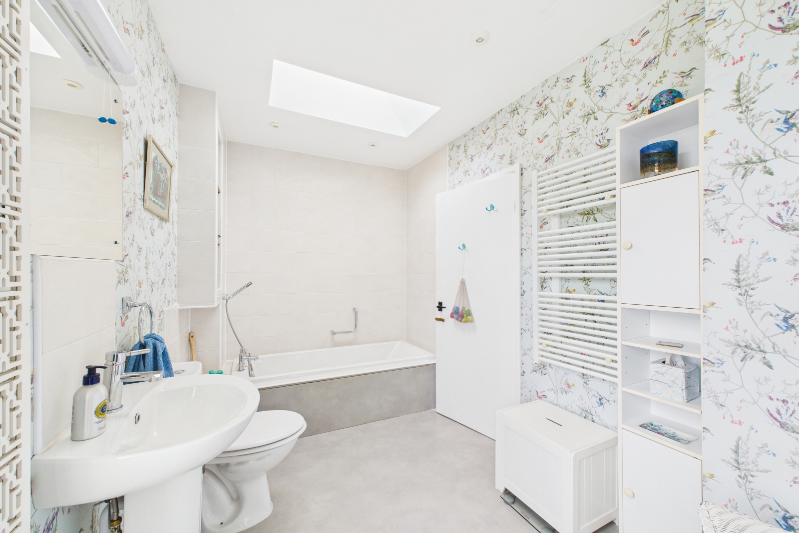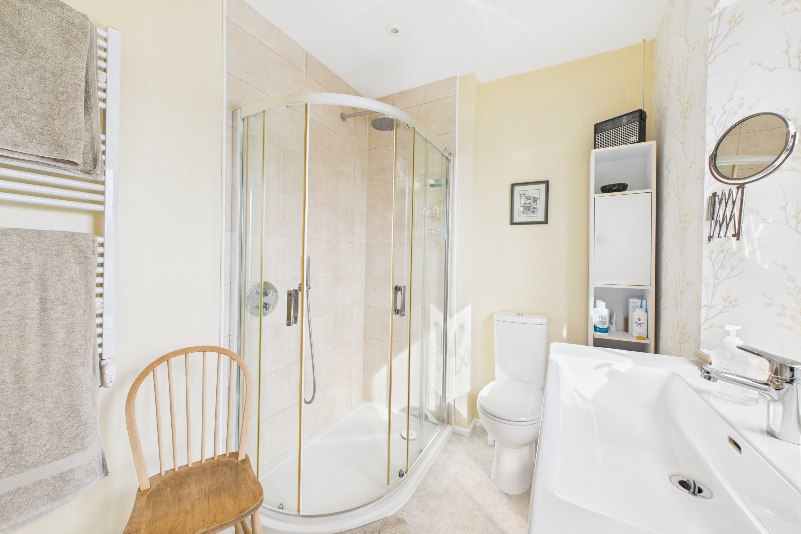 A spa-like retreat, this beautifully designed bathroom blends style with functionality. A UPVC double-glazed window to the front aspect, accompanied by a Velux window, fills the space with soothing natural light. A luxurious low-level panel bath, complete with a mixer tap and elegant shower attachments, is the centerpiece of relaxation. Stylish feature-tiled splashbacks with integrated shelving add both charm and practicality. The sleek low-level push-button W.C. and pedestal wash hand basin with a mixer tap enhance the contemporary feel. A shaving point with a lighted mirror, vinyl flooring, a heated towel rail, and a thoughtfully designed integrated airing cupboard with extensive shelving make this a truly special sanctuary.