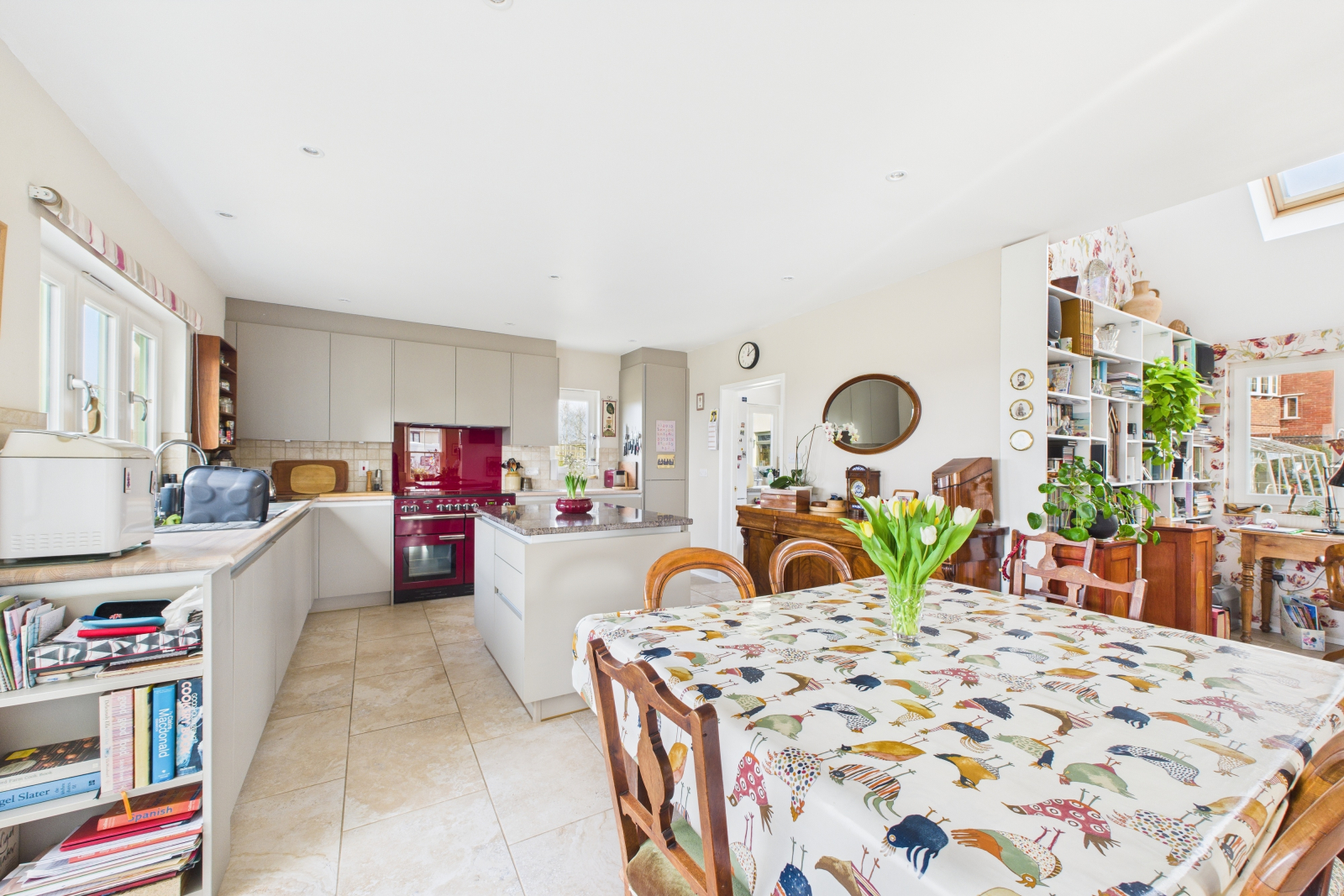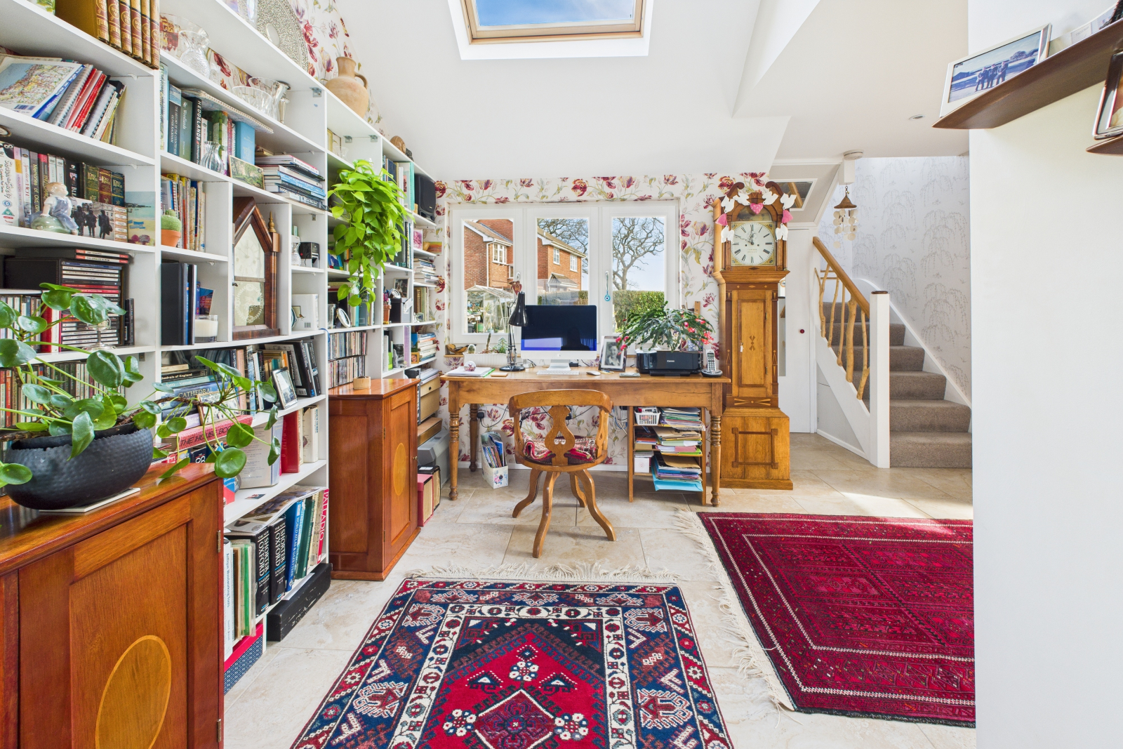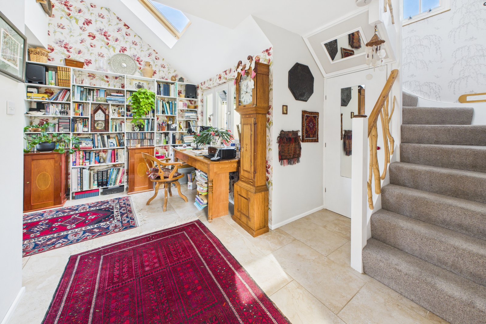 A truly remarkable space designed to inspire, featuring a breathtaking vaulted ceiling and a large Velux window that bathes the room in natural light. The handcrafted wooden banister elegantly frames the carpeted stairwell leading to the first floor, while a generous understairs storage area provides practical solutions. Sumptuous ceramic tiled flooring, enhanced by underfloor heating, exudes warmth and sophistication. Gigaclear internet connectivity ensures seamless digital access, and a charming bookcase adds character. The UPVC double-glazed windows frame delightful garden views, making this a perfect retreat. Seamlessly open to: