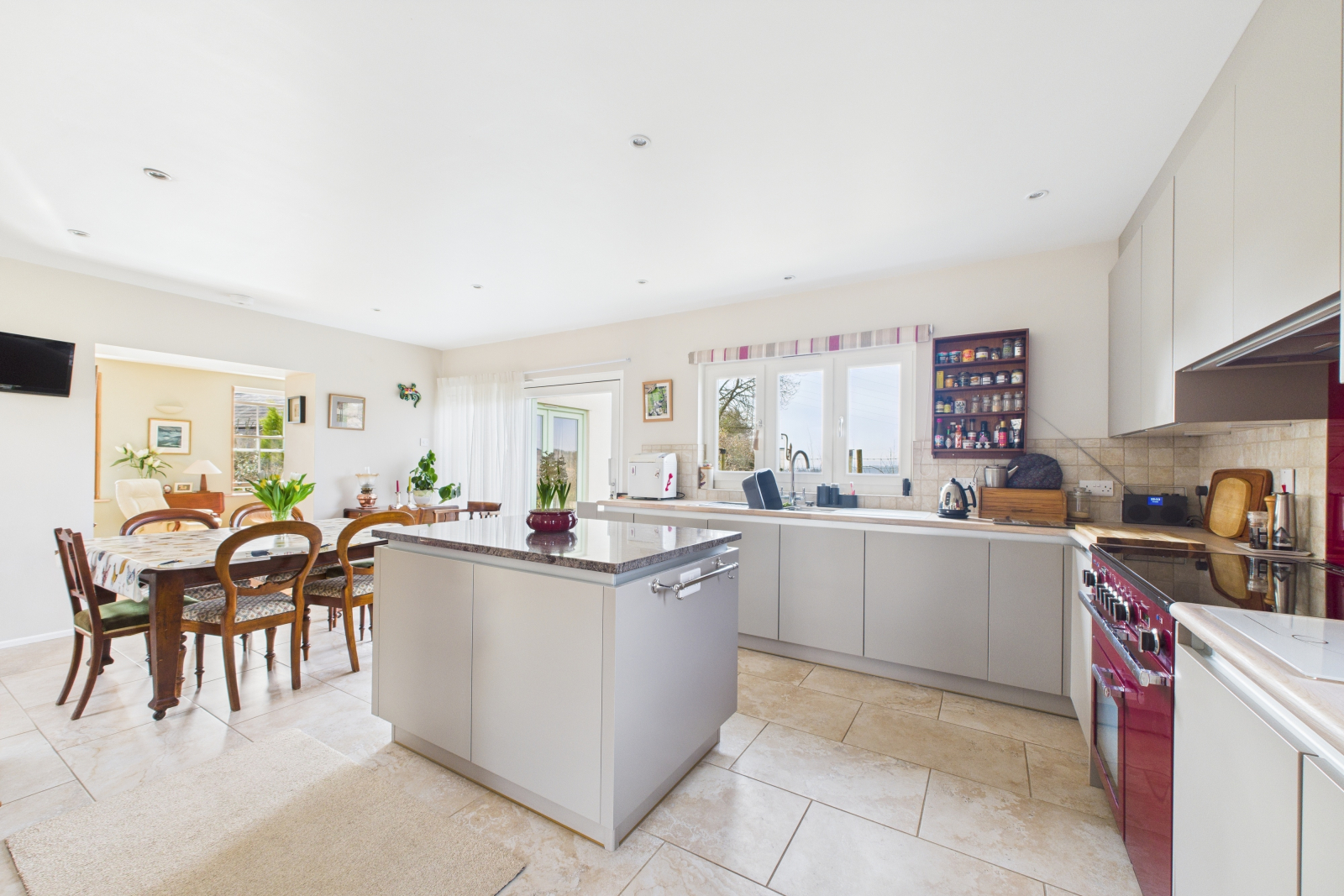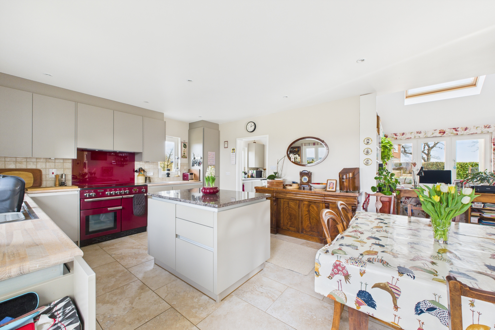 A culinary masterpiece, this exquisite kitchen has been tastefully upgraded by the current owners to an exceptional standard. UPVC double-glazed windows to the side and rear, alongside expansive patio doors opening to the side garden, create an atmosphere of light and space. The beautifully crafted kitchen boasts an impressive range of fitted base and eye-level units, complemented by elegant wooden work surfaces and stylish tiled splashbacks. The premium Range Master oven with an induction hob and integrated extractor fan provides a chef's dream cooking experience. A 1.5-bowl stainless steel sink with a mixer tap, pullout pantry, and thoughtfully designed storage solutions ensure a balance of beauty and functionality. Heated ceramic tiled flooring, ambient spot lighting, and ample space for a dining table complete this extraordinary setting.