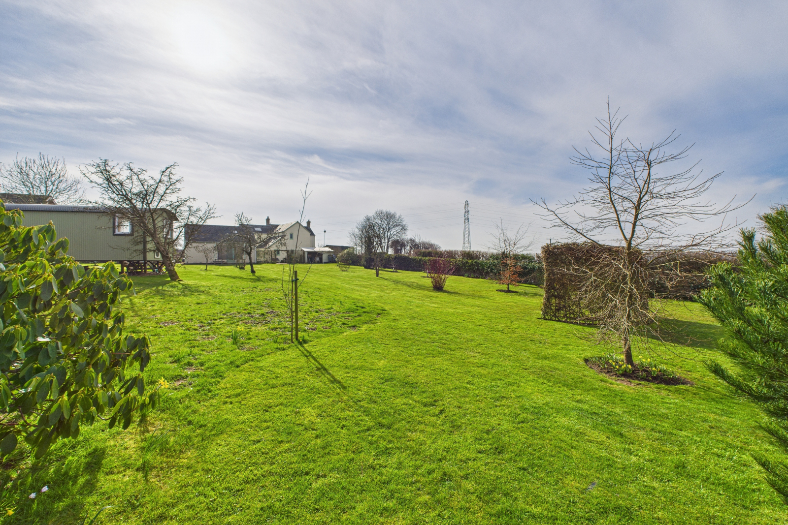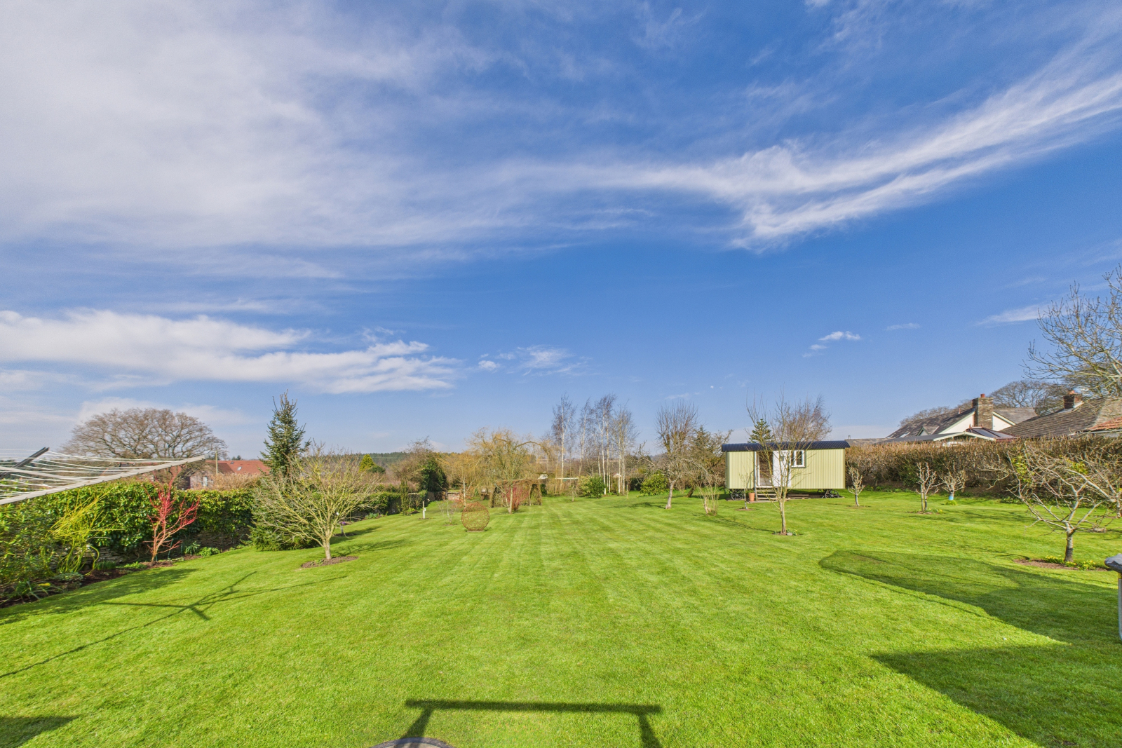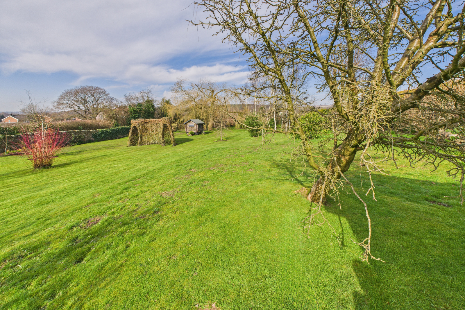 A true haven of natural beauty, the gardens surrounding this exquisite home have been thoughtfully designed to provide a perfect blend of serenity, functionality, and wonder. At the heart of this idyllic retreat lies a stunning wildflower meadow, bursting with vibrant colors and rich biodiversity, attracting bees, butterflies, and birds to create a flourishing ecosystem. Towering willow and birch trees add an ethereal charm, their sweeping branches dancing gracefully in the breeze, while a delightful log cabin offers a magical hideaway for children.