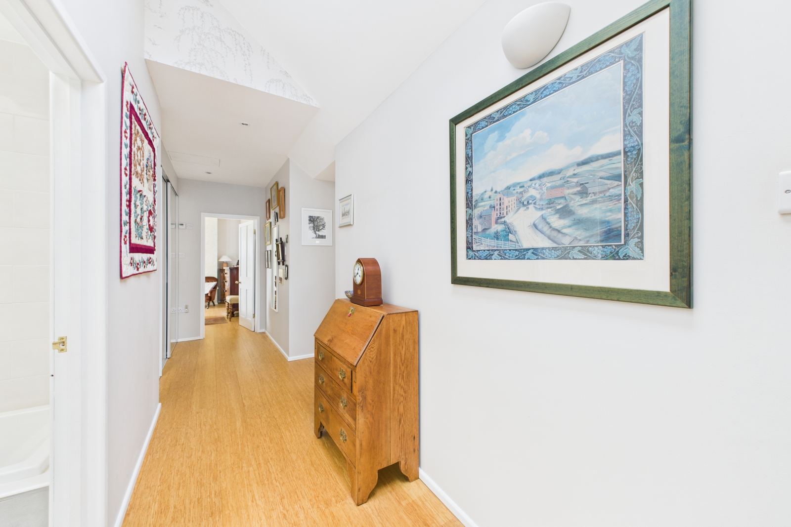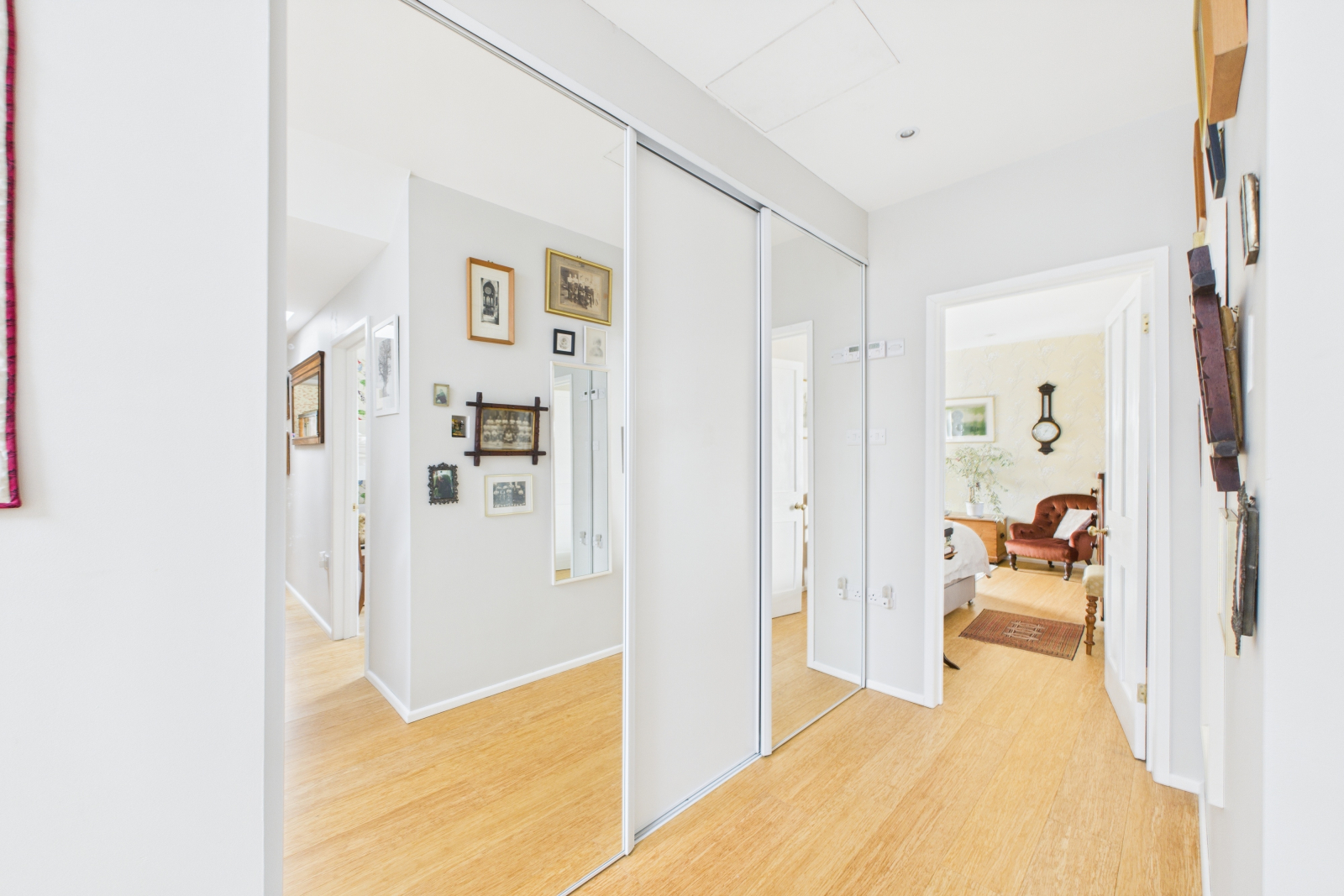 A breathtaking vantage point, the first-floor landing offers an enchanting UPVC picture window with sweeping views of open countryside and the meandering River Severn. The soaring vaulted ceiling, accentuated by two Velux windows, floods the space with natural light. Warm wooden heated flooring and a sleek glass balustrade elevate the space to a level of refined elegance. A large mirrored fitted wardrobe provides generous storage, complete with abundant shelving and hanging space. Spot lighting and ample power points complete this exceptional landing.