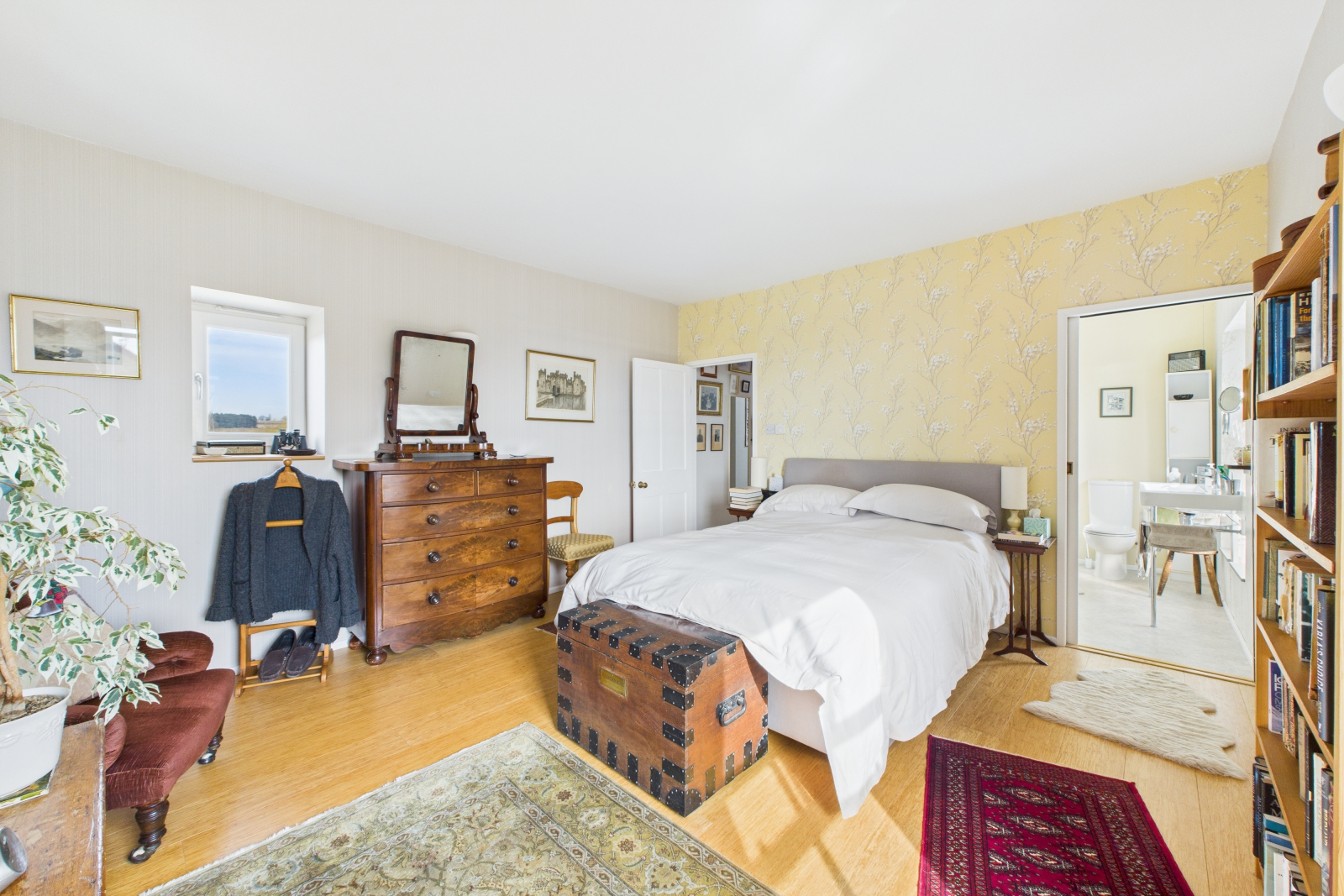 A breathtaking master suite, offering the perfect sanctuary with panoramic rural views stretching towards the River Severn and beyond. Two expansive UPVC double-glazed windows to the front and rear create a serene atmosphere filled with natural light. Rich wooden heated flooring and delightful alcoves add charm and character, while soft spot lighting and ambient wall lighting set the perfect tone. A range of power points provides convenience, and a private door leads to: