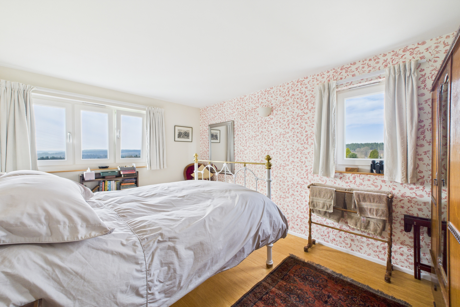 A peaceful and beautifully appointed bedroom, offering a UPVC double-glazed window to the side with a picturesque elevated outlook. The rich wooden heated flooring enhances the warmth of the space, while soft spot lighting and a range of power points add to the seamless blend of style and comfort.
