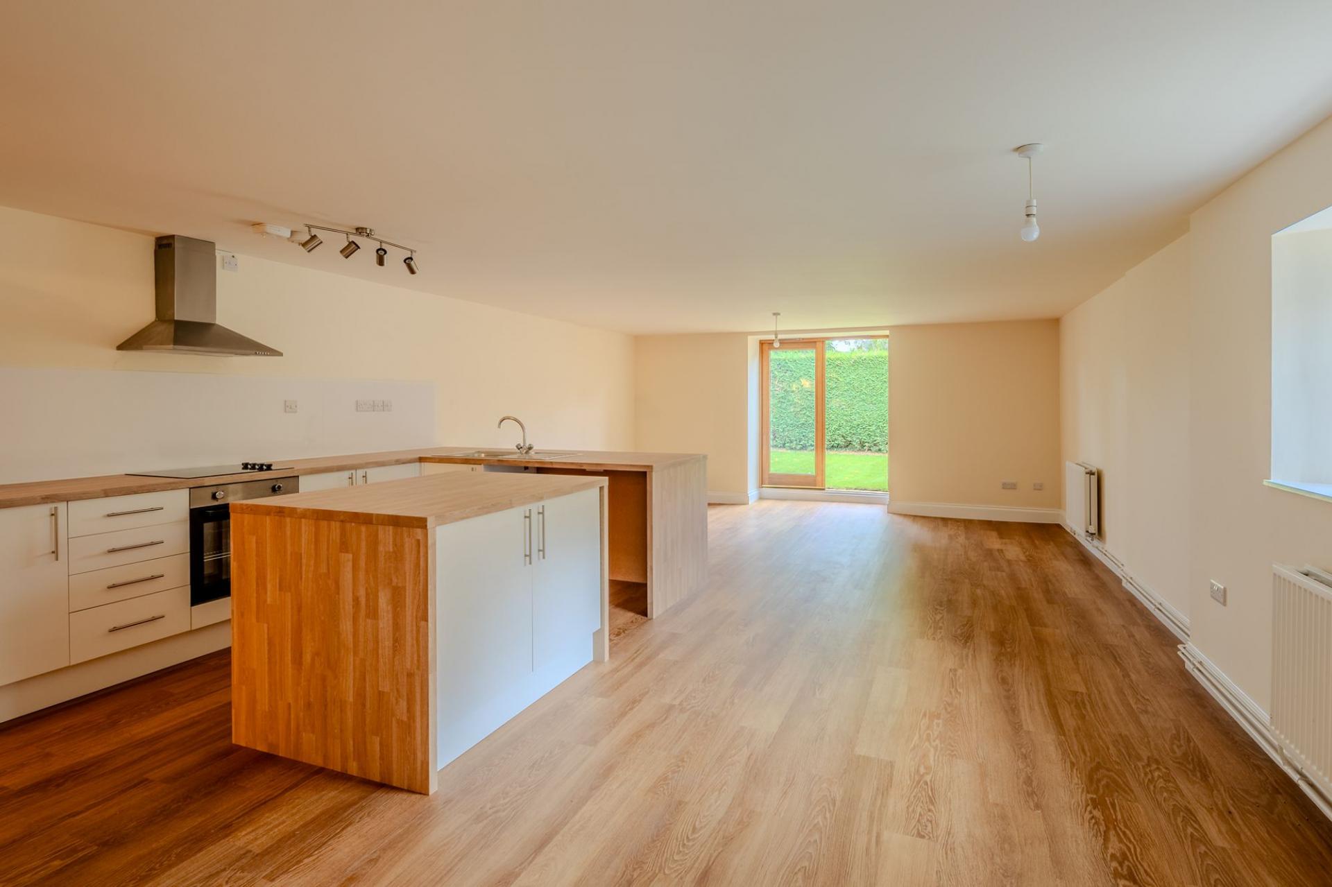 One of the beautifully presented ground floor two-bedroom maisonettes within the Exeter Farm Barns development offers a spacious and light-filled open-plan kitchen and living area. French doors open directly onto a private garden, creating a seamless indoor-outdoor flow and inviting natural light throughout the space. The layout is thoughtfully designed, featuring two exceptionally large bedrooms or flexible use as a home office or guest room. A well-appointed main bathroom complements the home, while the kitchen/dining area provides ample storage and generous space for entertaining.