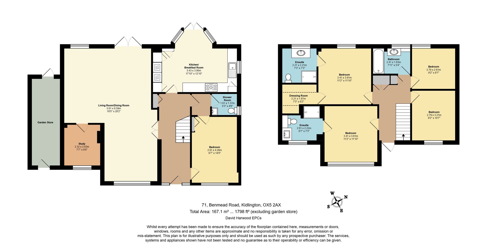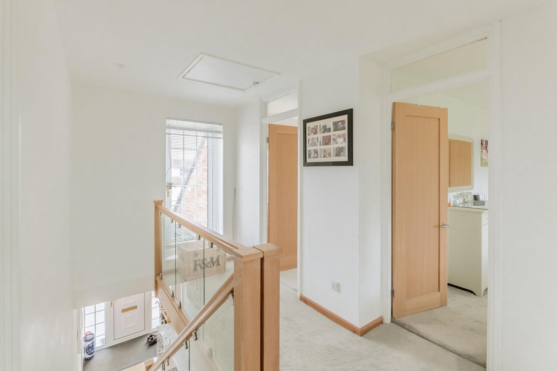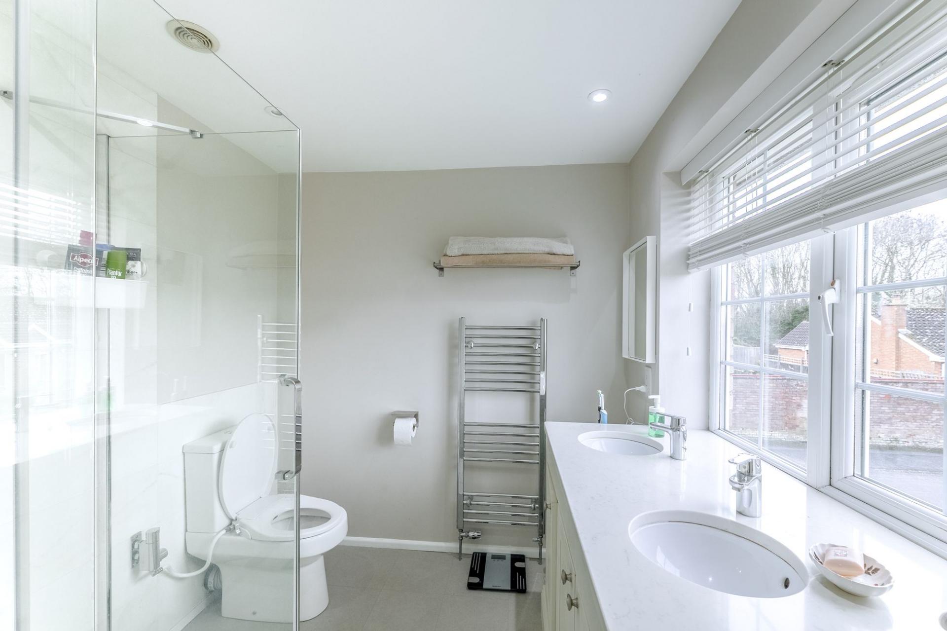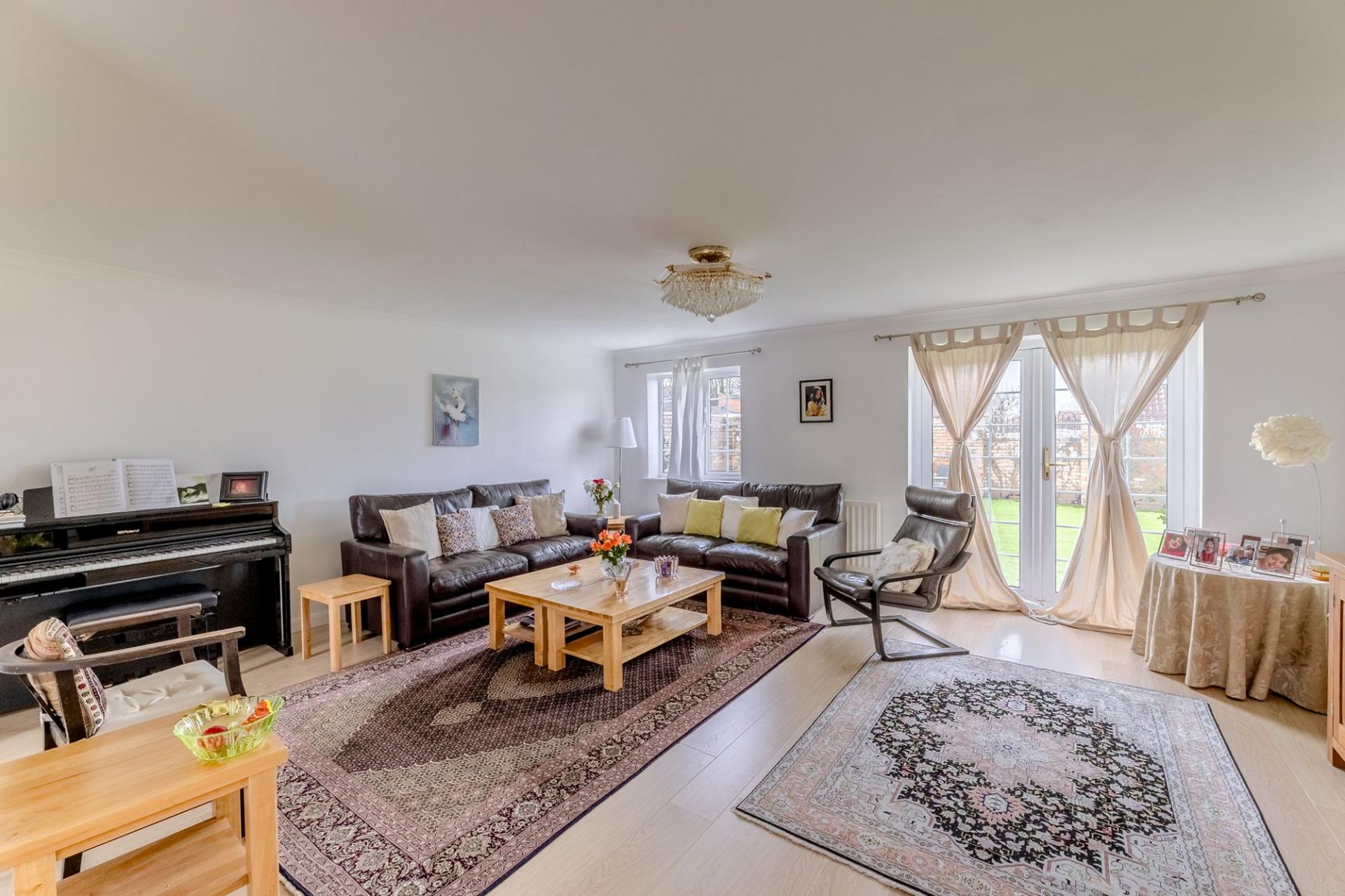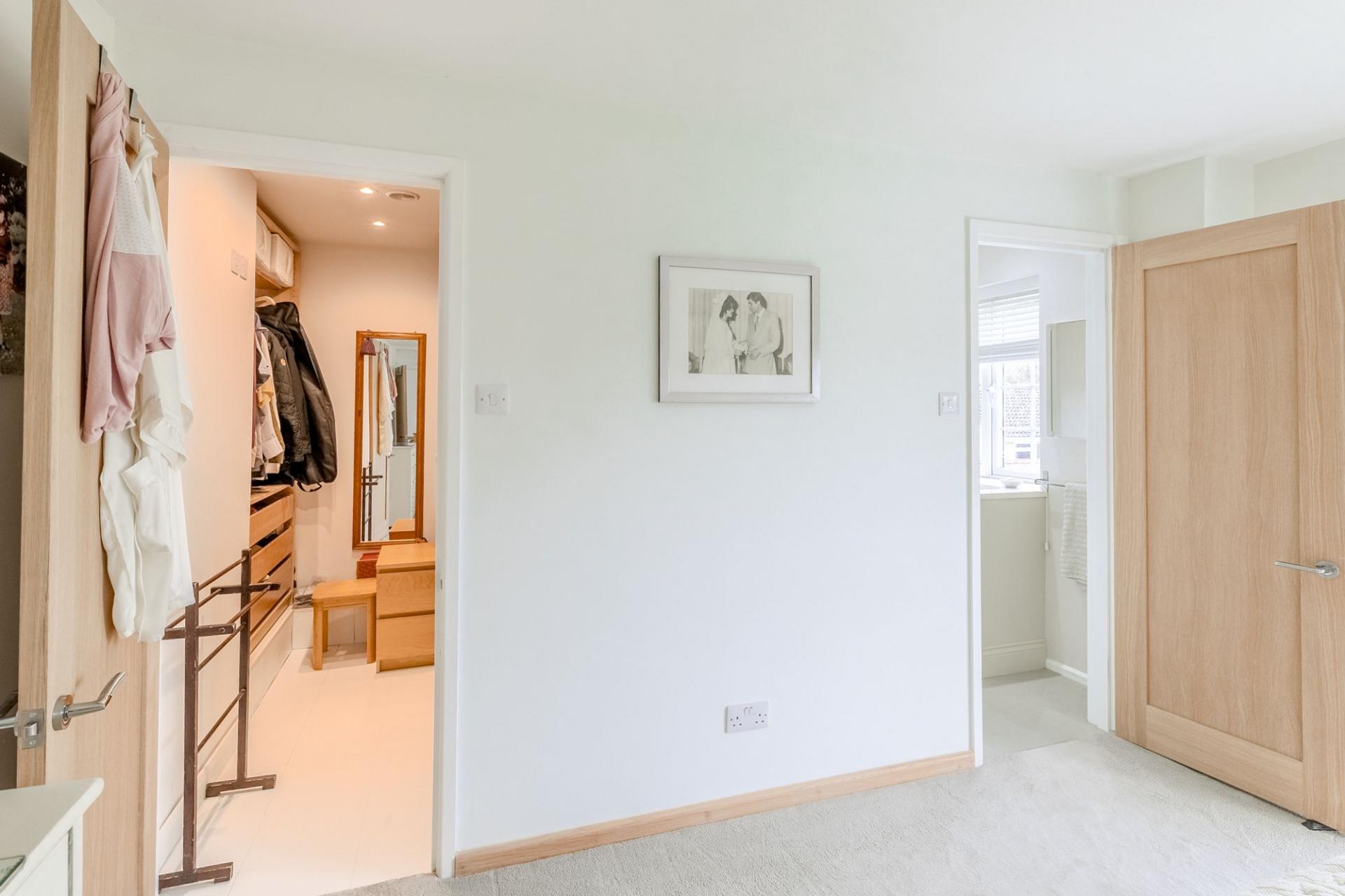 Upstairs, the home offers four generously sized double bedrooms and a family bathroom. Two of the bedrooms enjoy their own en‑suite bathrooms, while the main bedroom further benefits from a walk‑in dressing room, adding a luxurious touch rarely found in similar homes.