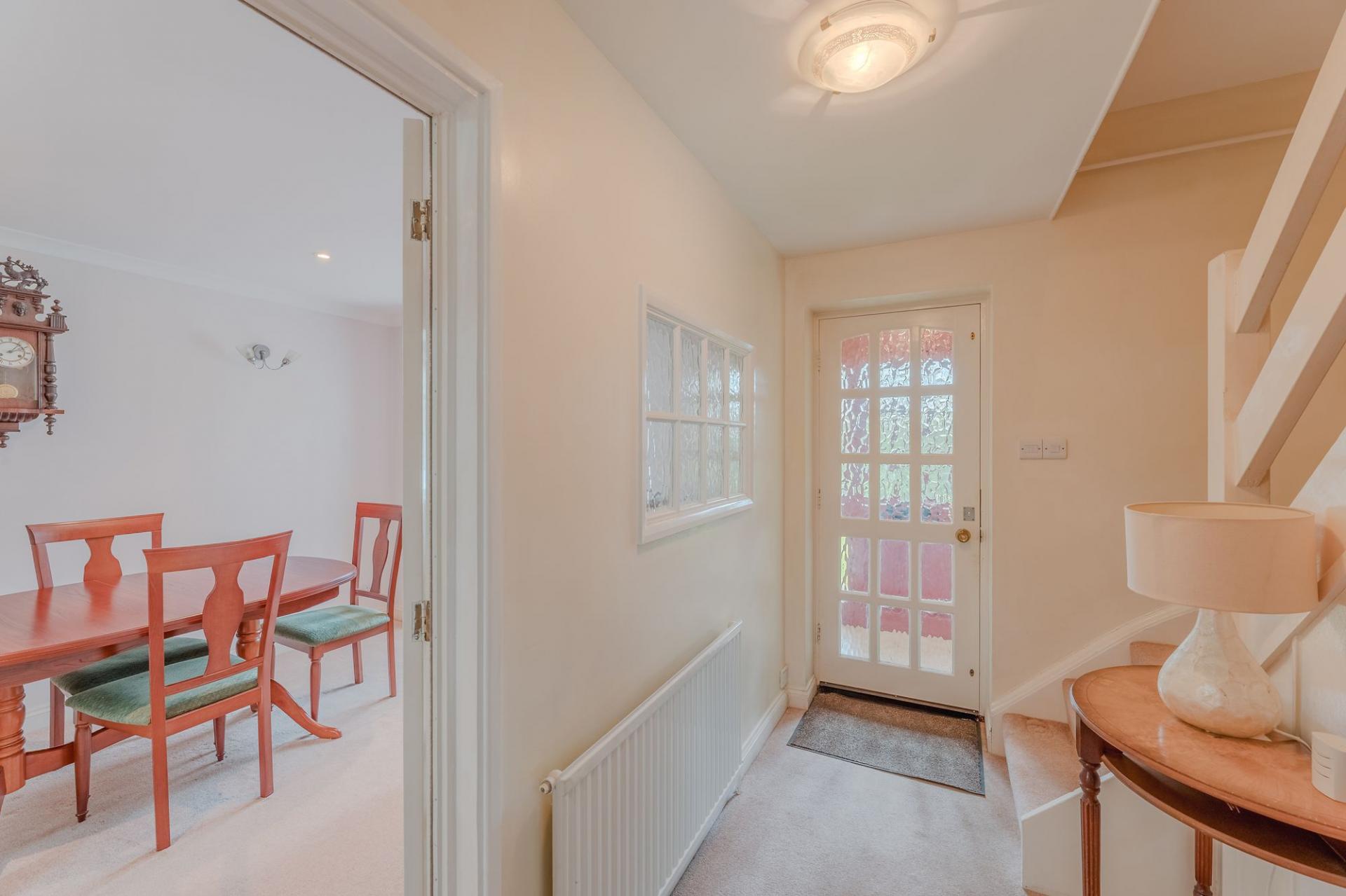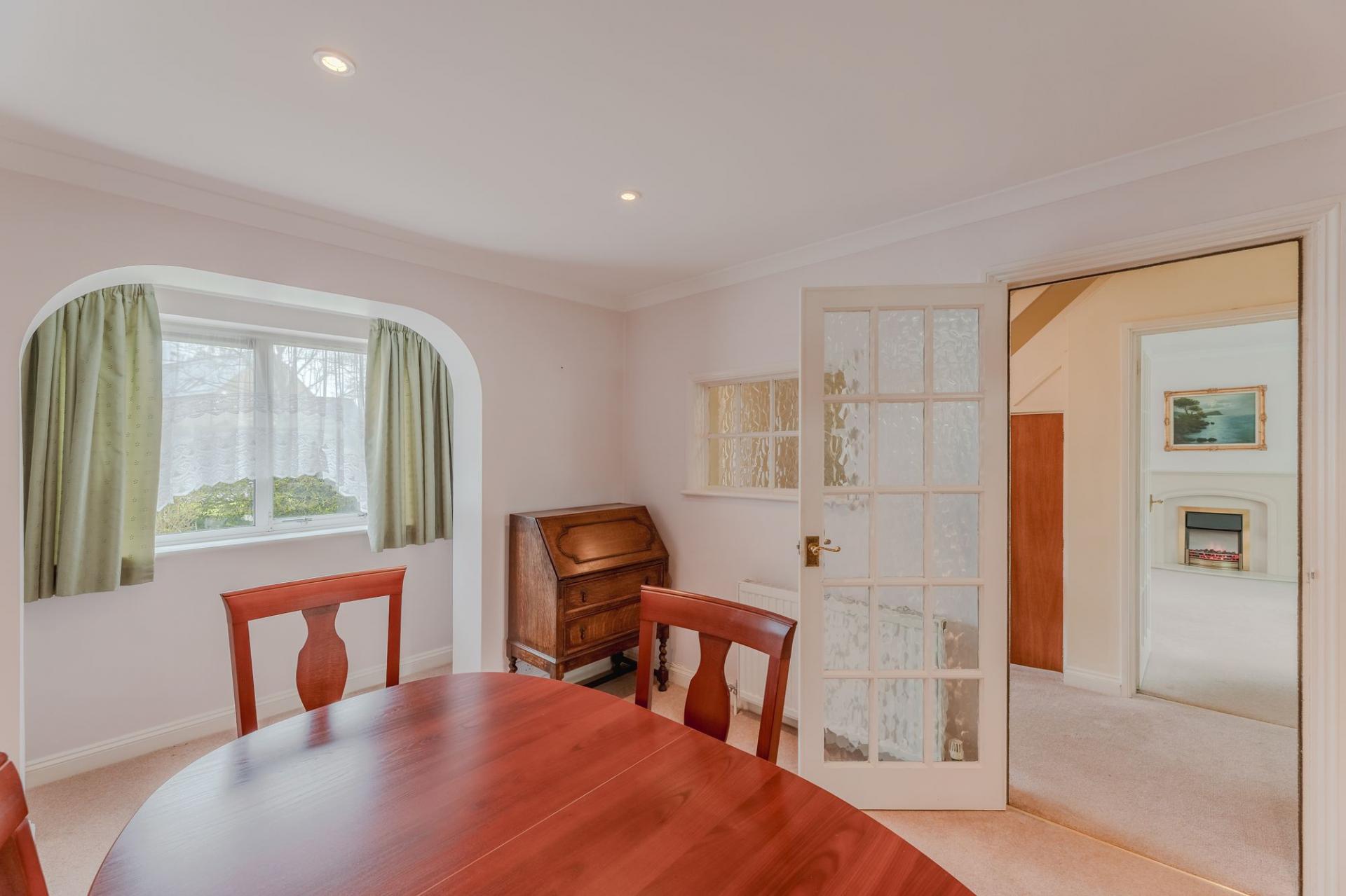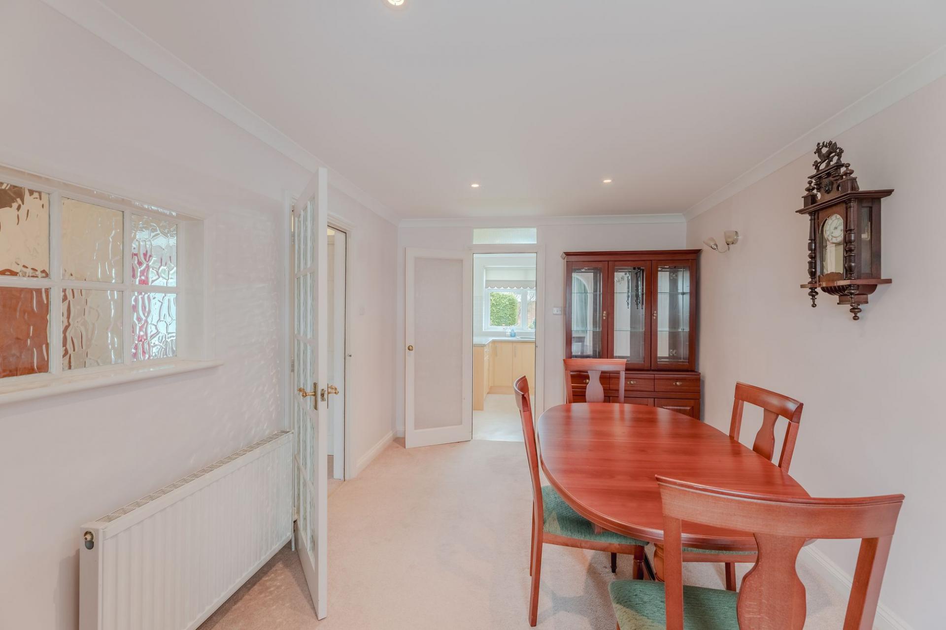 To the left, the separate living room is a bright and inviting space, featuring a large bay window, an electric fire perfect for cosy winter evenings and sliding patio doors opening directly onto the rear garden. On the opposite side of the house, the generous dining room provides an excellent setting for entertaining, while the kitchen sits to the rear overlooking the garden. The kitchen offers ample storage, space for an additional dining table and convenient internal access to the garage.