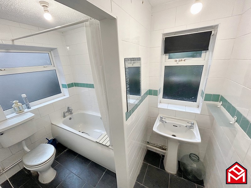 uPVC double glazed window. 3 piece suite comprising low level w.c, pedestal hand wash basin and panelled bath with overhead electric shower. Fully tiled walls. Tiled floor. Radiator.