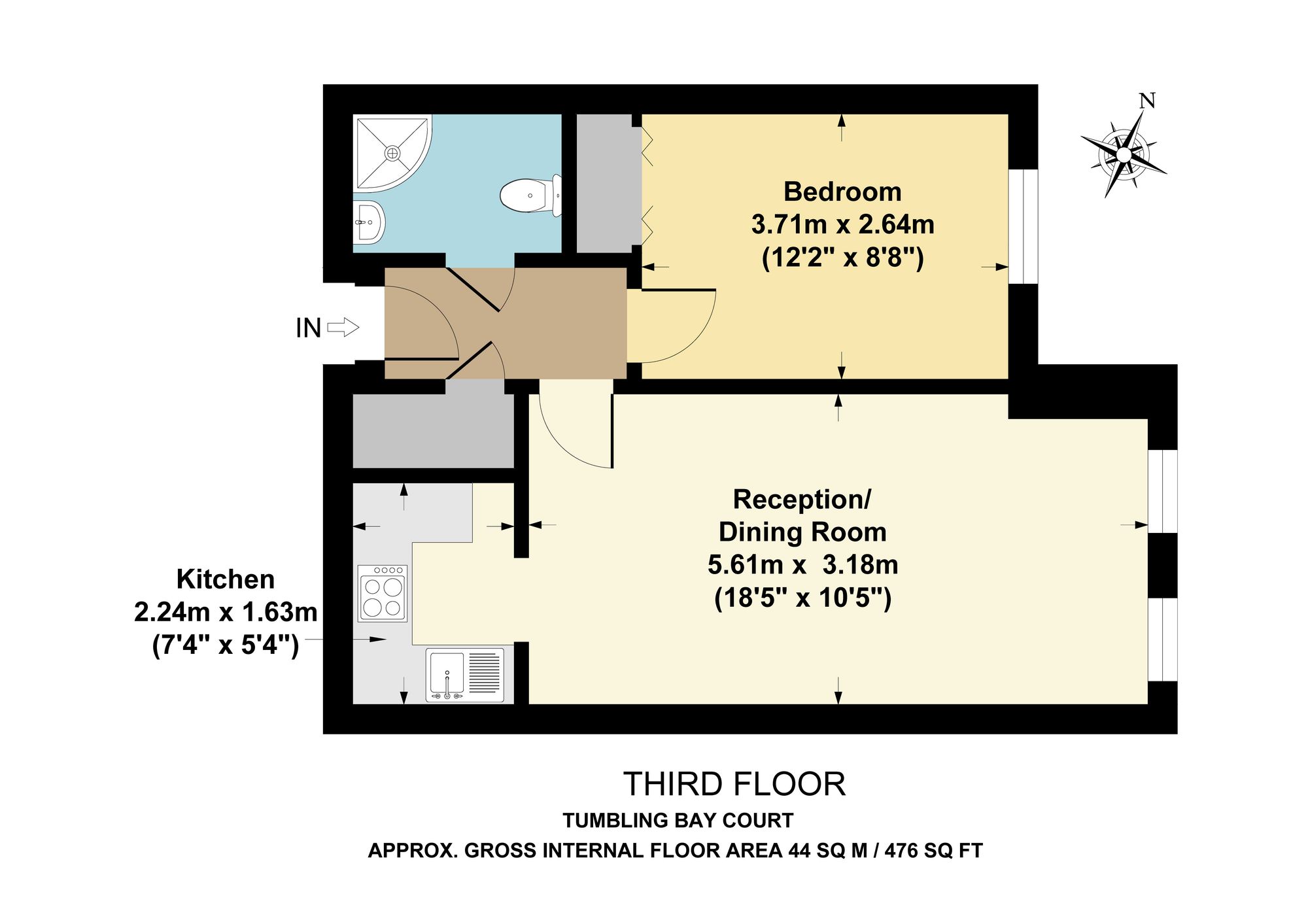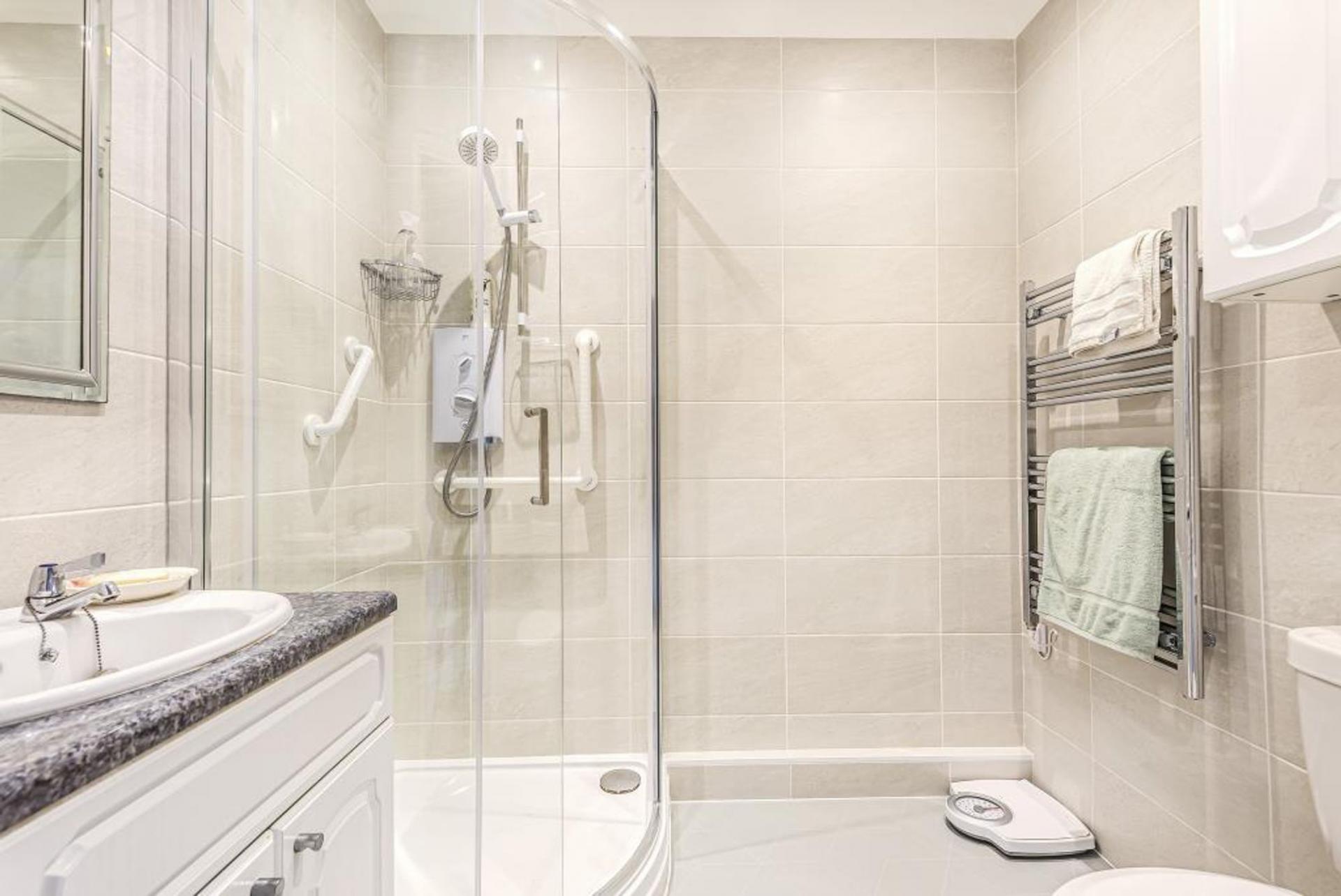 The tranquil bedroom continues the theme of brightness and comfort, with a generous window providing abundant natural light. Soft carpet flooring and modern décor offer a cosy retreat, while practical built-in storage ensures an organised and clutter-free environment. The contemporary bathroom is a standout feature, boasting a sleek walk-in shower with glass doors and safety handles, complemented by a heated towel rail and elegant tiling for a touch of luxury.