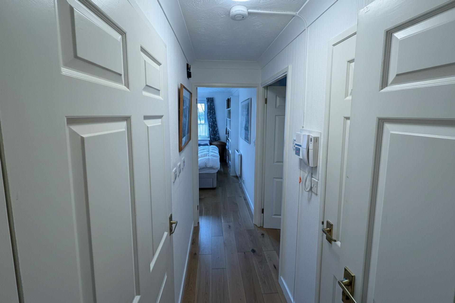The bedroom continues the theme of comfort, featuring elegant hard oak wood flooring, neutral décor, and practical built-in storage to maintain an organised, clutter-free space. The reception hallway also boasts matching oak flooring, adding a cohesive and sophisticated touch throughout the home. The contemporary bathroom is thoughtfully designed, featuring a full-sized walk-in shower, modern tiling, and a heated towel rail, providing a serene environment for daily living.