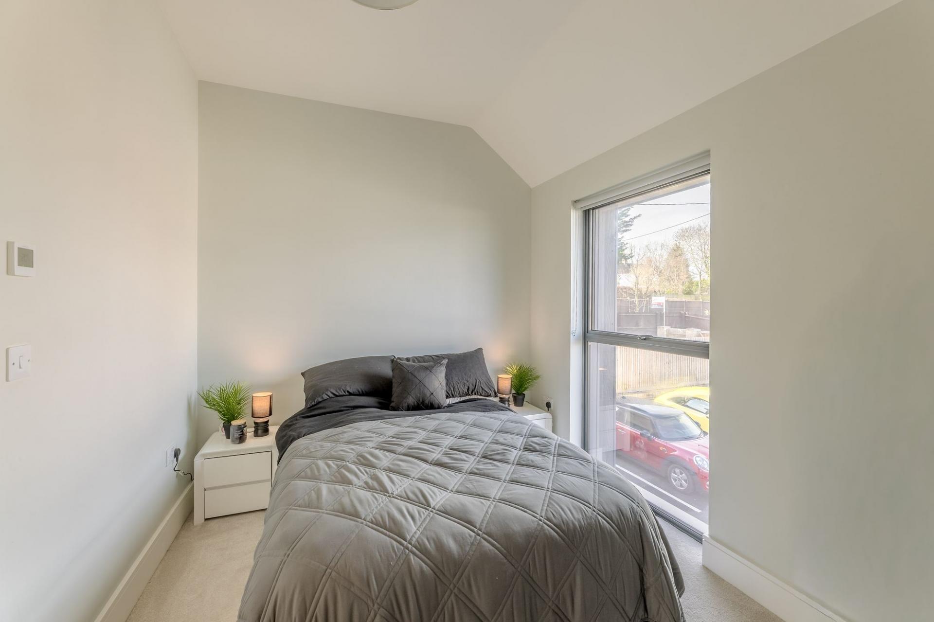 Stylish apartment in a private cul-de-sac near Oxford city centre. Two double bedrooms with en-suites, open-plan living, modern kitchen, balcony, communal gardens, and parking.