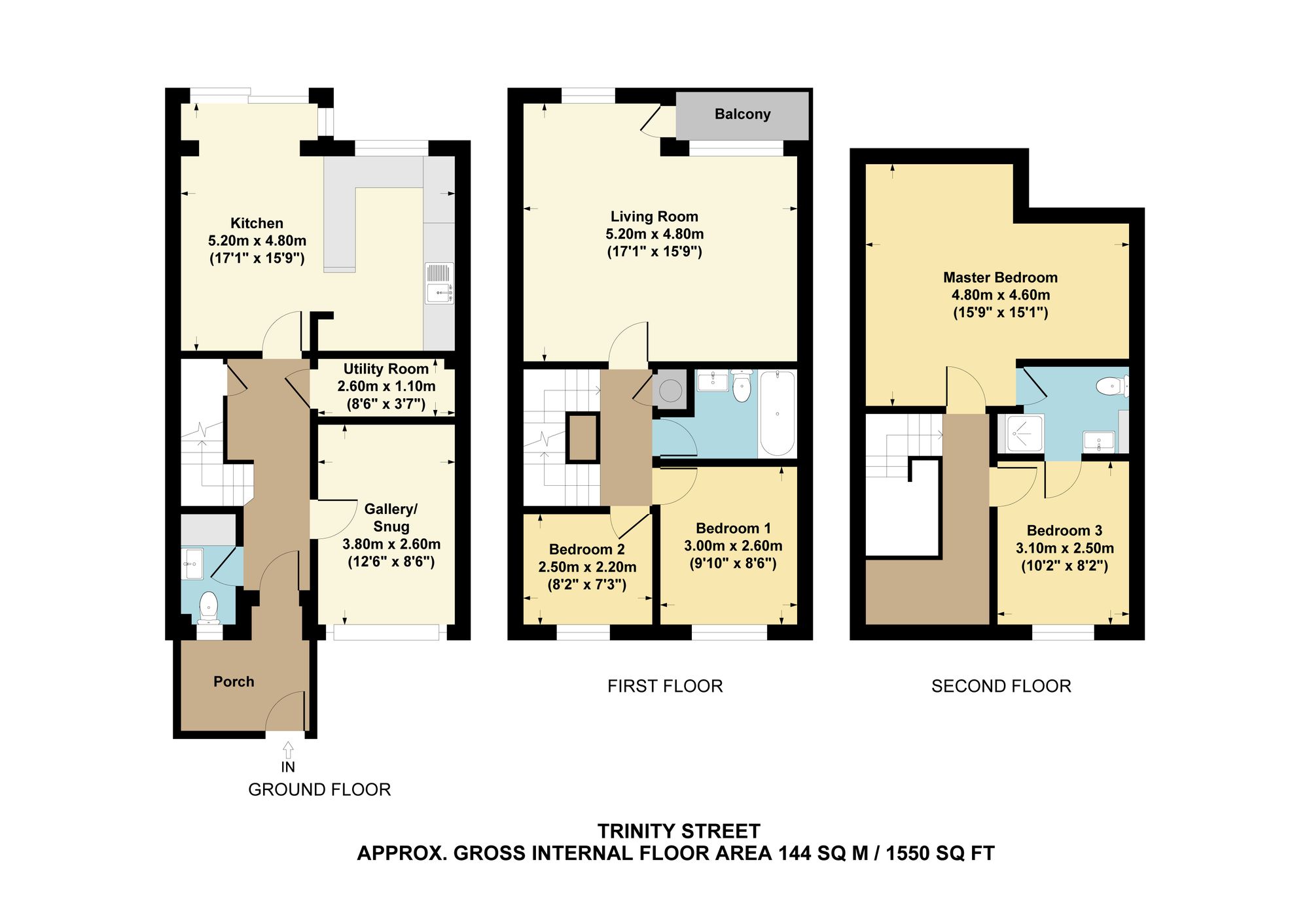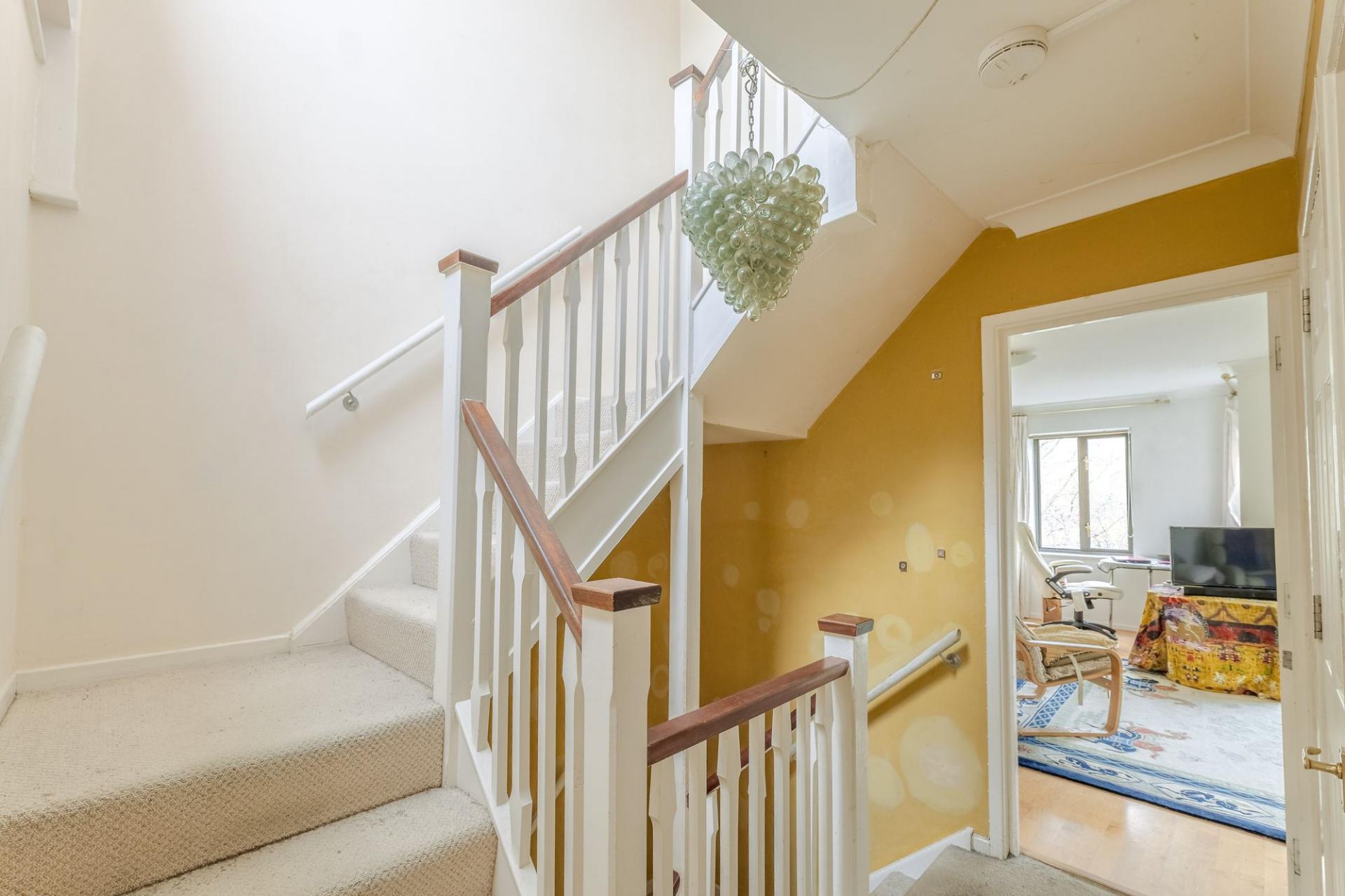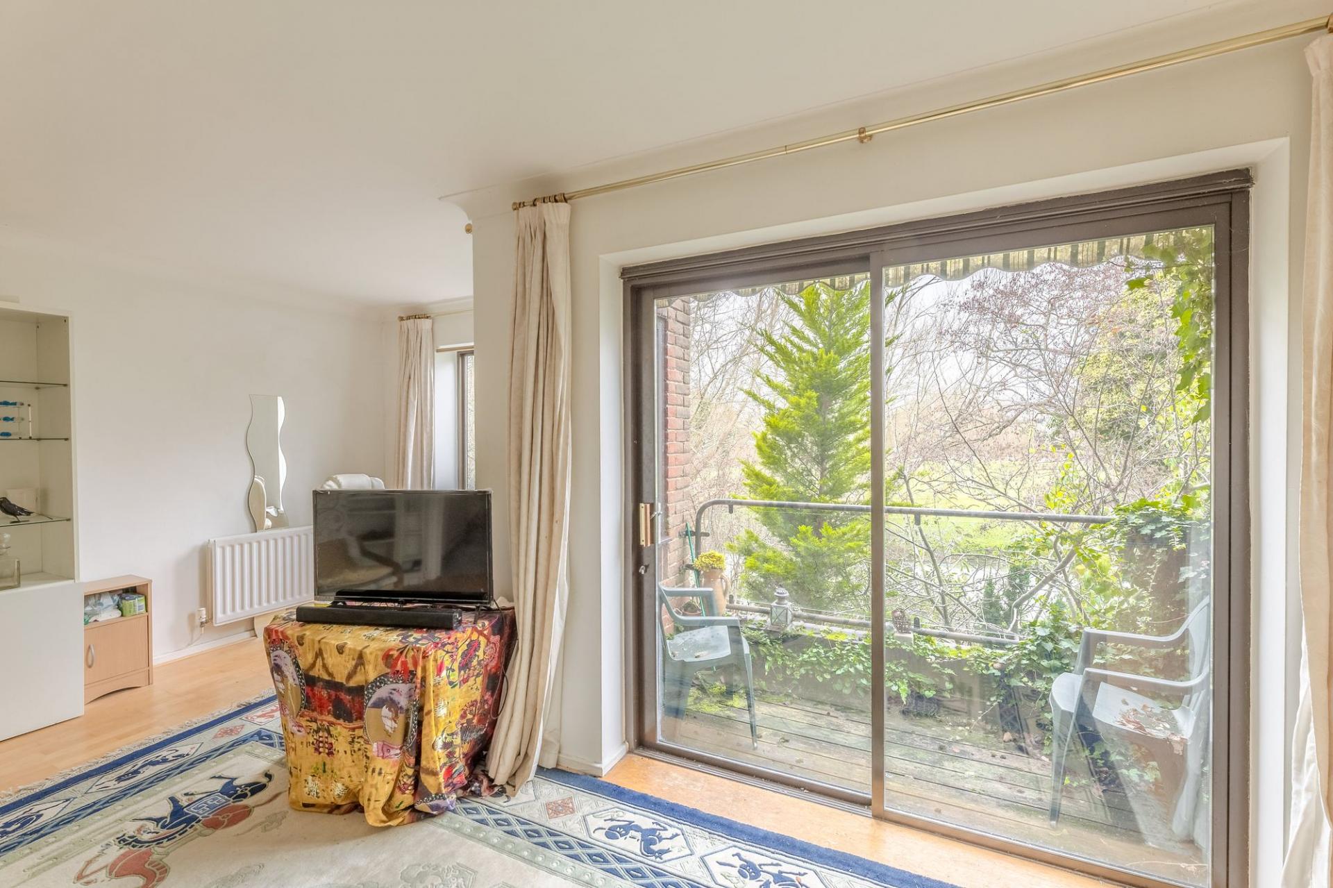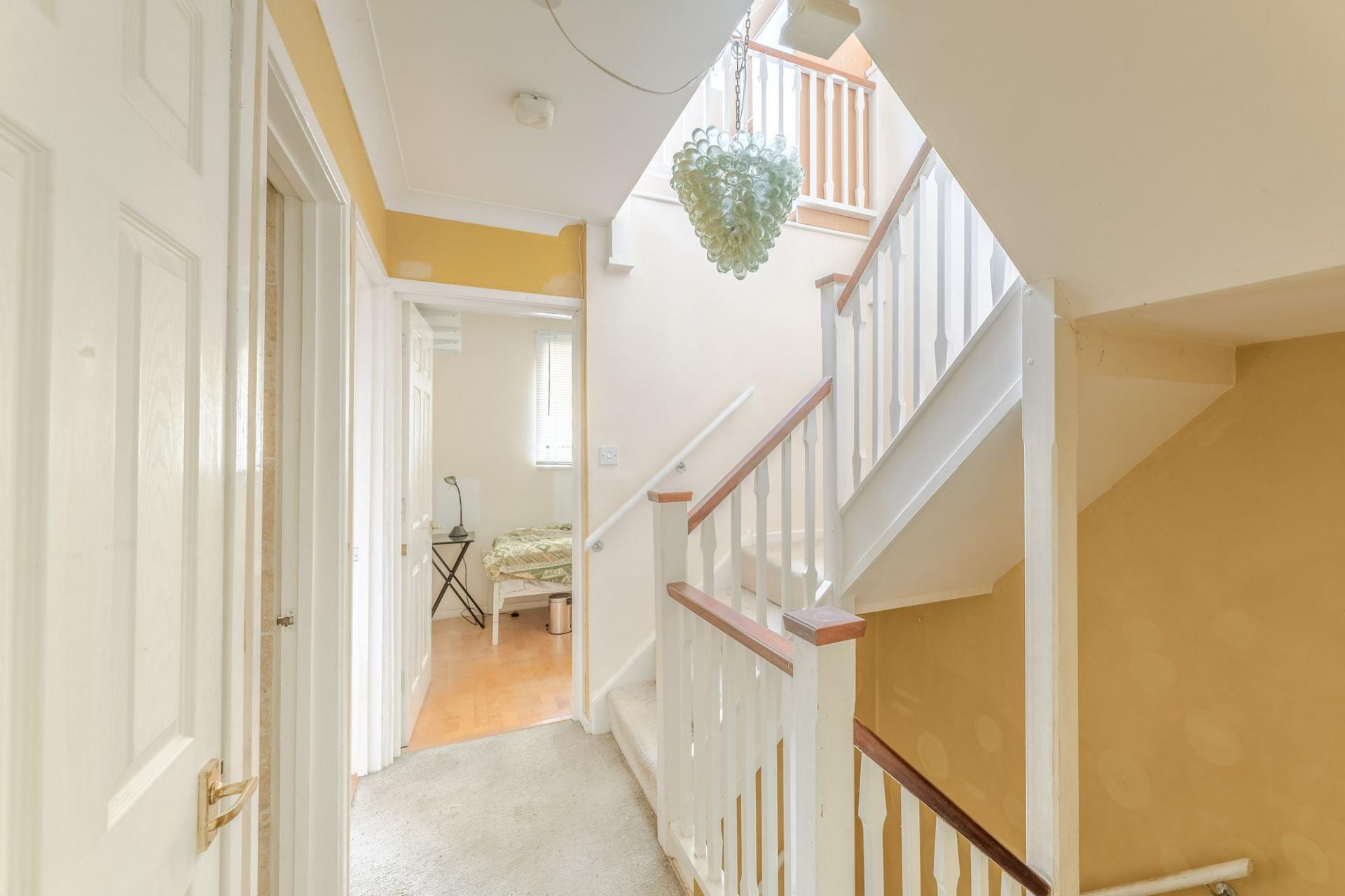 Upstairs on the first floor, you’ll find two east-facing bedrooms with views over a quiet green, a family bathroom and a large living room that spans the width of the house. Step out onto the balcony and enjoy stunning views across Jubilee Meadow and the Millstream; an outlook that’s ever-changing with the seasons.