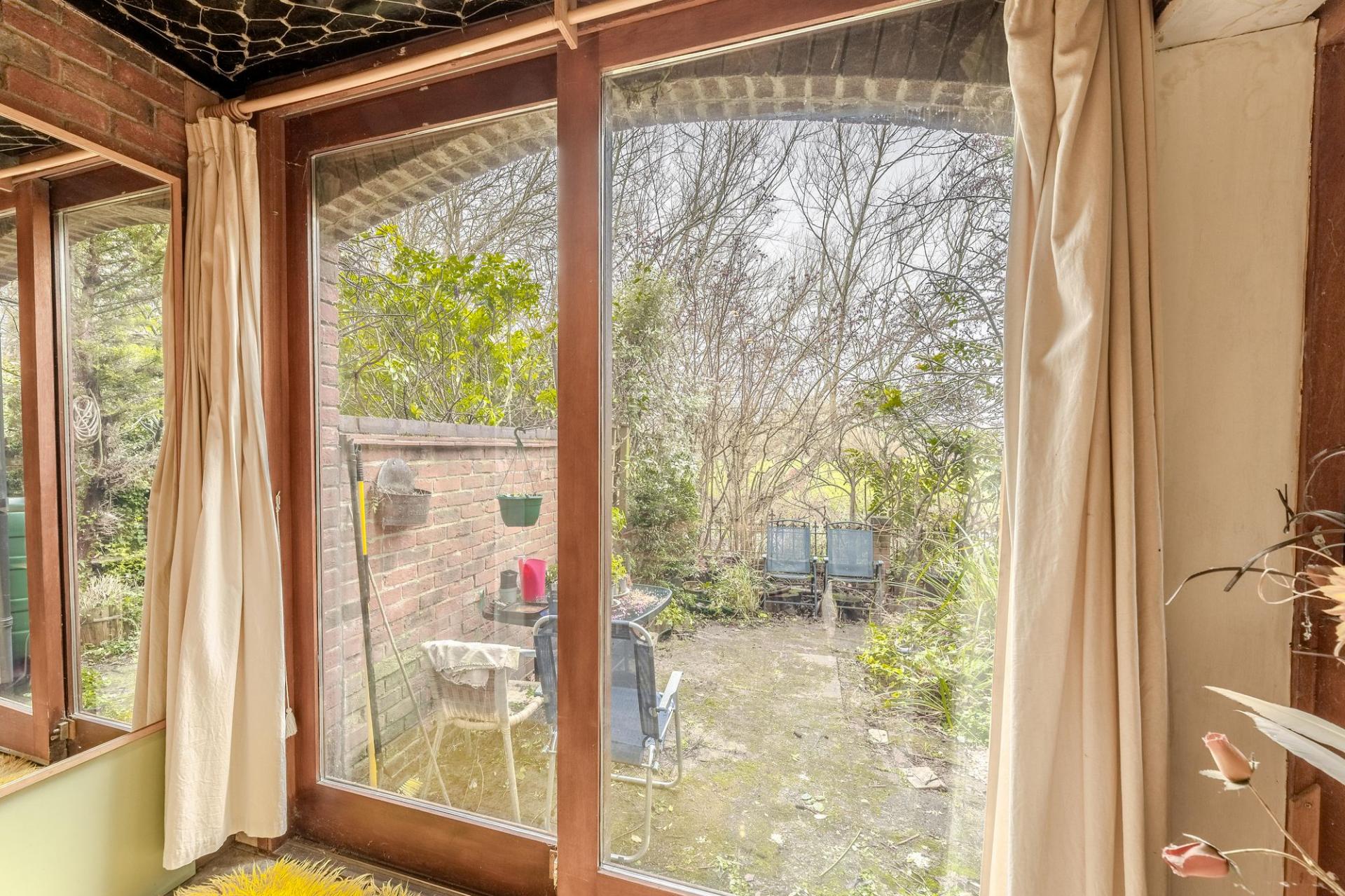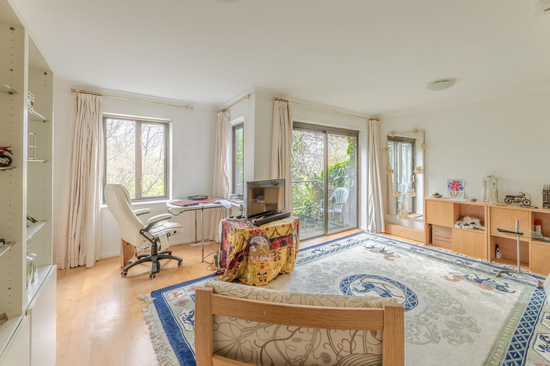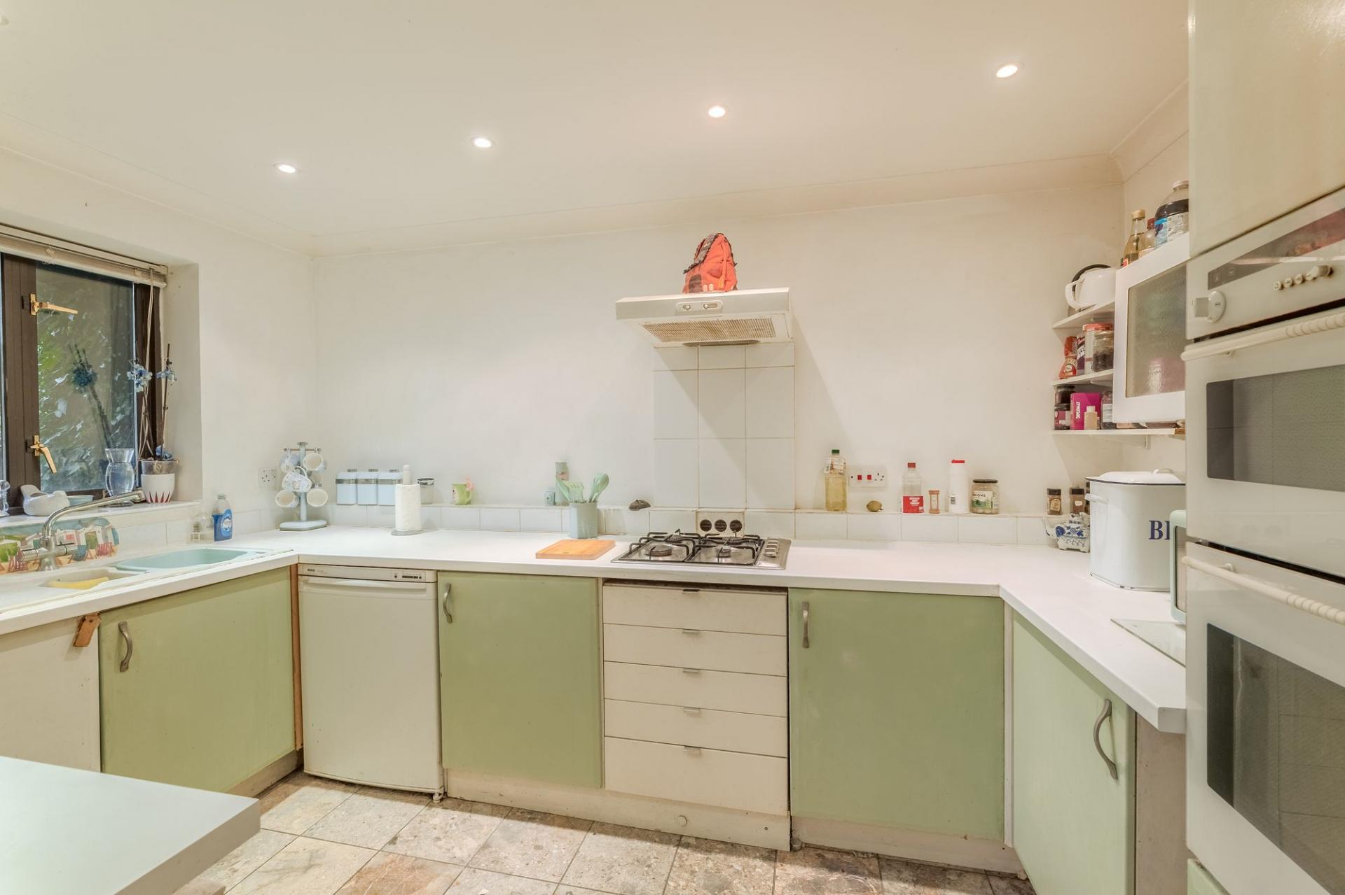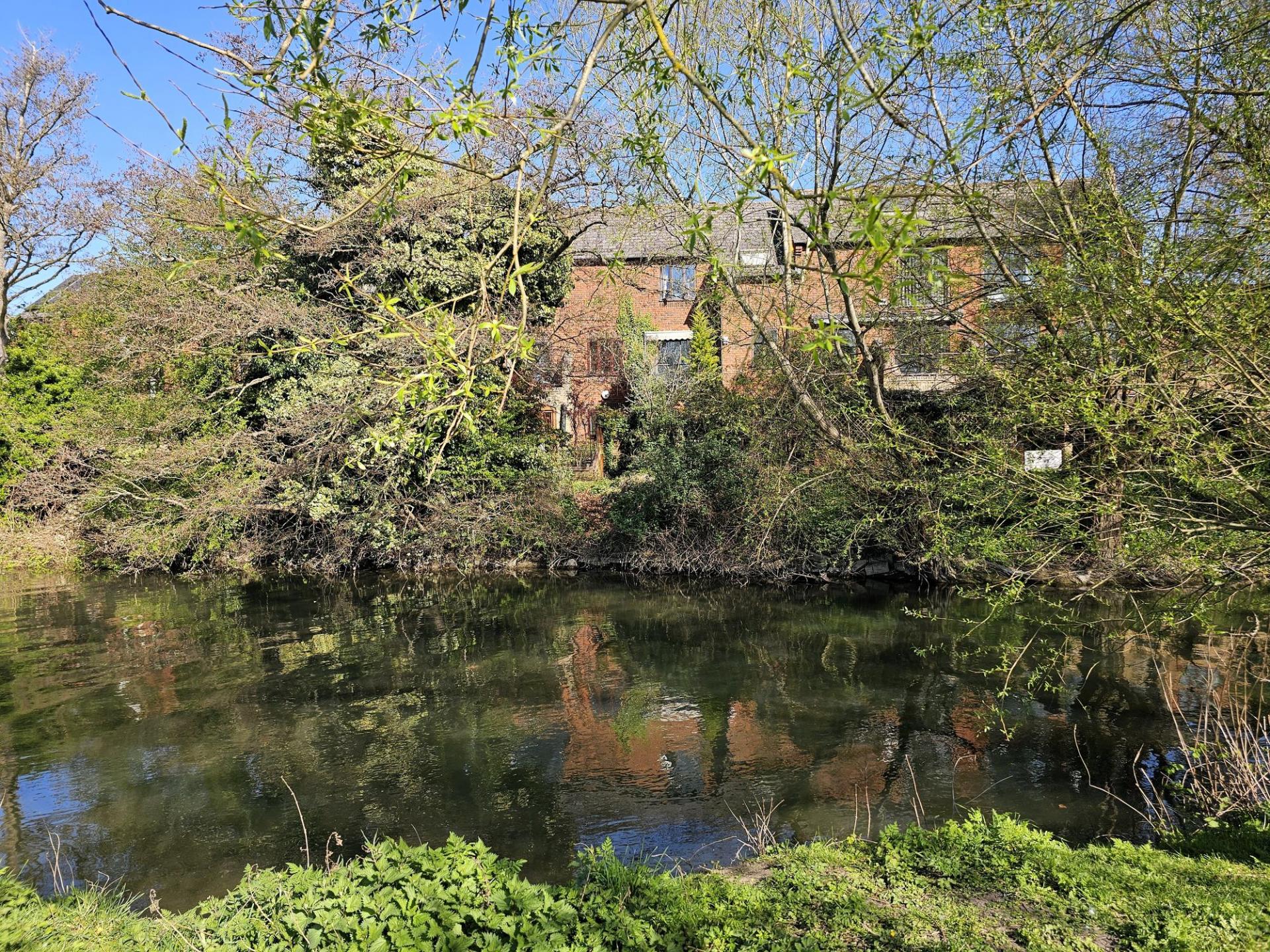 At the back of the house, the open-plan kitchen and dining room is light-filled and welcoming. Large sliding doors lead out to a west-facing walled garden with a pond, an apple tree and a private gate onto the Millstream footpath. With the potential to add a pontoon, this space is both peaceful and full of possibility.