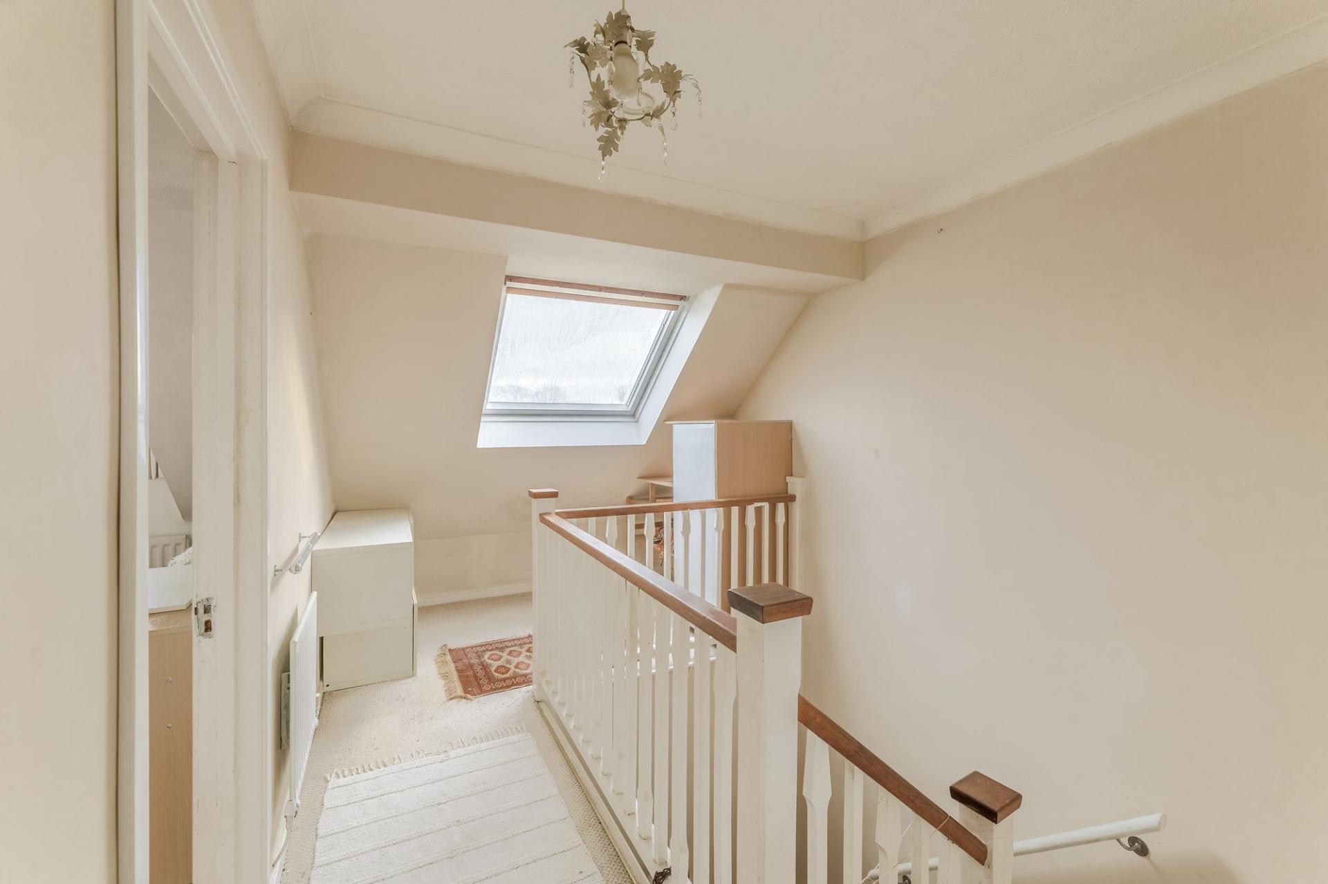The top floor is home to two more bedrooms, including the principal suite. This spacious retreat includes a built-in wardrobe, a private work nook and a generous ensuite with shower, bidet and access to a large loft space. The loft has full headroom and the potential to be converted, just as other homes in the row have done, creating a fantastic elevated room with panoramic views over the meadow.